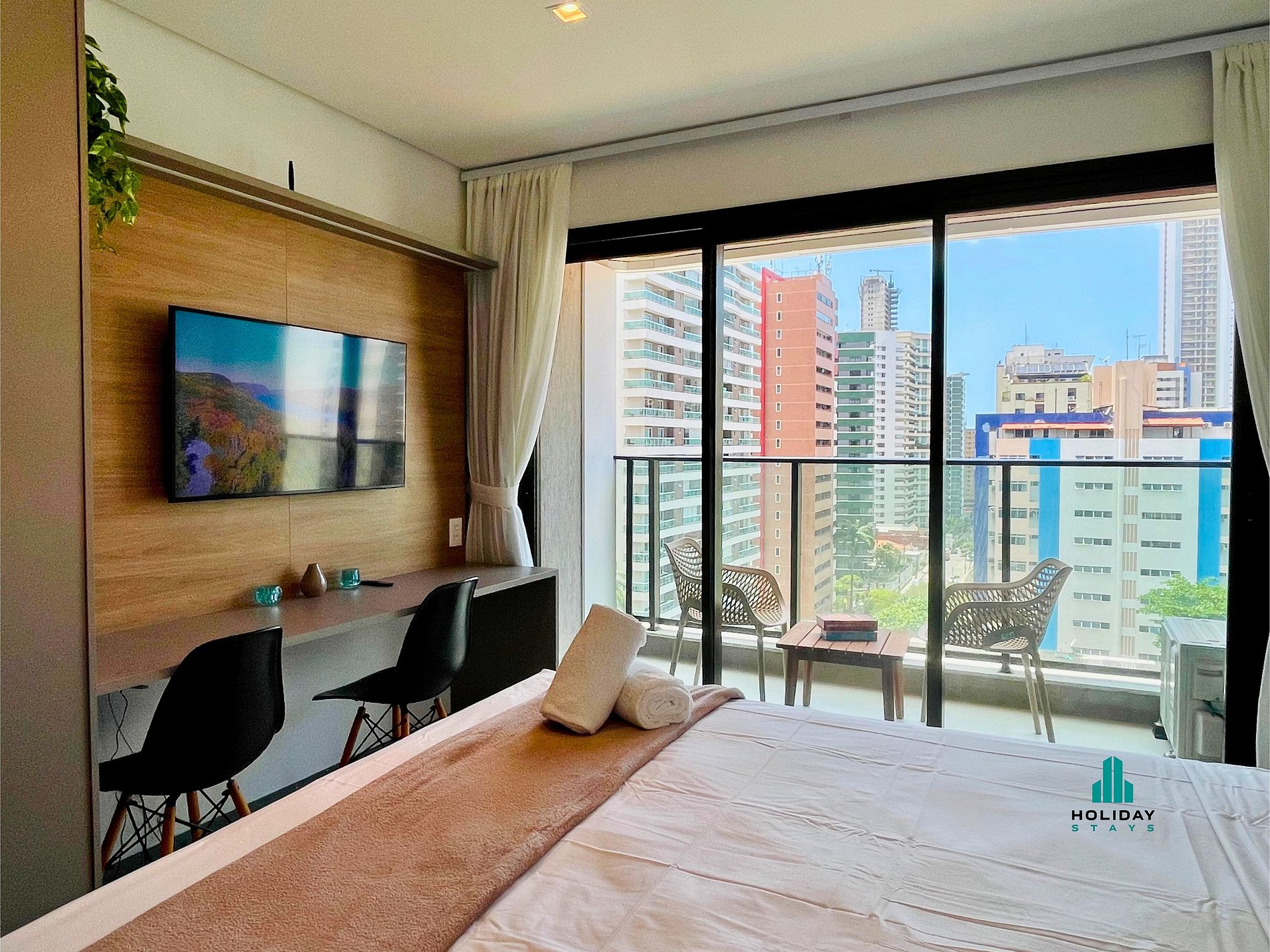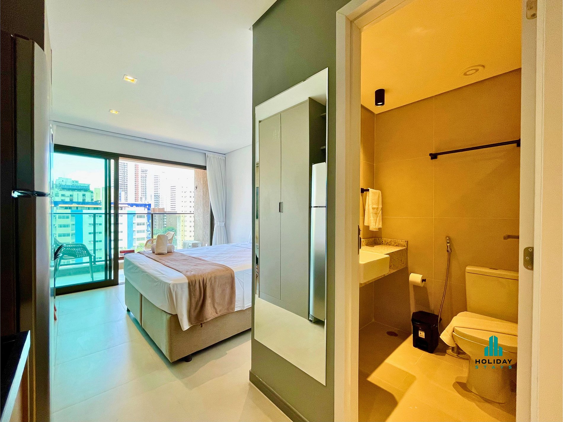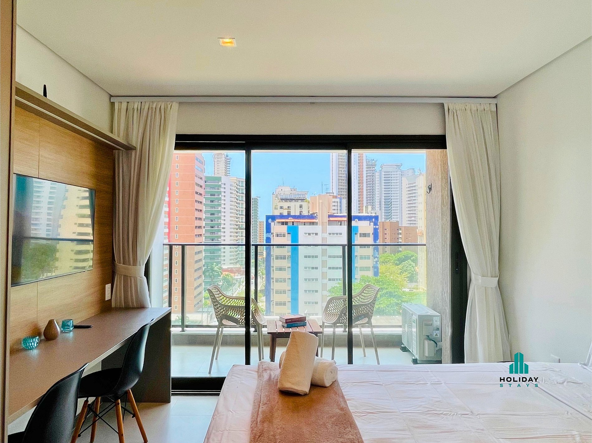 Studio compacto, moderno e super funcional com varanda. Acomoda até 3 pessoas. Conta com cozinha completa e está em edifício com área de lazer completa, no coração do Meireles – o bairro mais desejado de Fortaleza. Ideal para casais, famílias ou viagens a trabalho.