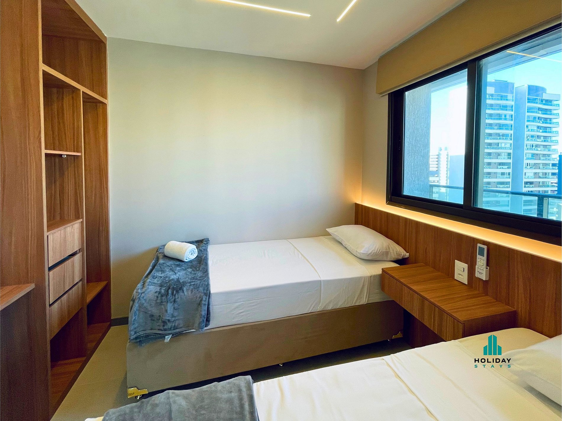 Elegante apartamento com sala aconchegante, sofá-cama, smart TV de 58”, cozinha completa e área de jantar para 4 pessoas. Varanda ampla com vista para a cidade, mesa e cadeiras. Possui dois quartos: um com cama casal, TV, ar-condicionado e guarda-roupa; outro com duas camas de solteiro, ar-condicionado e guarda-roupa. Dois banheiros com água quente e secador de cabelo.