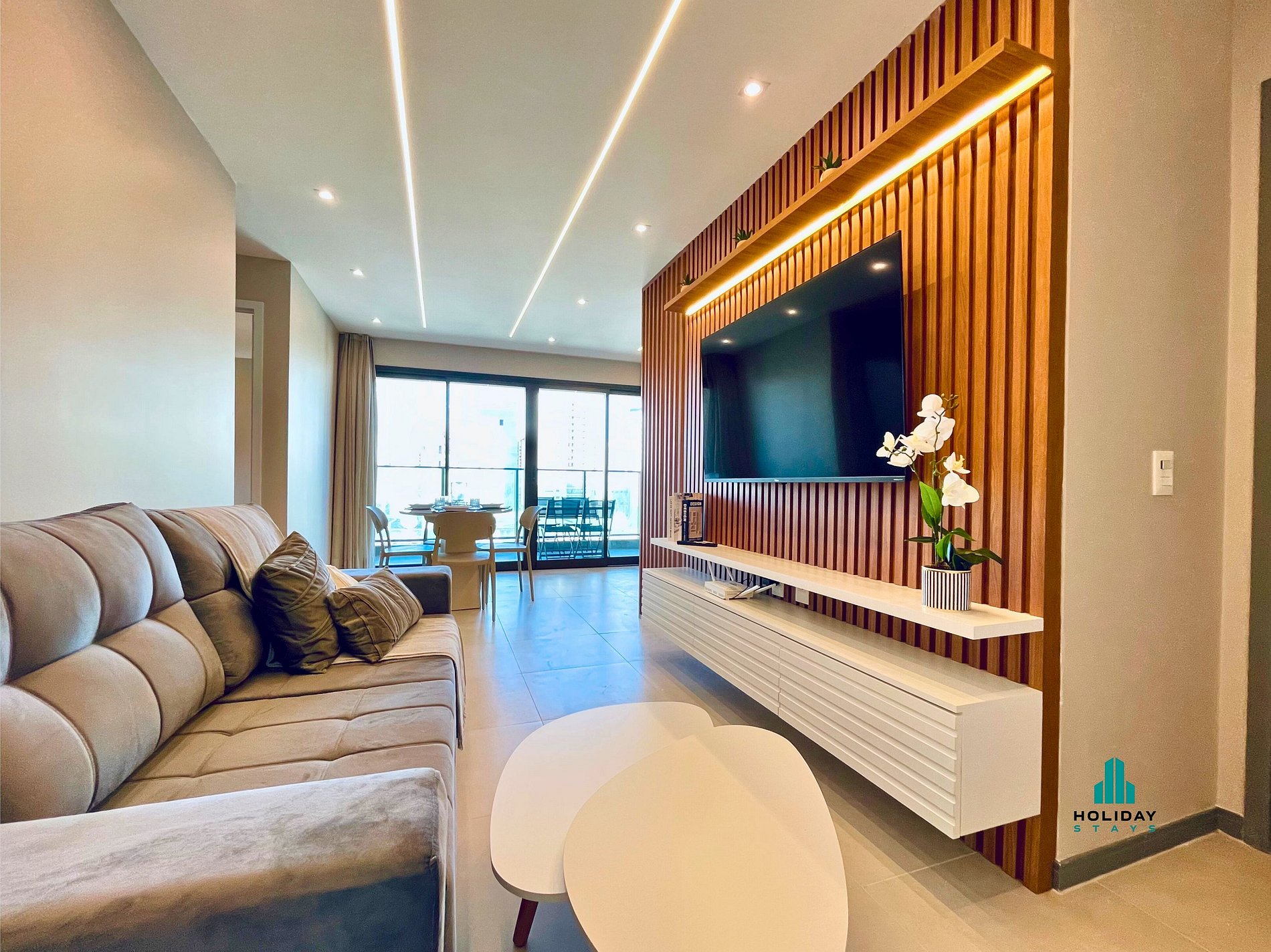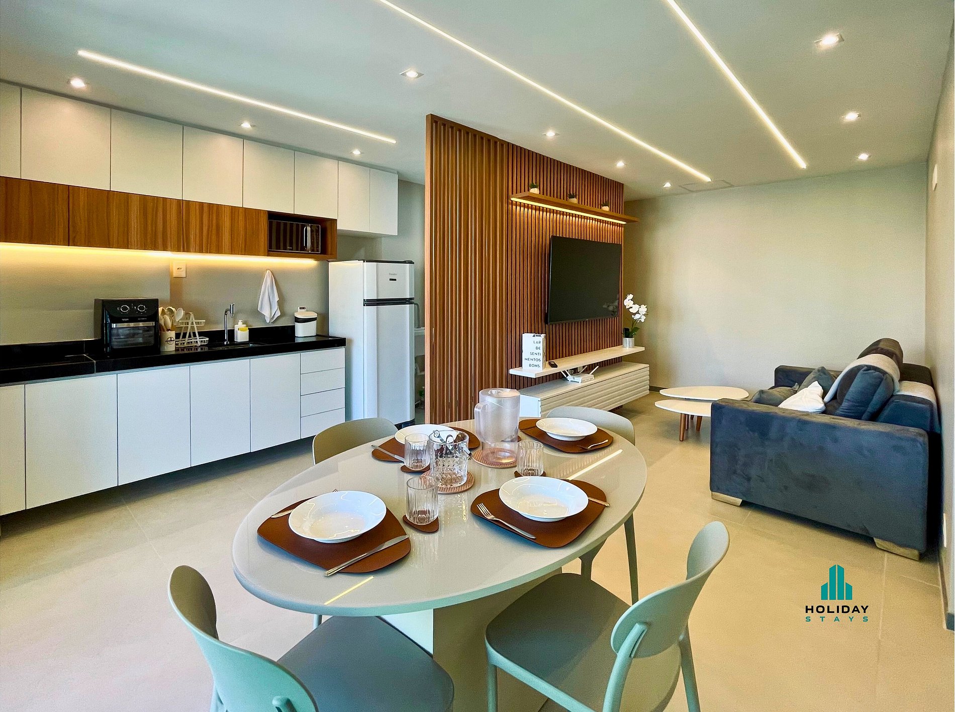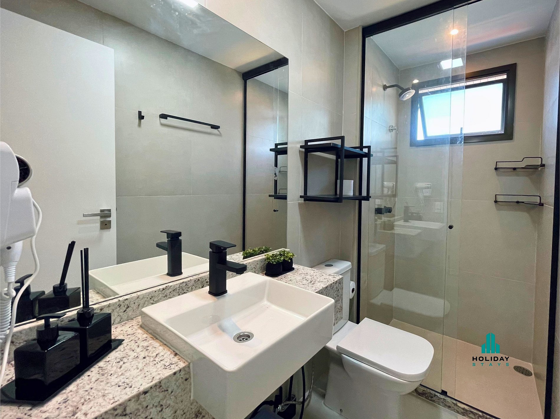 Elegante apartamento com sala aconchegante, sofá-cama, smart TV de 58”, cozinha completa e área de jantar para 4 pessoas. Varanda ampla com vista para a cidade, mesa e cadeiras. Possui dois quartos: um com cama casal, TV, ar-condicionado e guarda-roupa; outro com duas camas de solteiro, ar-condicionado e guarda-roupa. Dois banheiros com água quente e secador de cabelo.