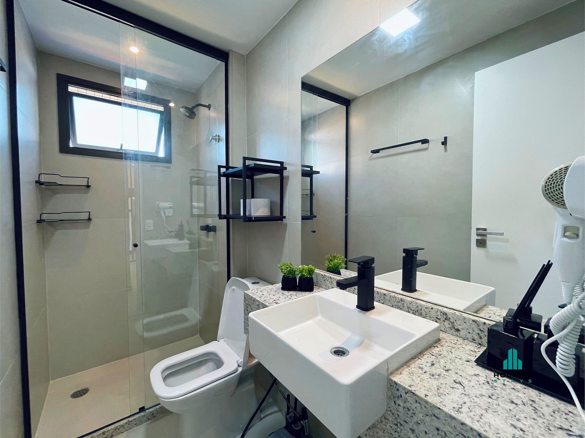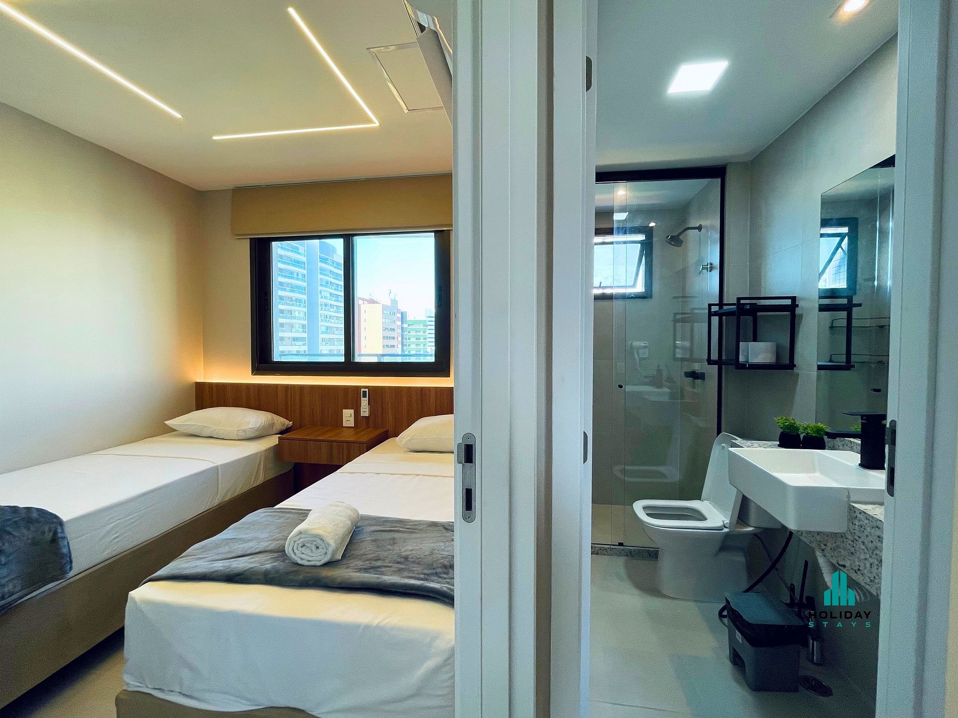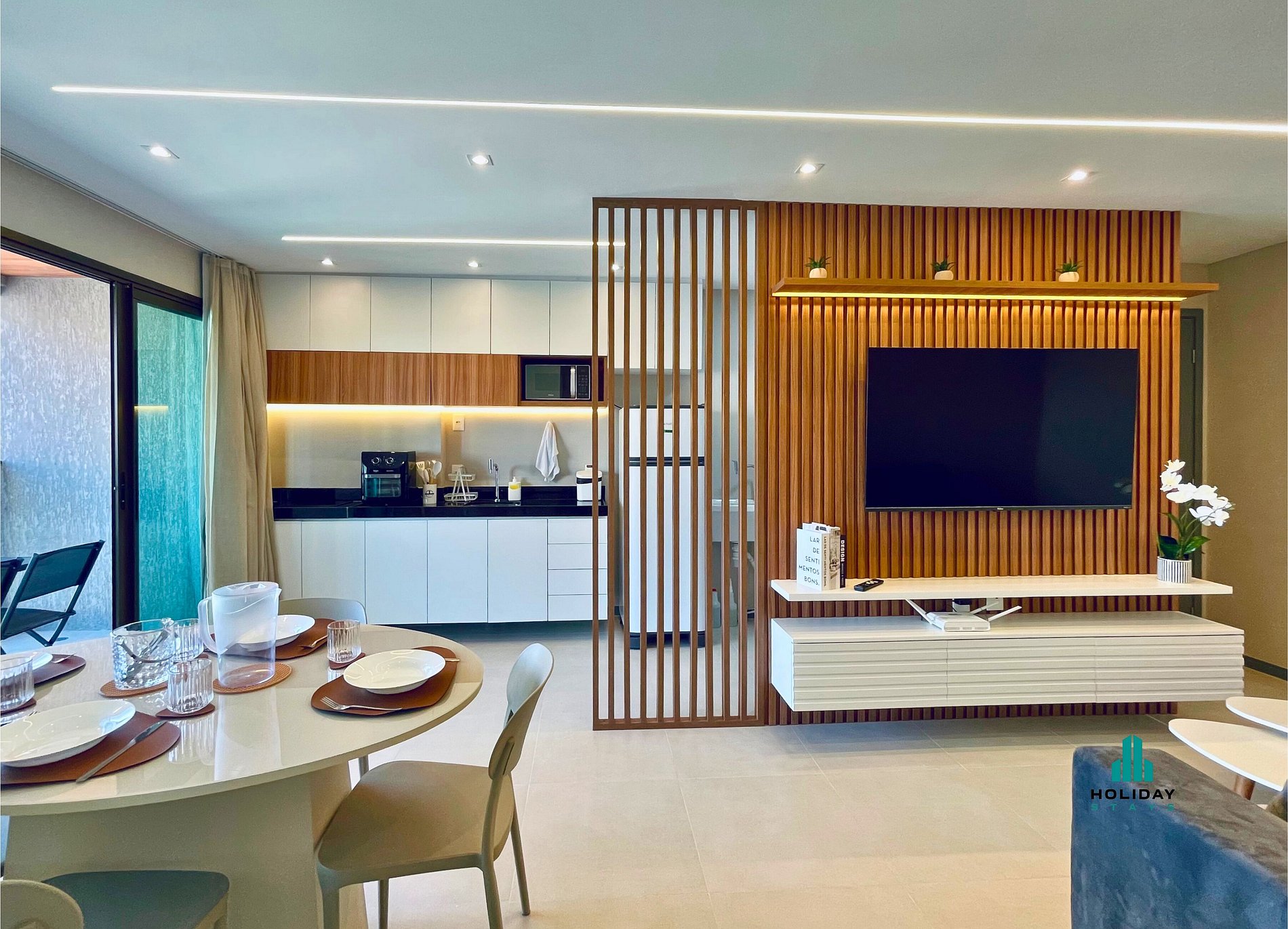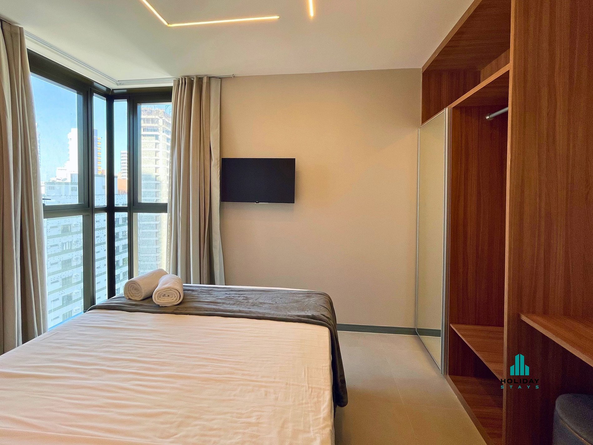 Elegante apartamento com sala aconchegante, sofá-cama, smart TV de 58”, cozinha completa e área de jantar para 4 pessoas. Varanda ampla com vista para a cidade, mesa e cadeiras. Possui dois quartos: um com cama casal, TV, ar-condicionado e guarda-roupa; outro com duas camas de solteiro, ar-condicionado e guarda-roupa. Dois banheiros com água quente e secador de cabelo.