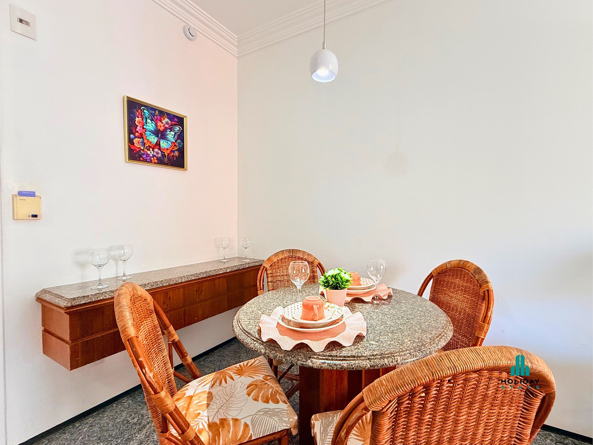 Possui 1 quarto com cama king (ou 2 de solteiro), TV e ar-condicionado. Sala com sofá-cama, mesa de jantar e ar-condicionado. Cozinha equipada com fogão 4 bocas, minibar, micro-ondas, liquidificador e sanduicheira. Banheiro com chuveiro quente. Wi-Fi disponível. Ideal para casais, amigos ou viagens a trabalho.