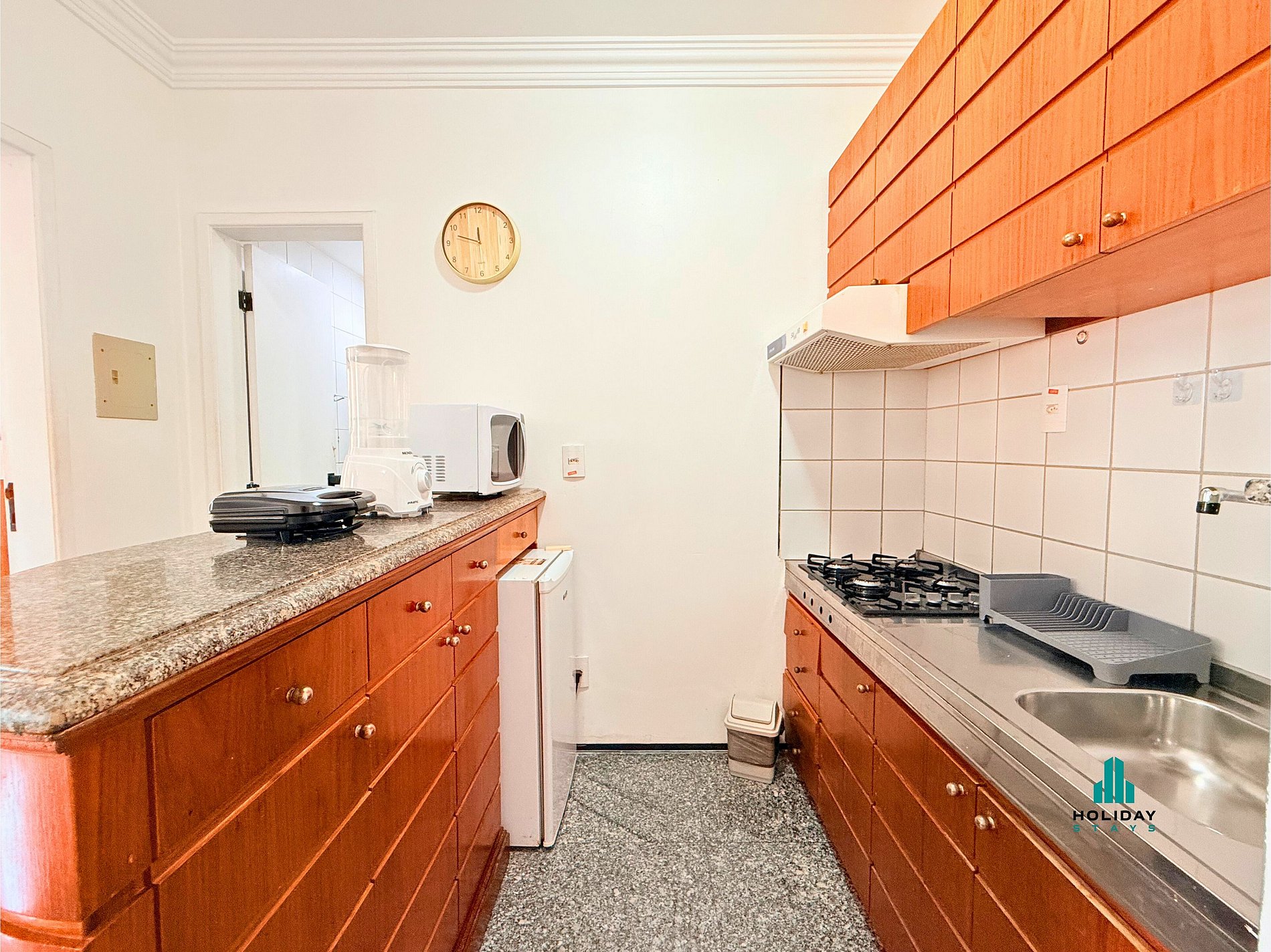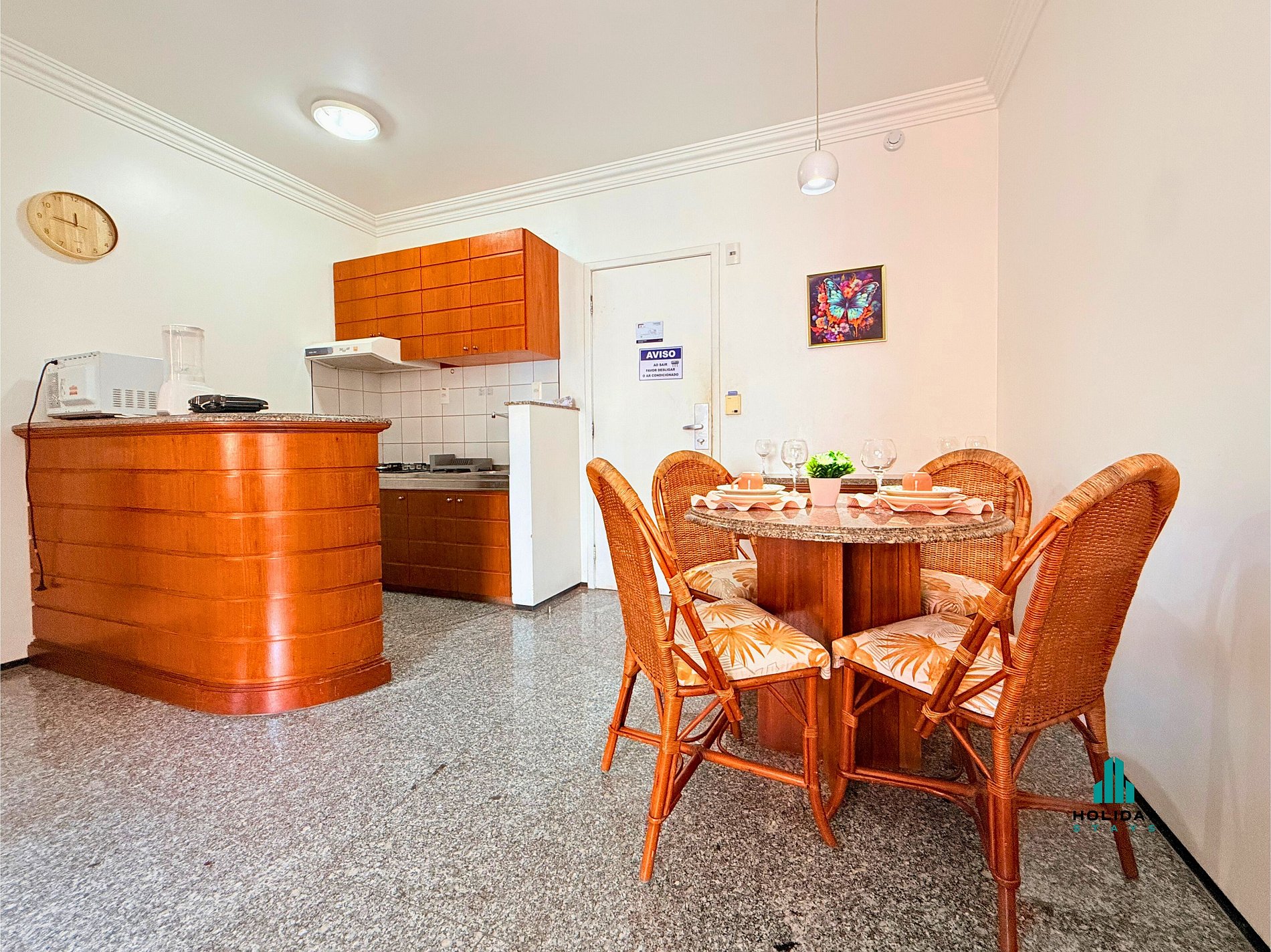 Possui 1 quarto com cama king (ou 2 de solteiro), TV e ar-condicionado. Sala com sofá-cama, mesa de jantar e ar-condicionado. Cozinha equipada com fogão 4 bocas, minibar, micro-ondas, liquidificador e sanduicheira. Banheiro com chuveiro quente. Wi-Fi disponível. Ideal para casais, amigos ou viagens a trabalho.