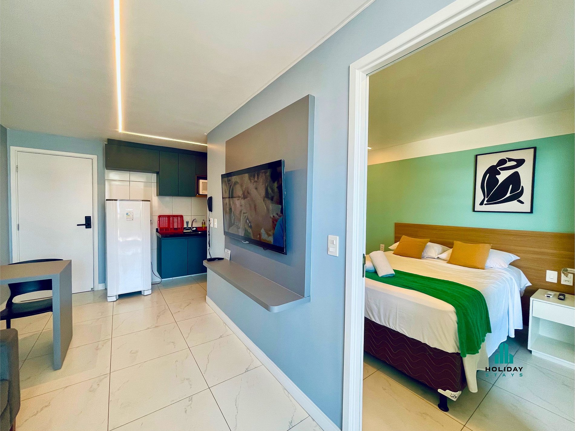 Aconchegante apartamento com sala de estar equipada com TV de 50”, sofá e mesa de jantar. Cozinha completa com fogão, micro-ondas, liquidificador, louças, talheres, panelas e geladeira. Varanda com mesa e cadeiras e vista lateral para o mar. Suíte com cama de casal, TV de 32” e espaço para trabalho, além de guarda-roupa. Banheiro com chuveiro quente e secador de cabelo. Internet Wi-Fi para lazer ou home office. Estacionamento numerado disponível.