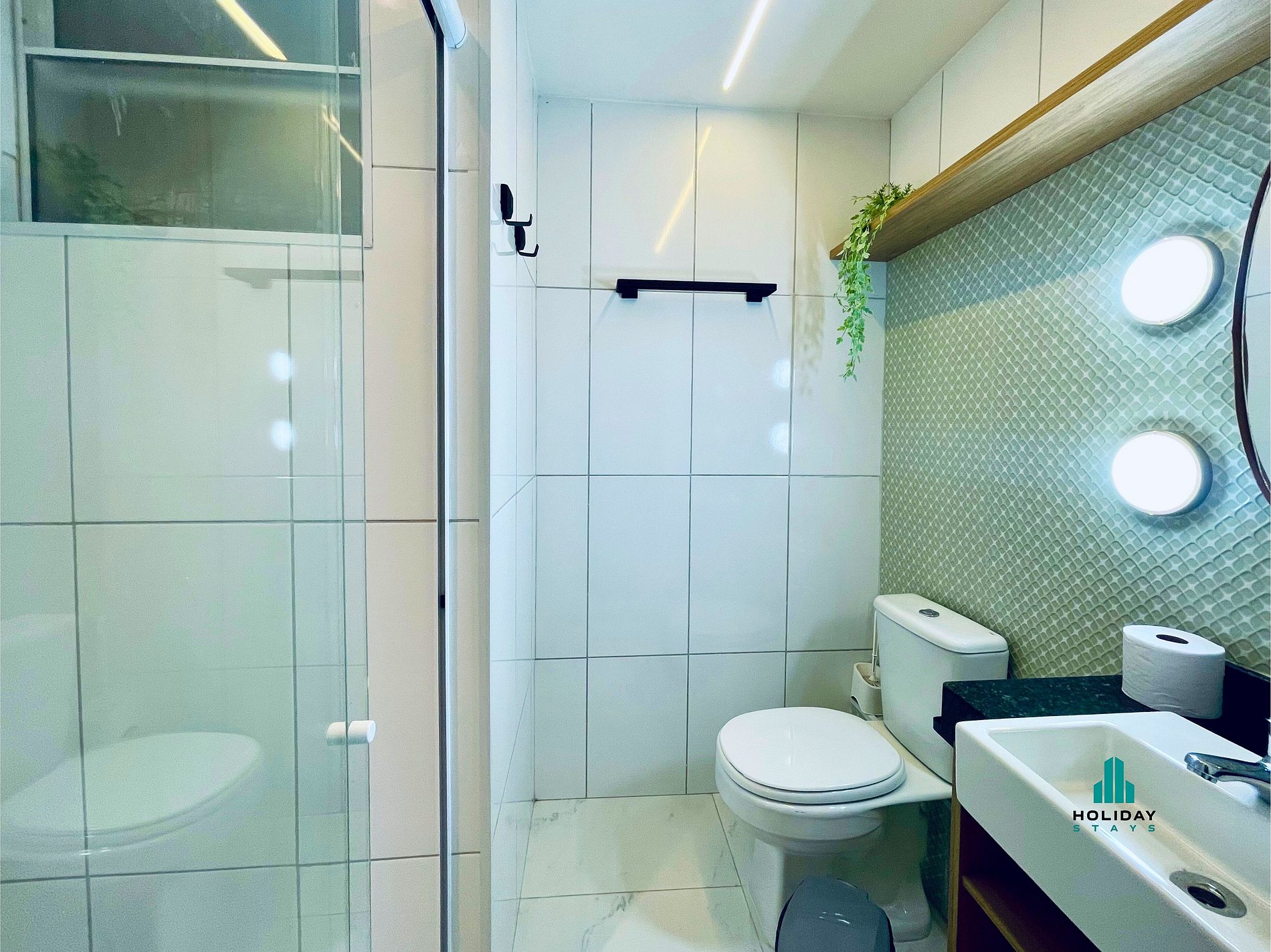Banheiro: Chuveiro quente Secador de cabelo Acabamento moderno e funcional