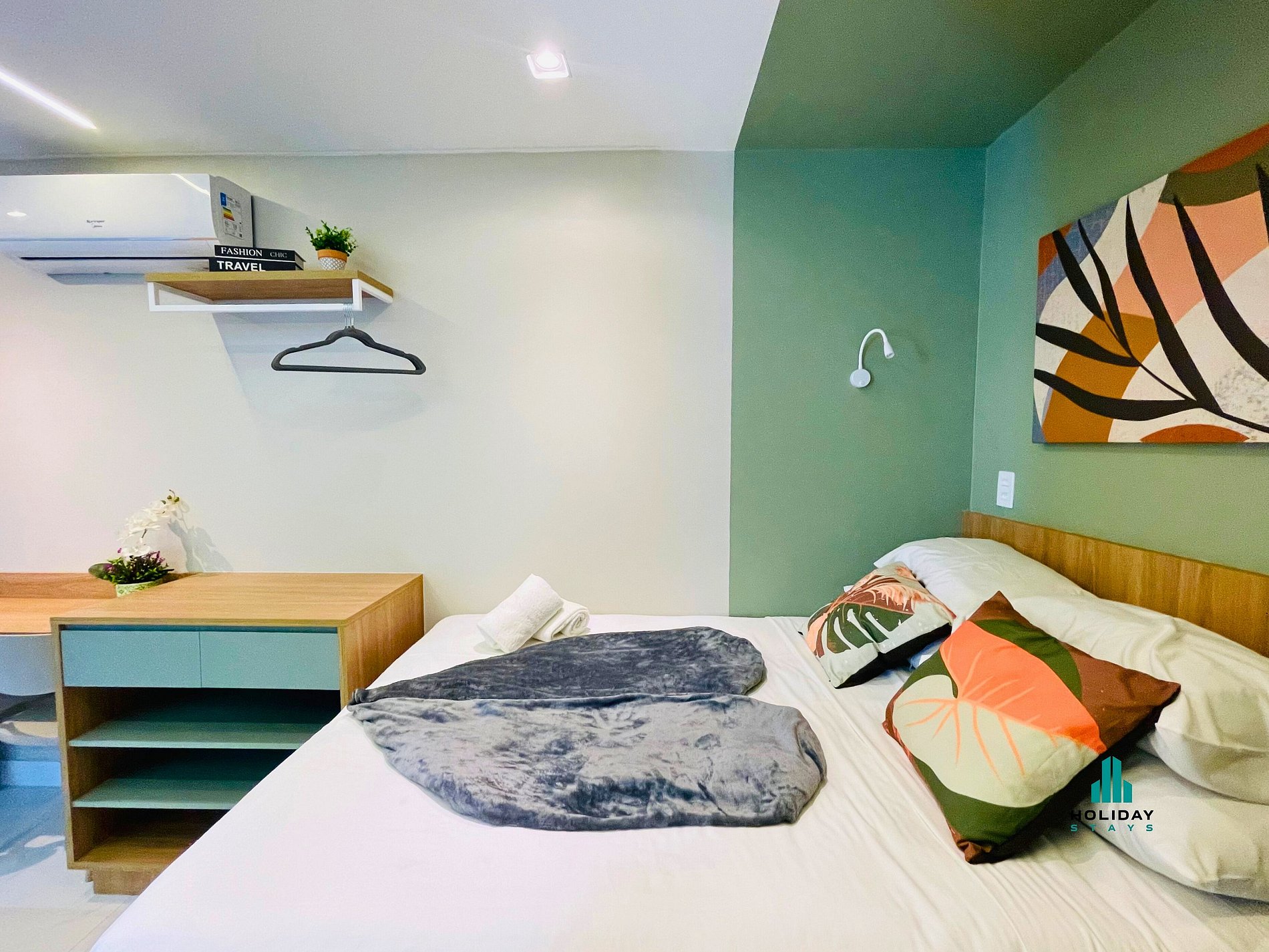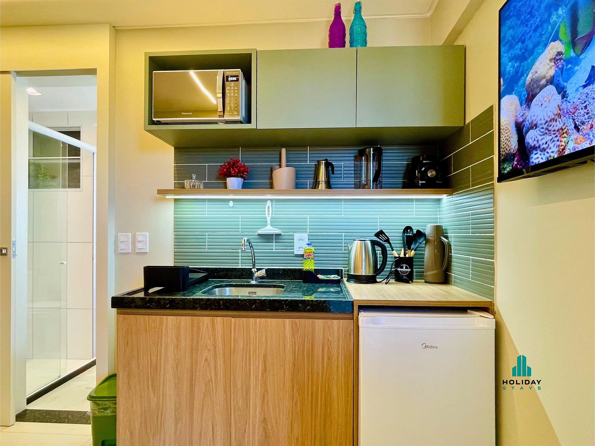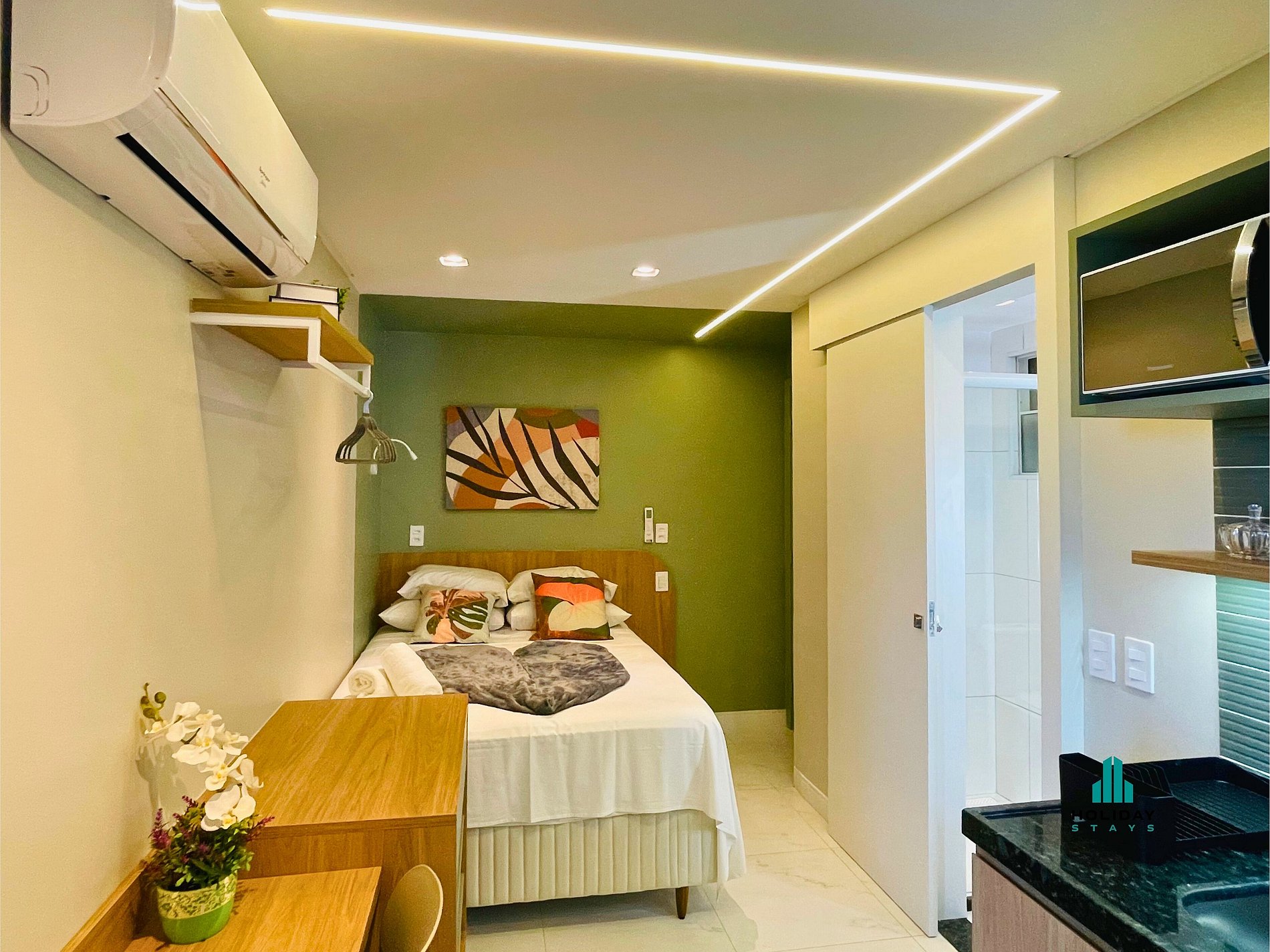 Mini studio compacto, moderno e decorado com bom gosto. Ambiente único com cama de casal, mesa para trabalho ou refeições e mini cozinha equipada com fogão elétrico de uma boca, airfryer, sanduicheira, chaleira elétrica, liquidificador, cafeteira moka e micro-ondas. Banheiro moderno com secador de cabelo. Ideal para estadias curtas, oferecendo conforto, praticidade e estilo em um espaço funcional e bem planejado.