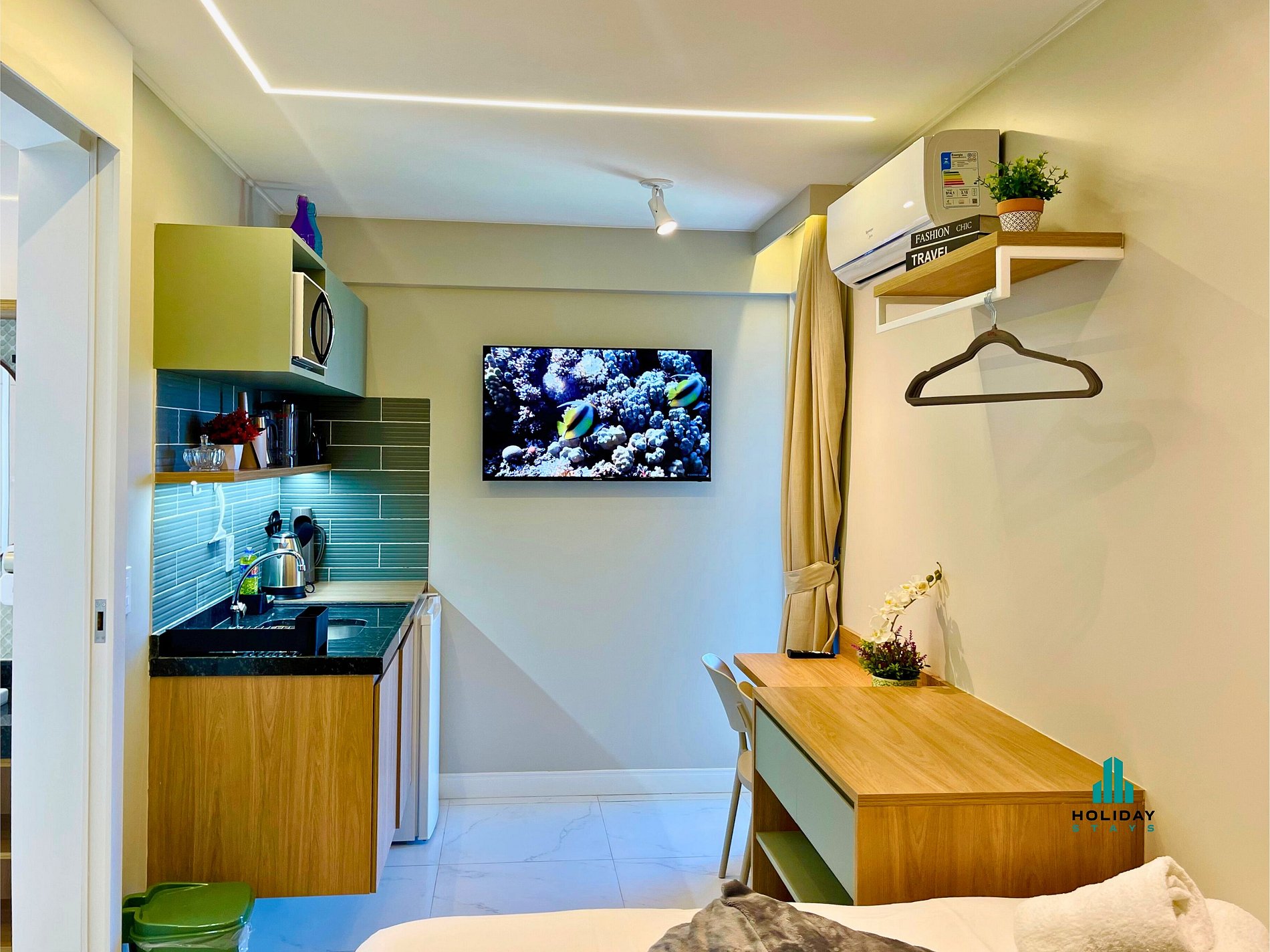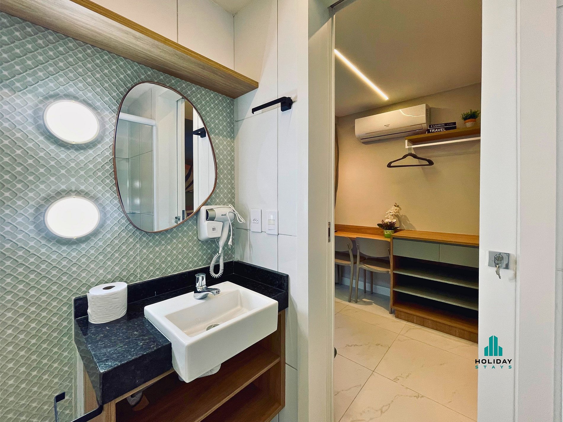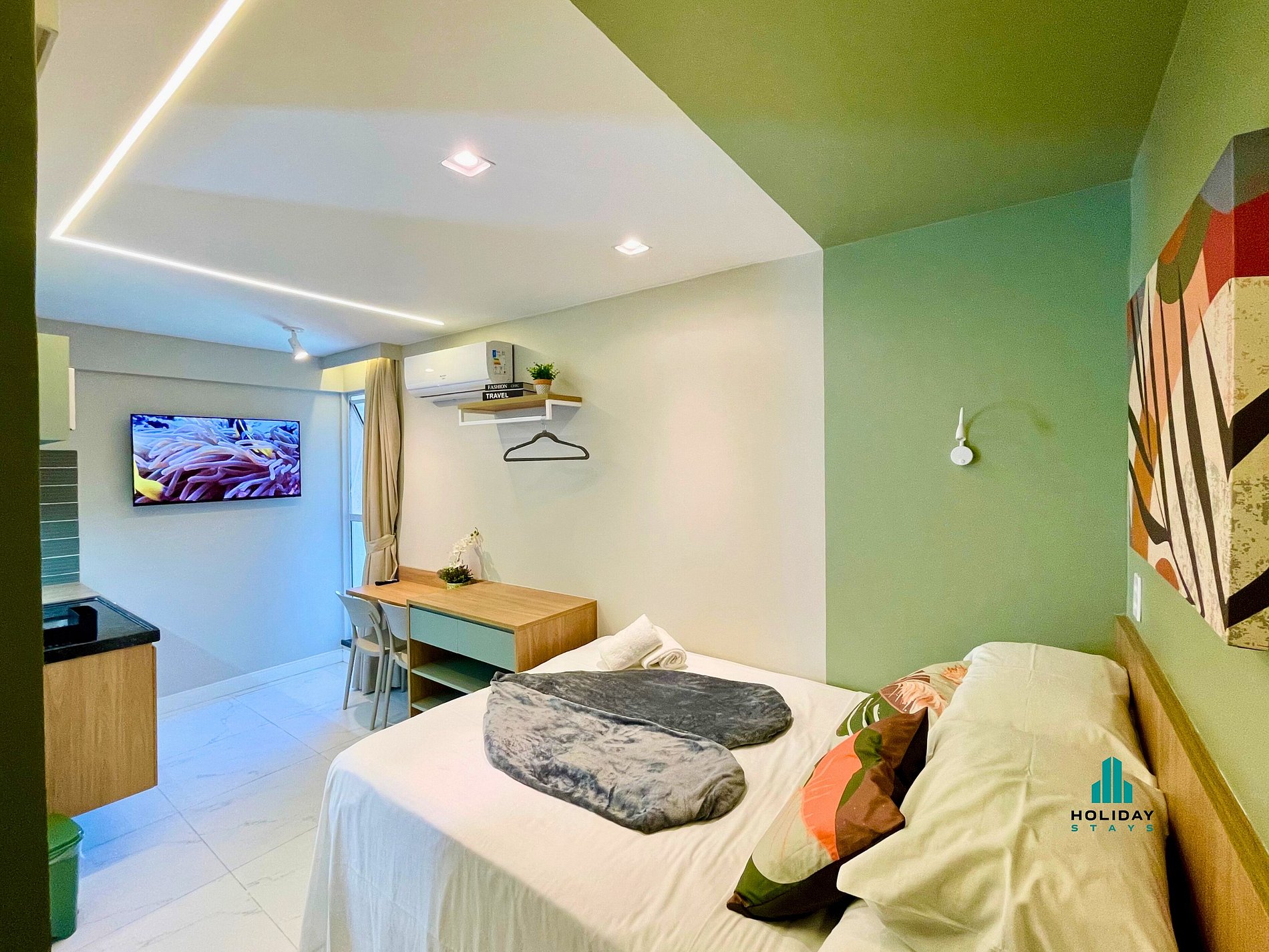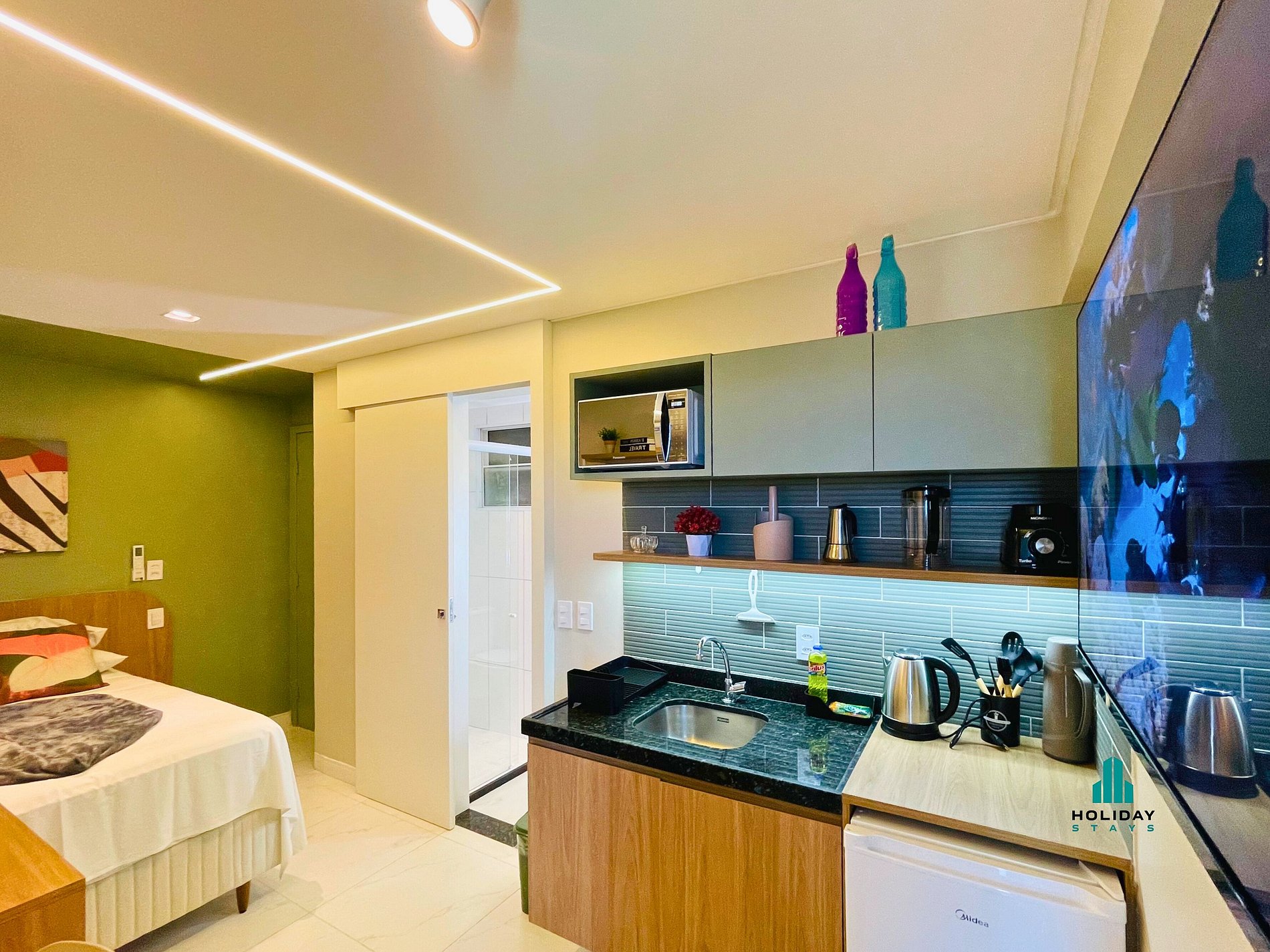 Mini studio compacto, moderno e decorado com bom gosto. Ambiente único com cama de casal, mesa para trabalho ou refeições e mini cozinha equipada com fogão elétrico de uma boca, airfryer, sanduicheira, chaleira elétrica, liquidificador, cafeteira moka e micro-ondas. Banheiro moderno com secador de cabelo. Ideal para estadias curtas, oferecendo conforto, praticidade e estilo em um espaço funcional e bem planejado.