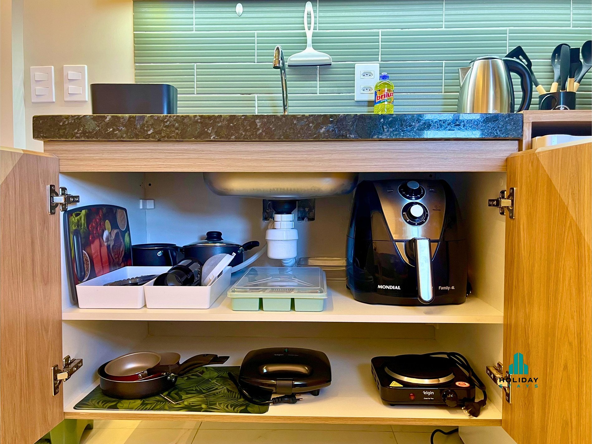 Cozinha Compacta:Fogão elétrico de uma boca Airfryer Sanduicheira Chaleira elétrica Liquidificador Cafeteira moka Micro-ondas Utensílios básicos