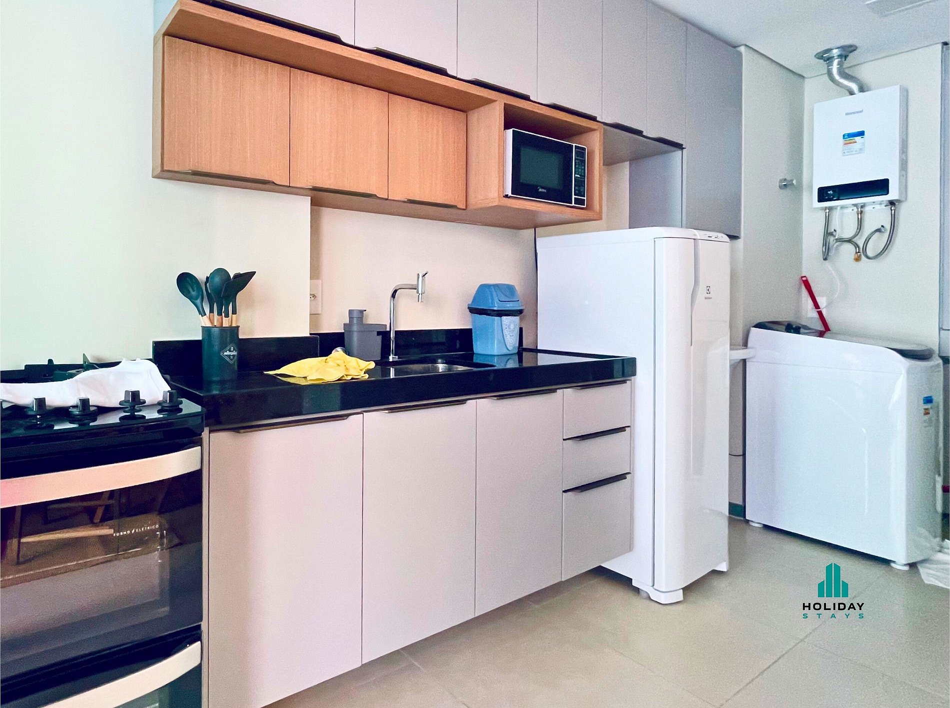 Cozinha Completa: fogão, forno, micro-ondas, geladeira e máquina de lavar.