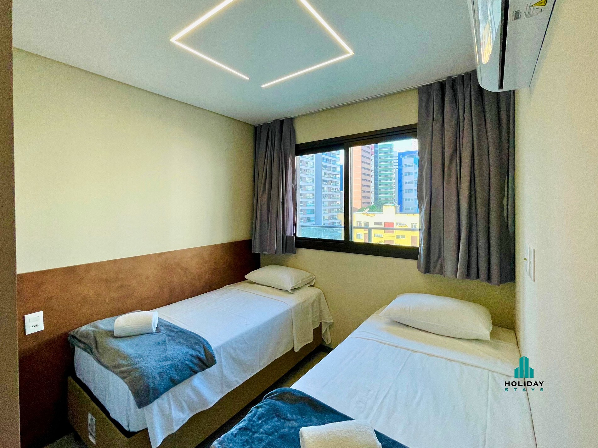 Quarto 2: duas camas de solteiro, guarda-roupa e ar-condicionado.