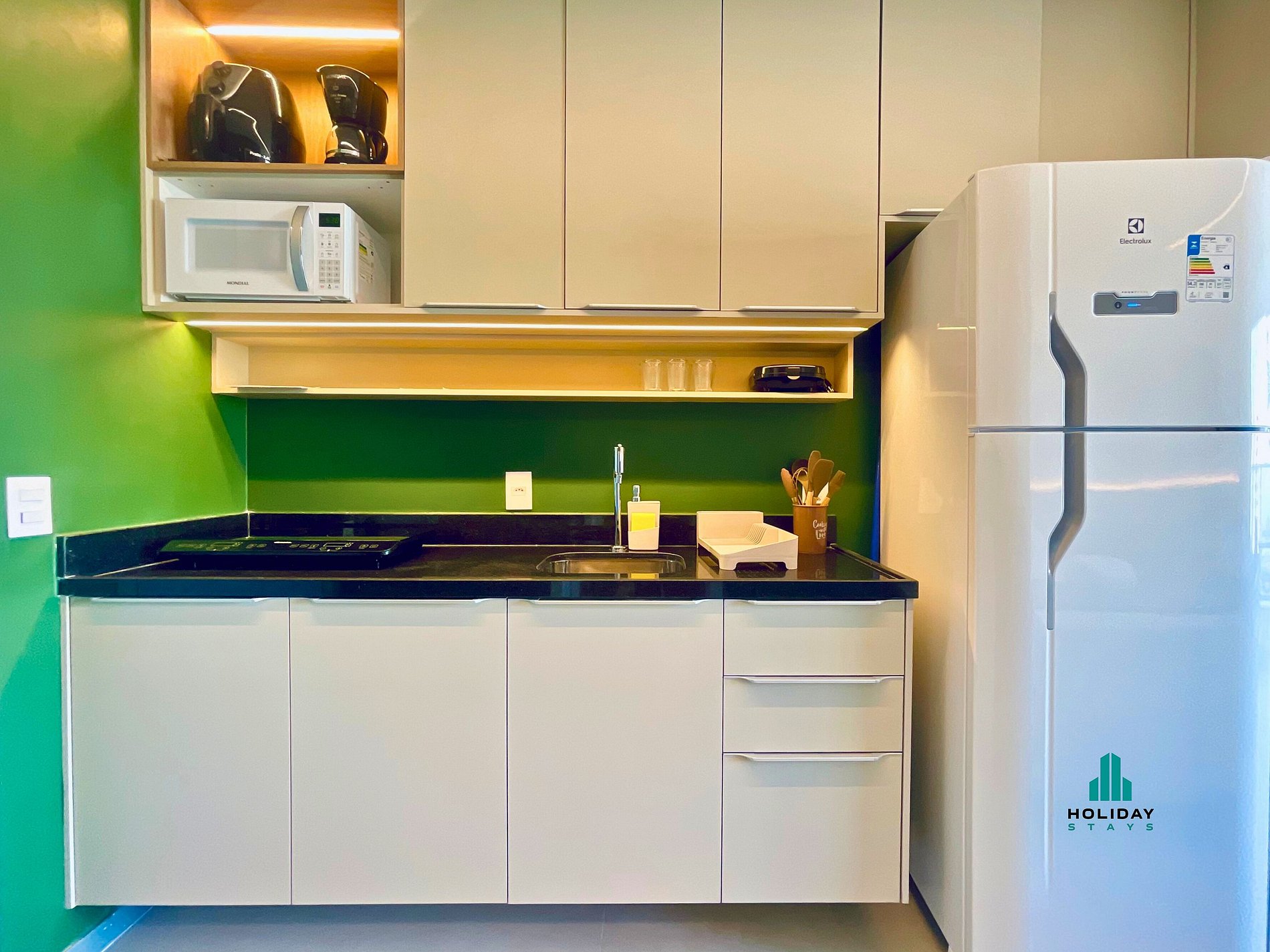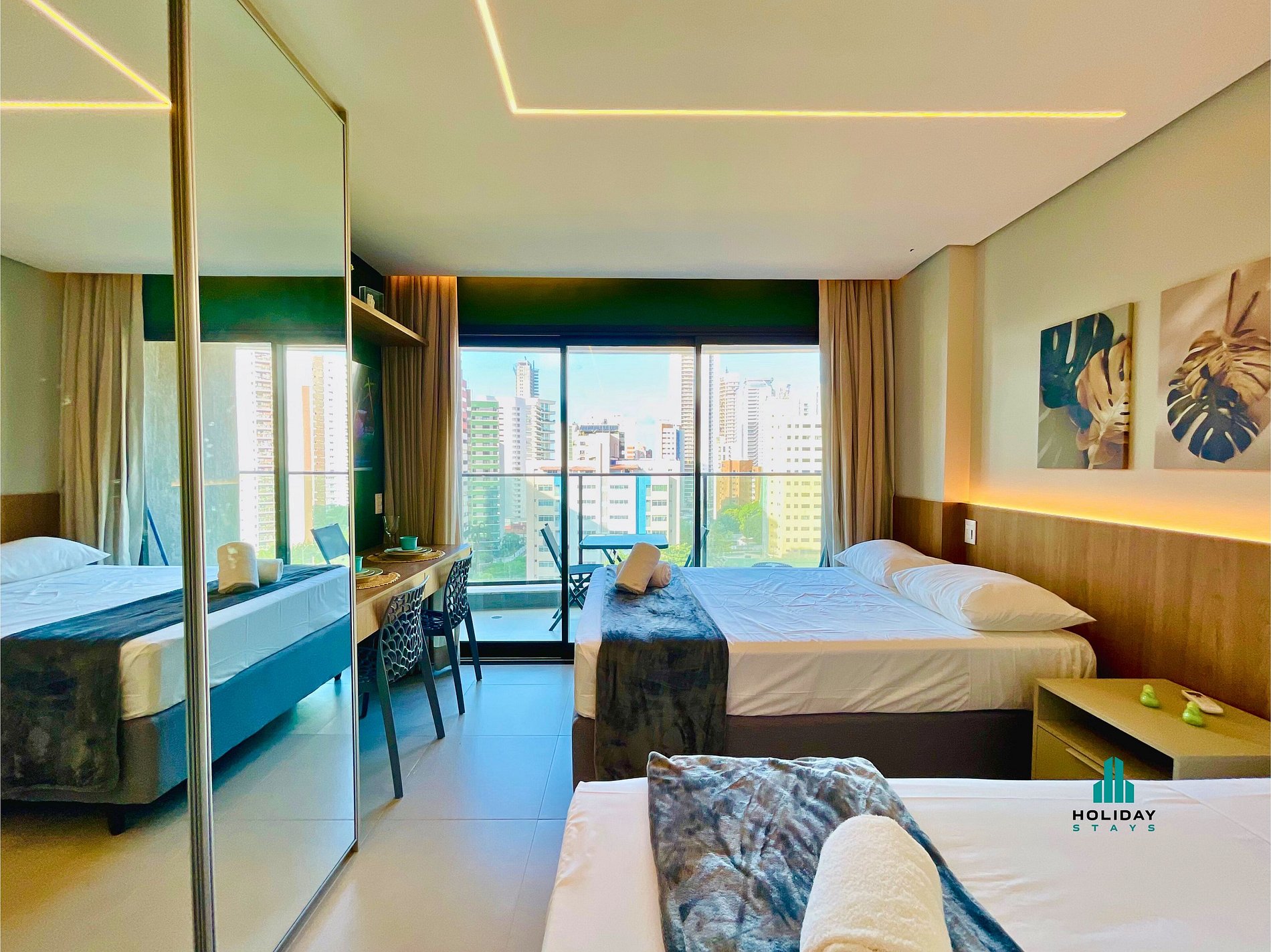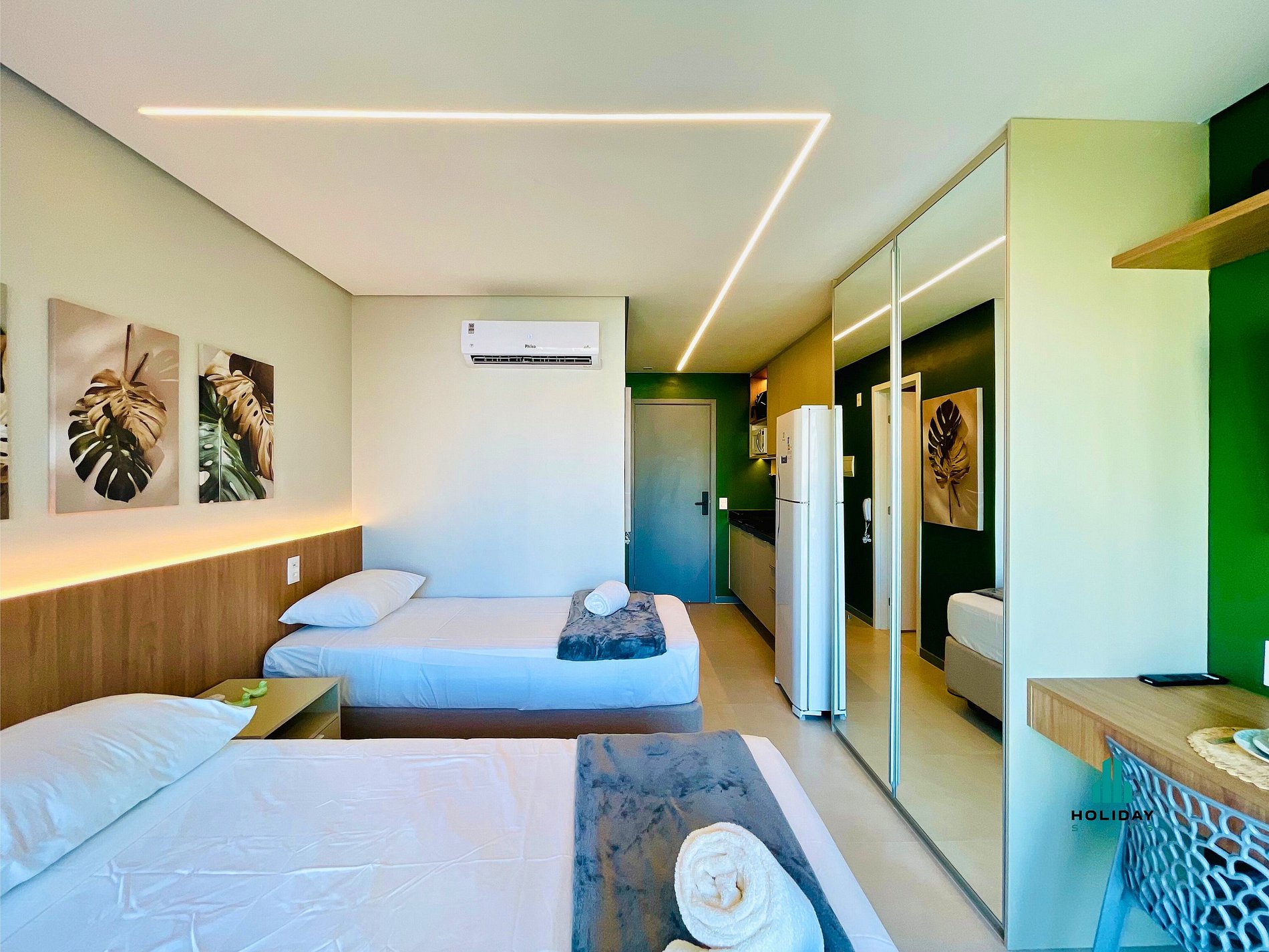 Studio moderno, compacto e funcional, com capacidade para até 3 pessoas. Possui cozinha completa com geladeira, cooktop 2 bocas a indução, utensílios, airfryer, micro-ondas e liquidificador — ideal para preparar suas refeições. Conta com 1 cama de casal, 1 cama de solteiro, smart TV de 43”, ar-condicionado e banheiro com água quente e secador de cabelo. Varanda ampla com mesa, cadeiras e uma linda vista para a cidade.