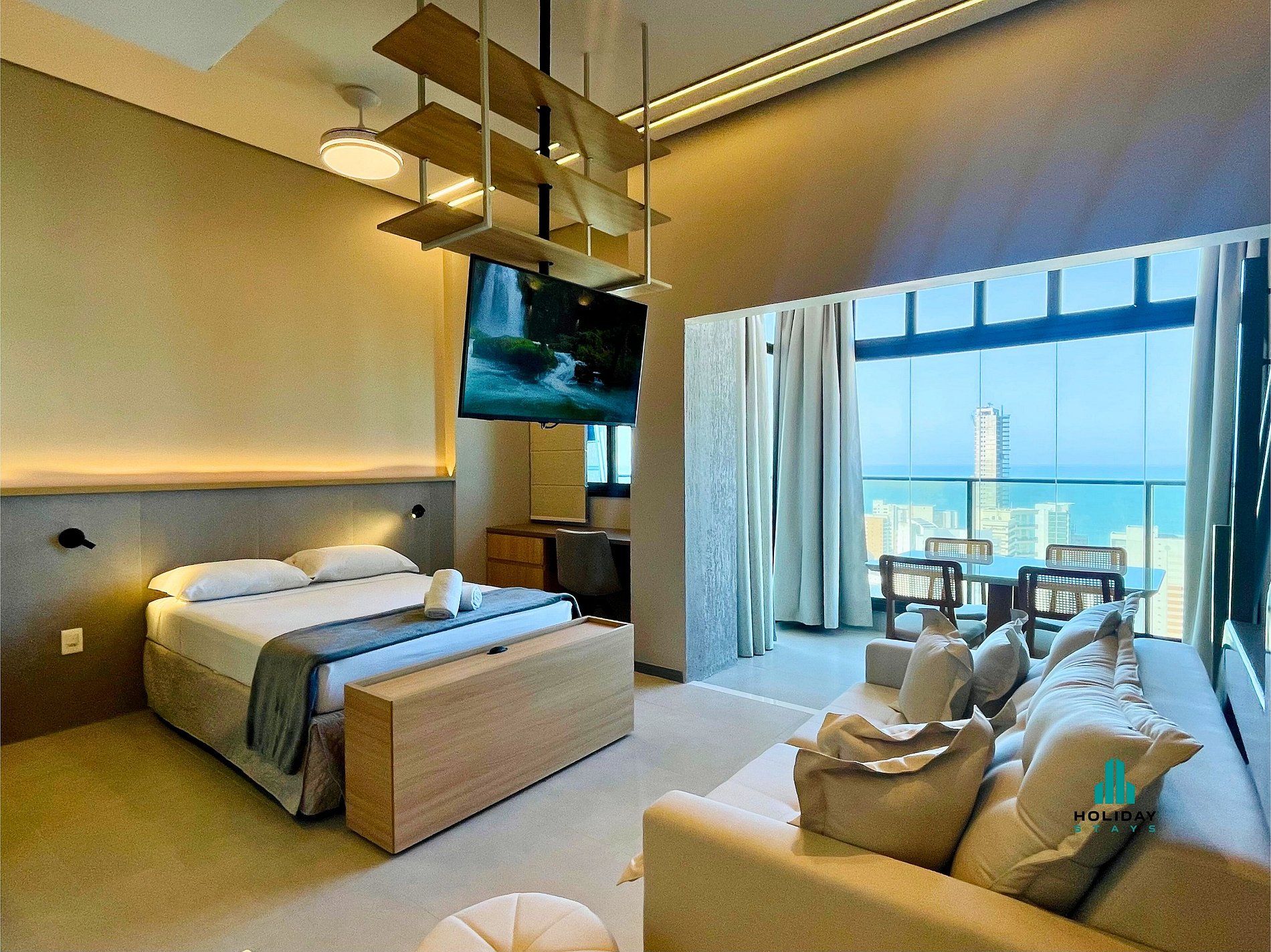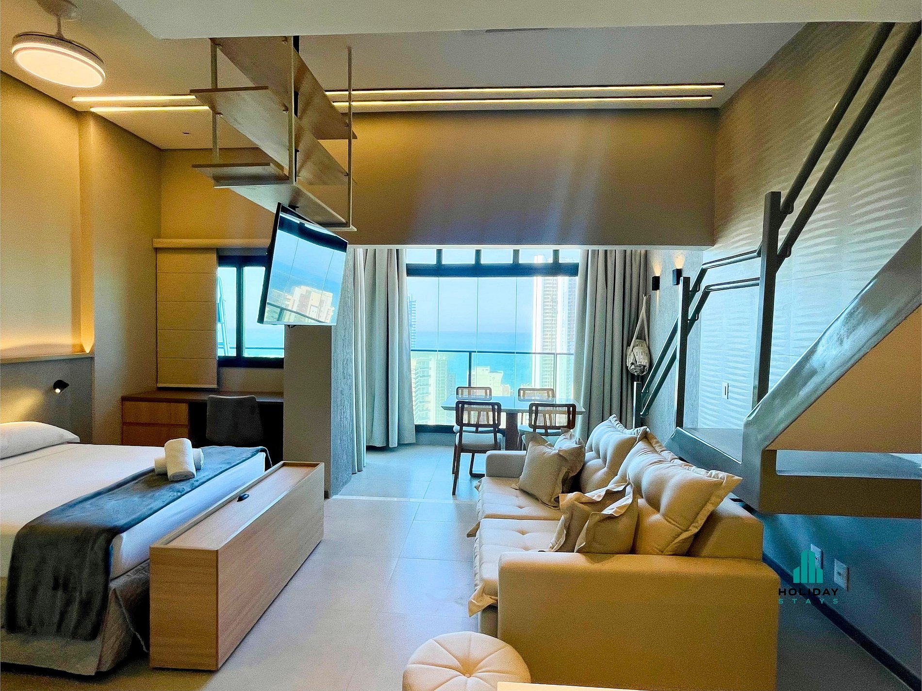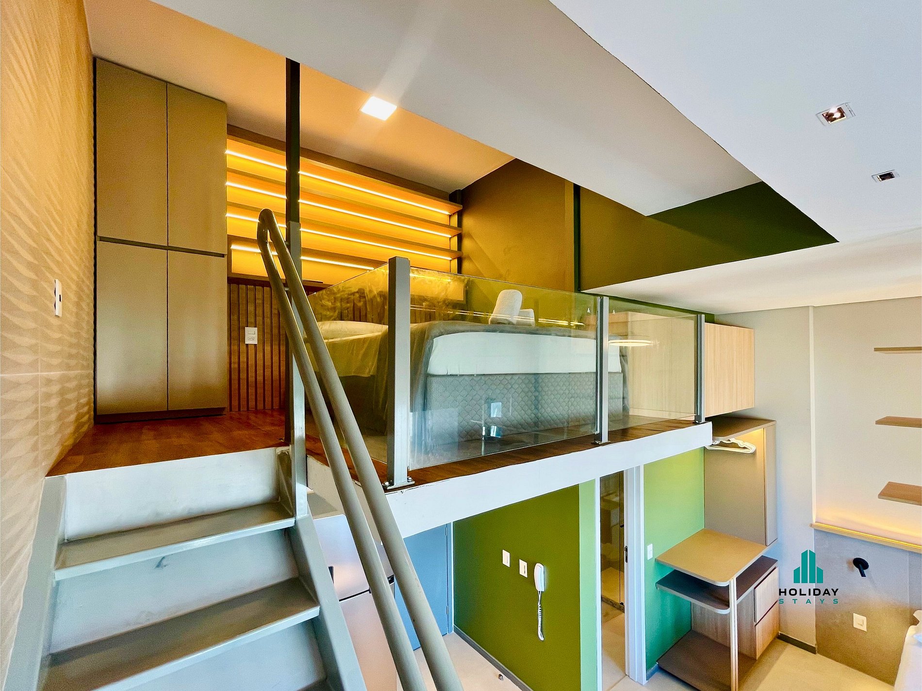 Loft moderno com pé-direito duplo e escada interna. No mezanino, cama de casal e TV; na parte inferior, cama de casal, sofá, TV e varanda envidraçada com mesa, cadeiras e rede. Cozinha completa com fogão, geladeira, micro-ondas, airfryer, liquidificador e utensílios. Banheiro com água quente e secador de cabelo. Último andar com vista espetacular do mar.