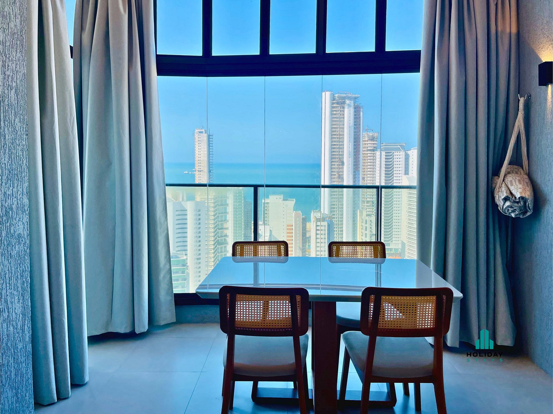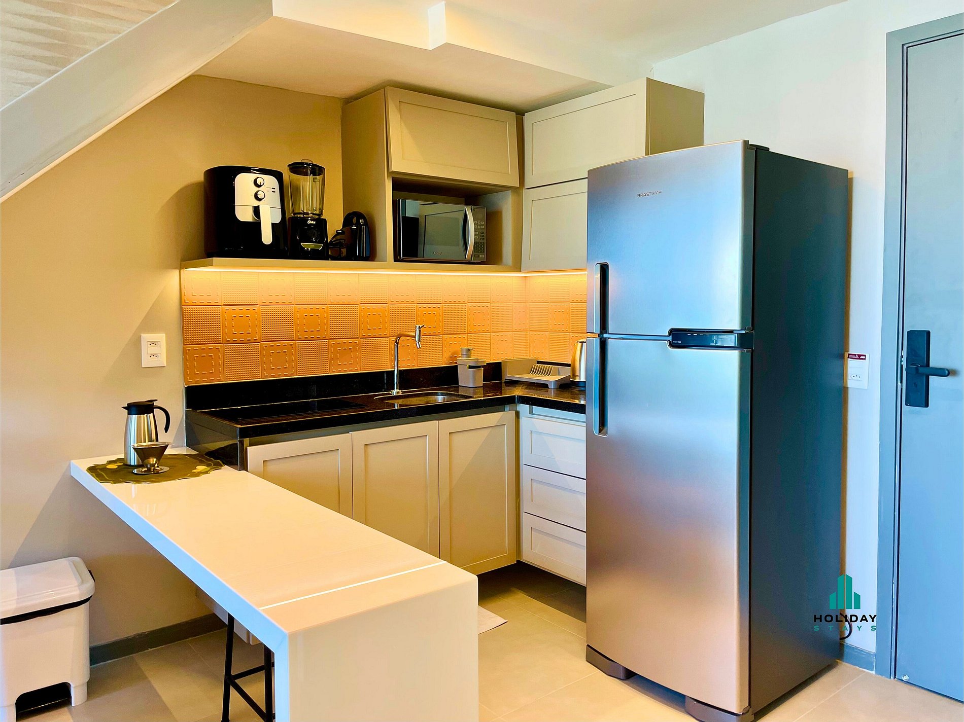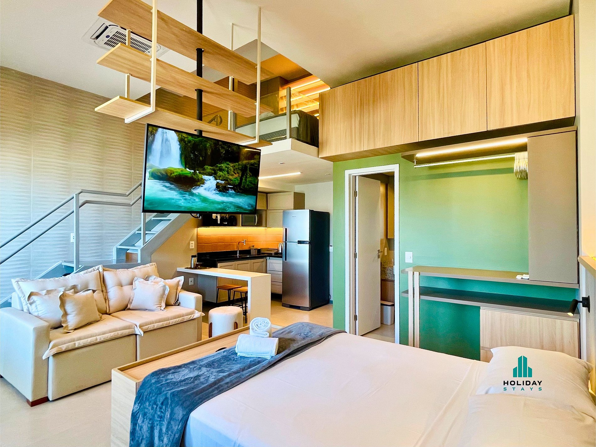 Loft moderno com pé-direito duplo e escada interna. No mezanino, cama de casal e TV; na parte inferior, cama de casal, sofá, TV e varanda envidraçada com mesa, cadeiras e rede. Cozinha completa com fogão, geladeira, micro-ondas, airfryer, liquidificador e utensílios. Banheiro com água quente e secador de cabelo. Último andar com vista espetacular do mar.