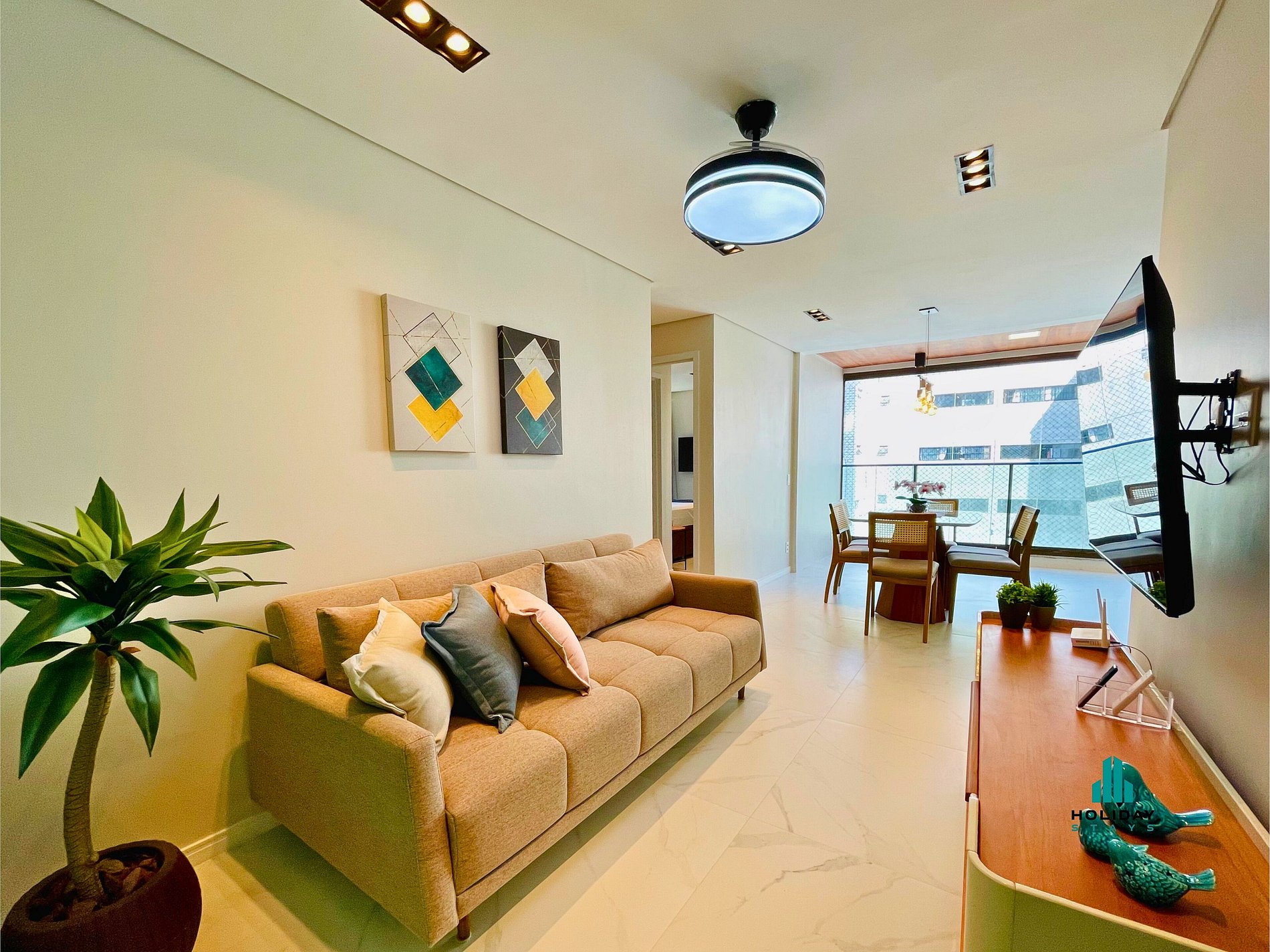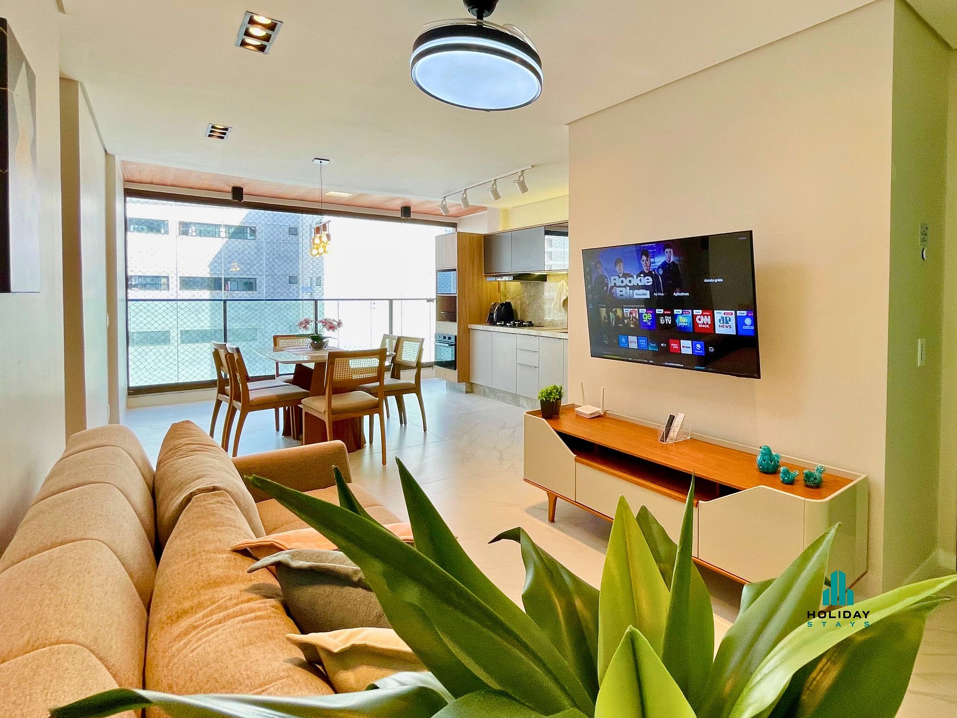 Apartamento de alto padrão com sala de estar equipada com TV 50”, sofá confortável e sala de jantar com mesa para 6 pessoas e varanda integrada. Cozinha completa com fogão, forno, geladeira, airfryer e sanduicheira. Suíte com cama queen, TV 43”, ar-condicionado, chuveiro quente e secador de cabelo. Segundo quarto com treliche e ar-condicionado. Segundo banheiro com chuveiro quente e secador de cabelo.