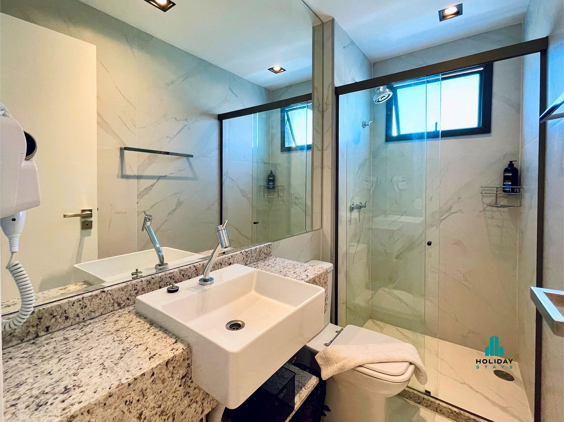 Segundo banheiro com chuveiro quente e secador de cabelo