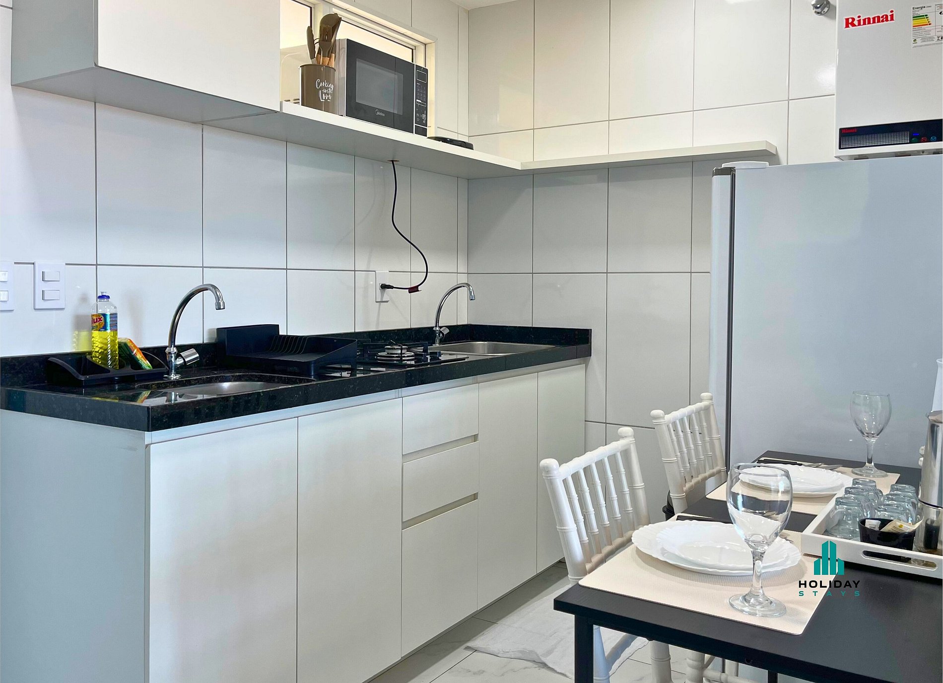 Cozinha equipada (fogão, micro-ondas, geladeira, utensílios)
