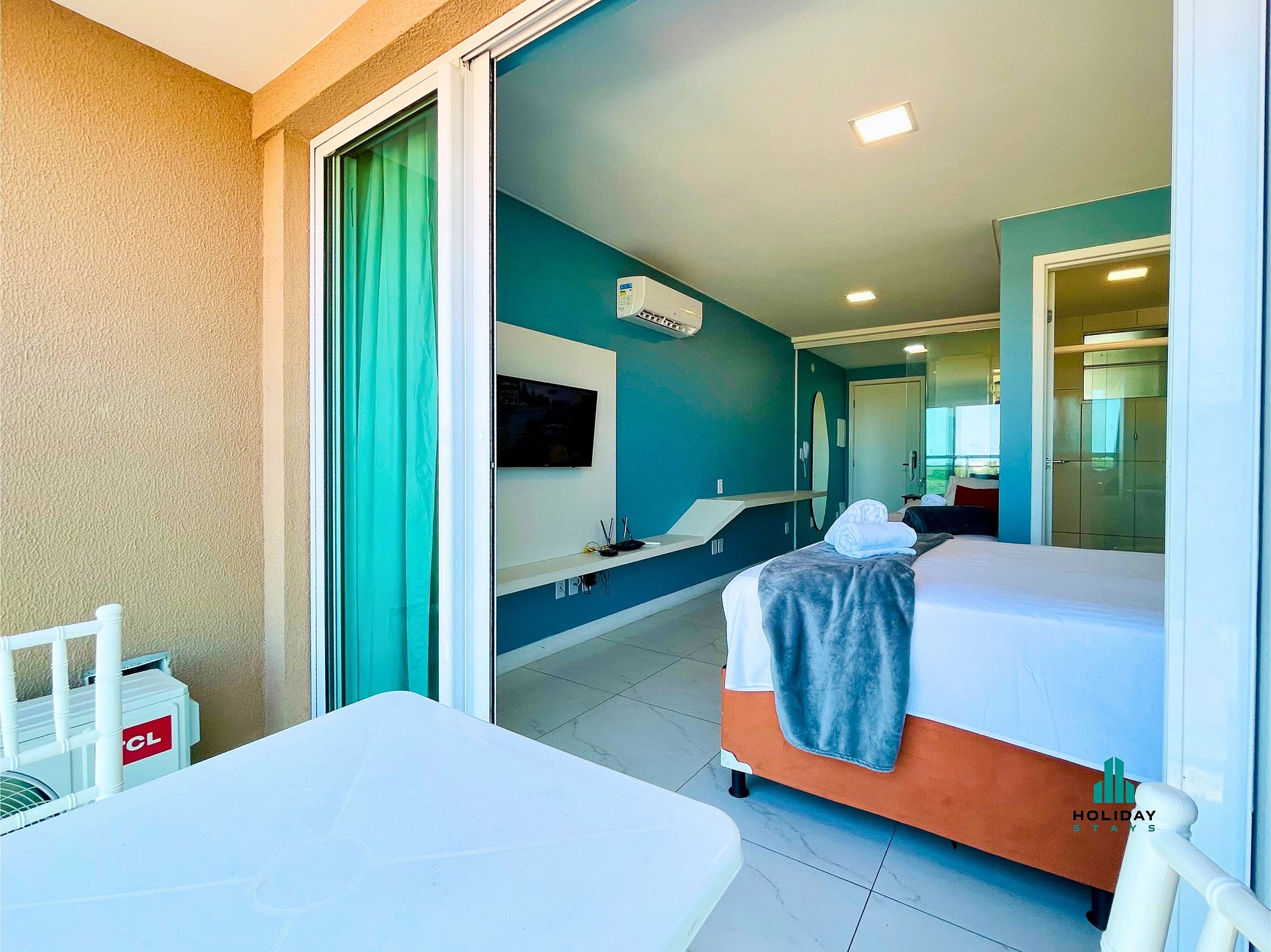 Studio moderno ideal para famílias ou grupos pequenos. Conta com 1 cama de casal, 1 bicama, cozinha equipada com utensílios, geladeira e micro-ondas, mesa com 2 cadeiras. Dispõe de TV, internet Wi-Fi, banheiro com chuveiro quente e uma agradável varanda com mesa e cadeiras para relaxar. Conforto, praticidade e ótima localização para sua estadia!