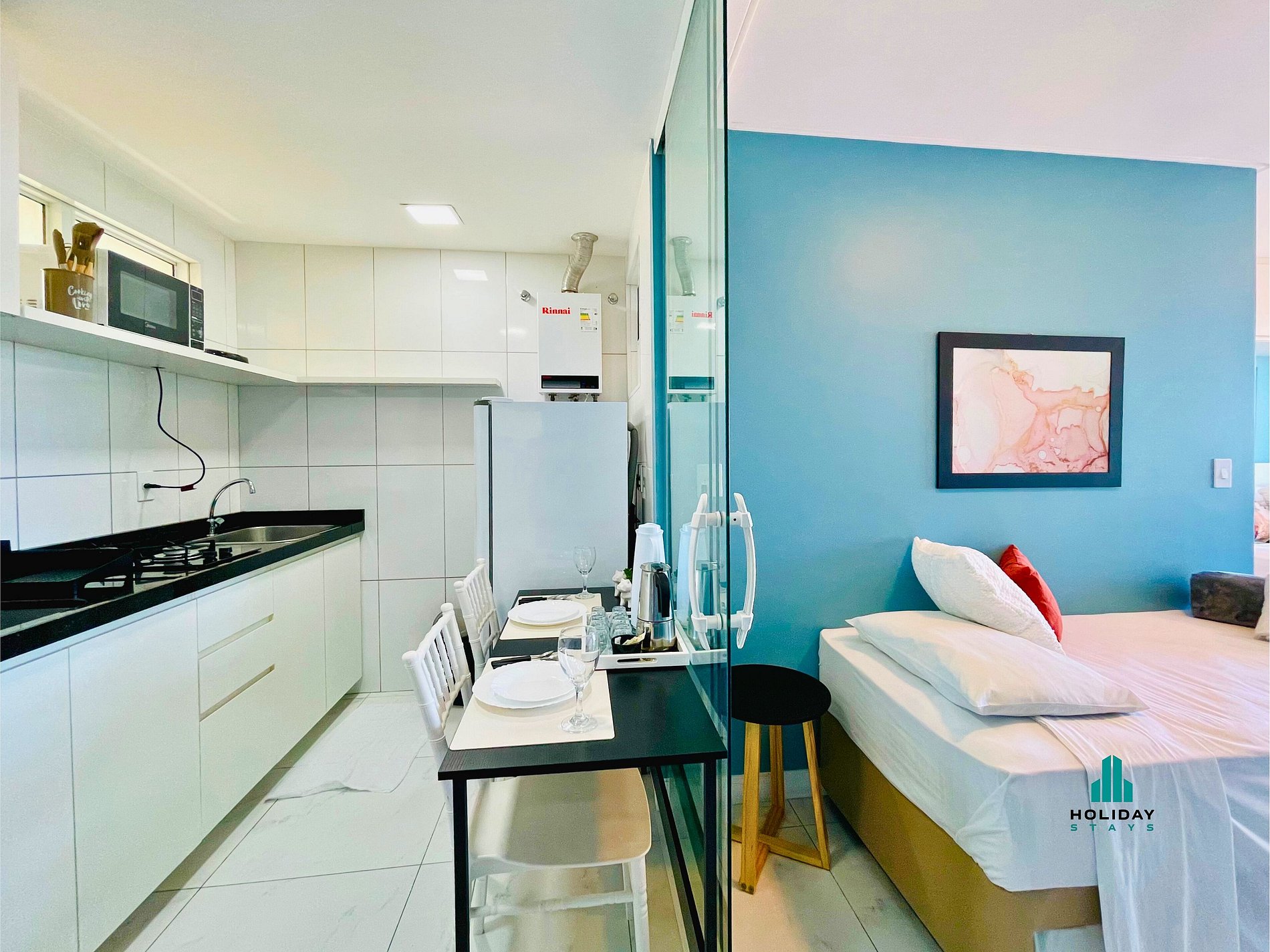 Studio moderno ideal para famílias ou grupos pequenos. Conta com 1 cama de casal, 1 bicama, cozinha equipada com utensílios, geladeira e micro-ondas, mesa com 2 cadeiras. Dispõe de TV, internet Wi-Fi, banheiro com chuveiro quente e uma agradável varanda com mesa e cadeiras para relaxar. Conforto, praticidade e ótima localização para sua estadia!