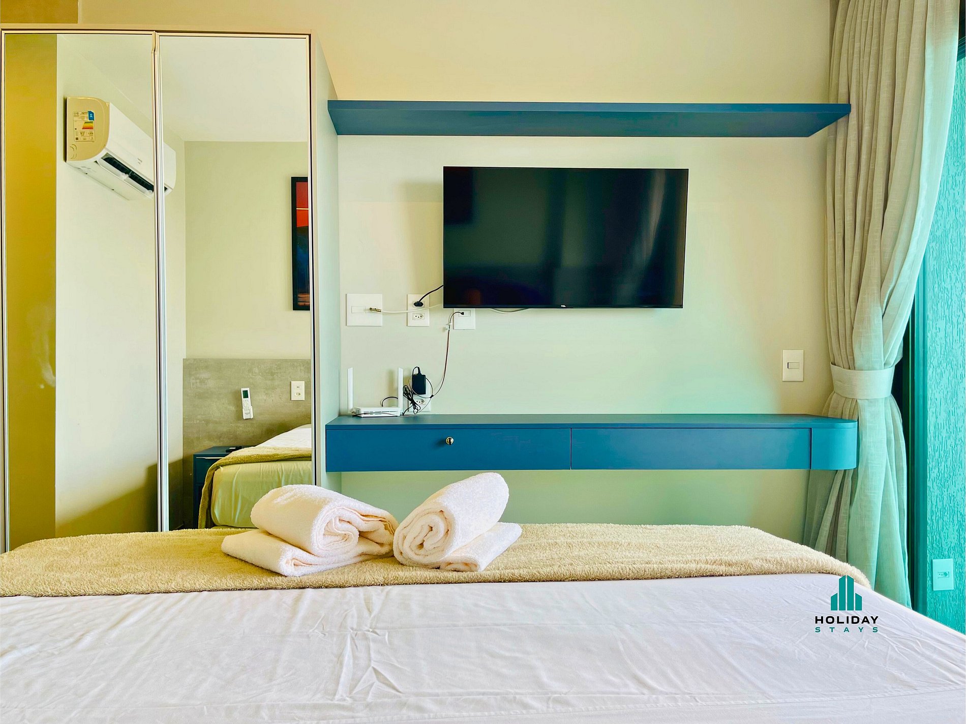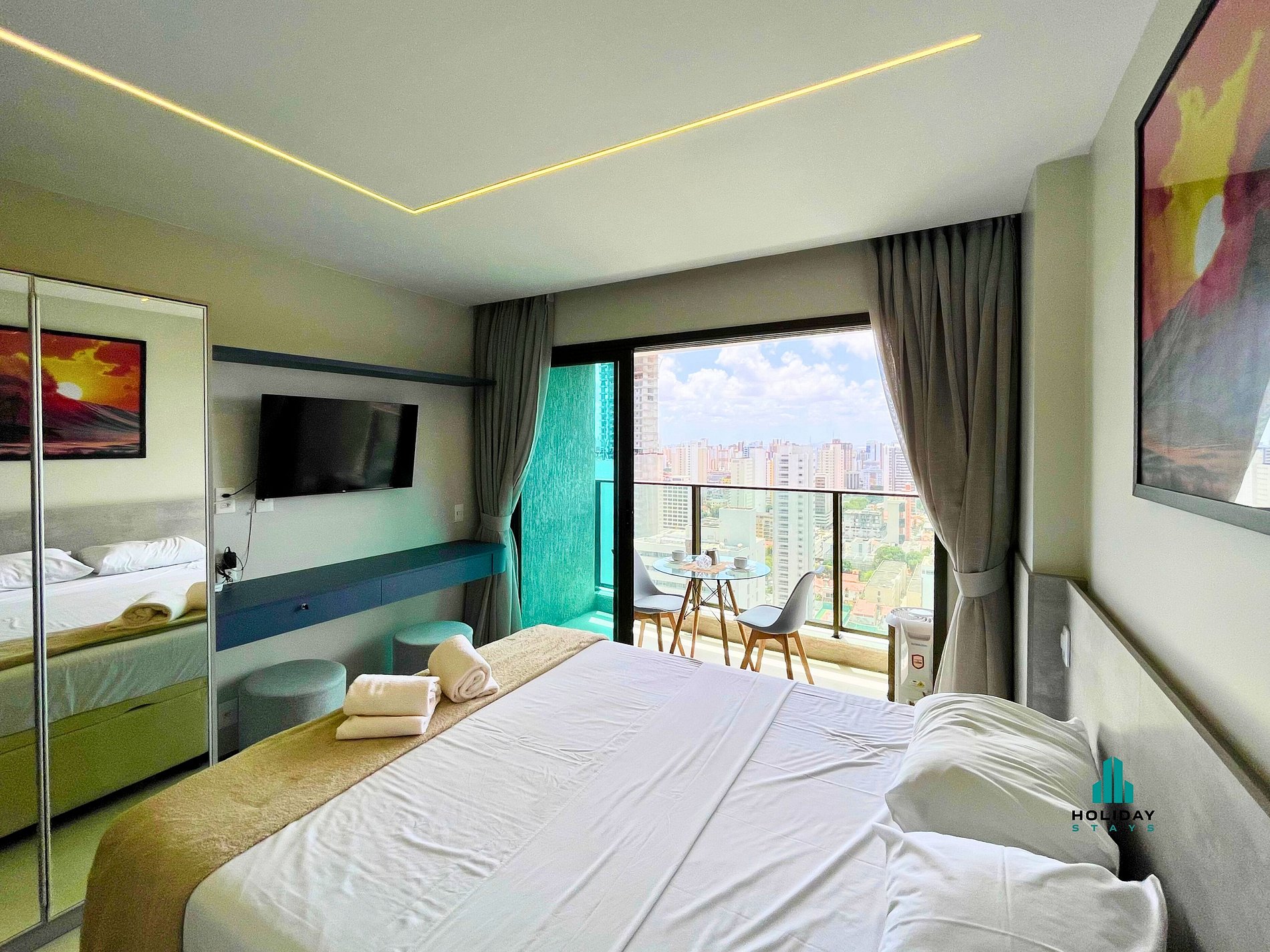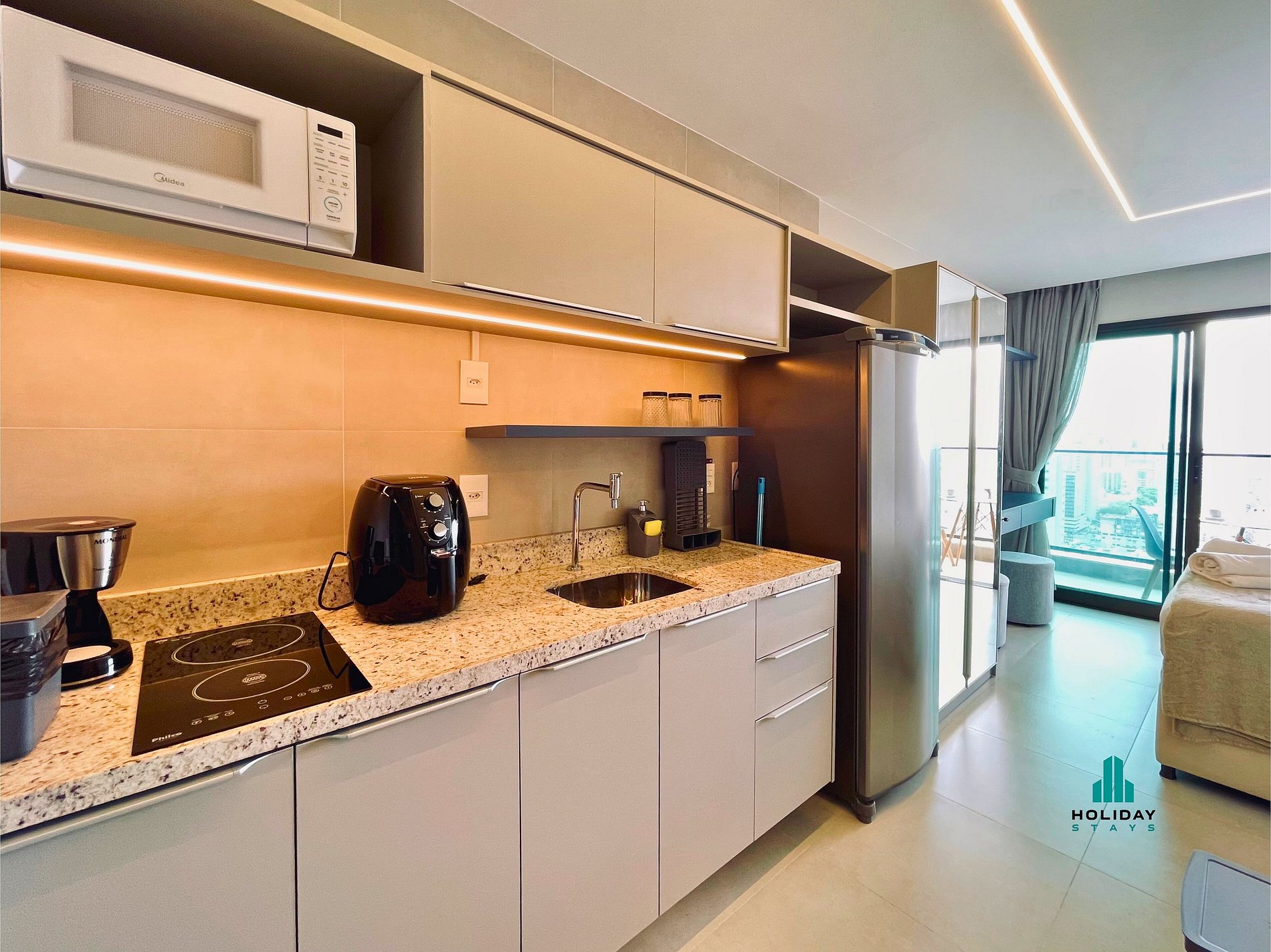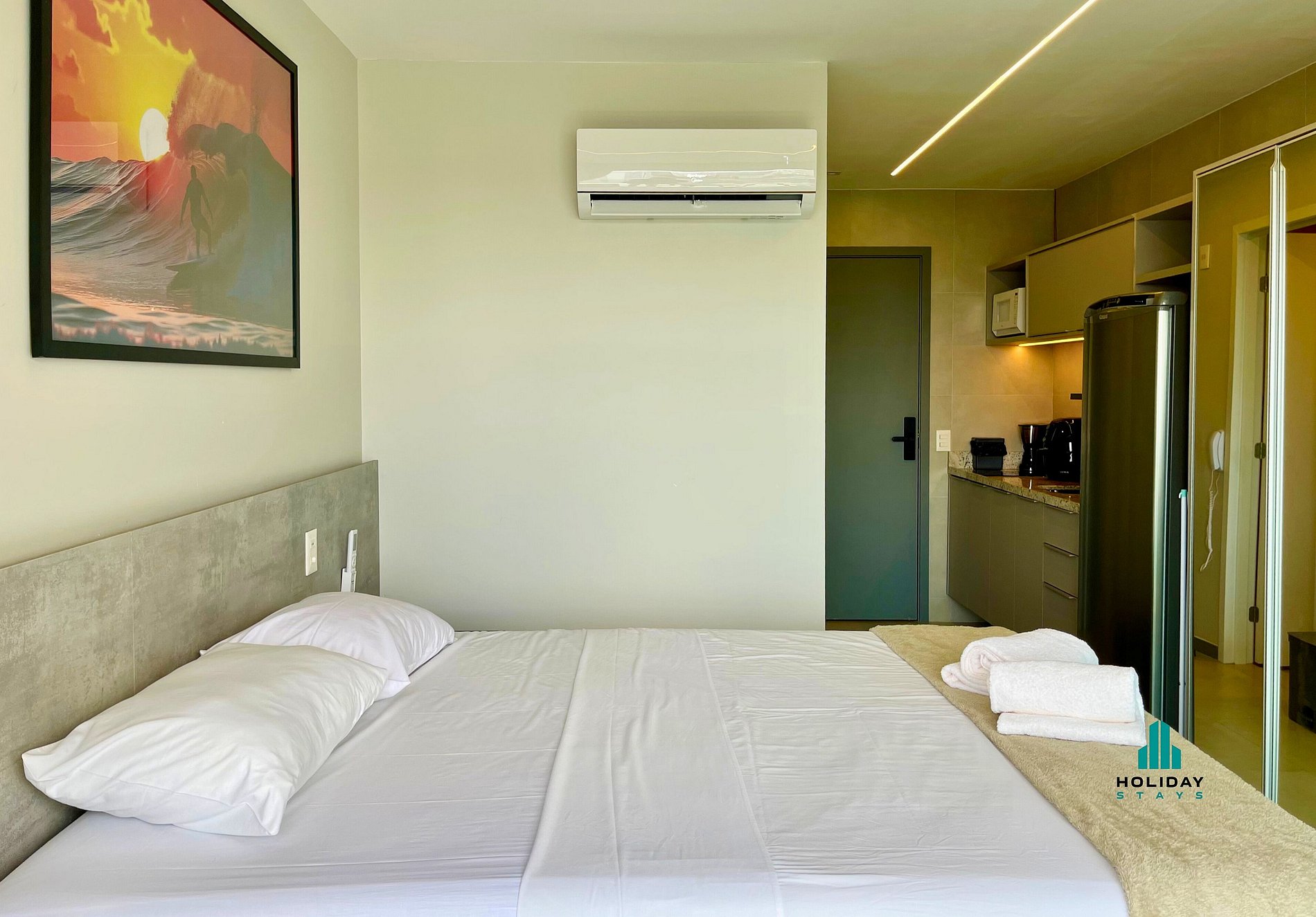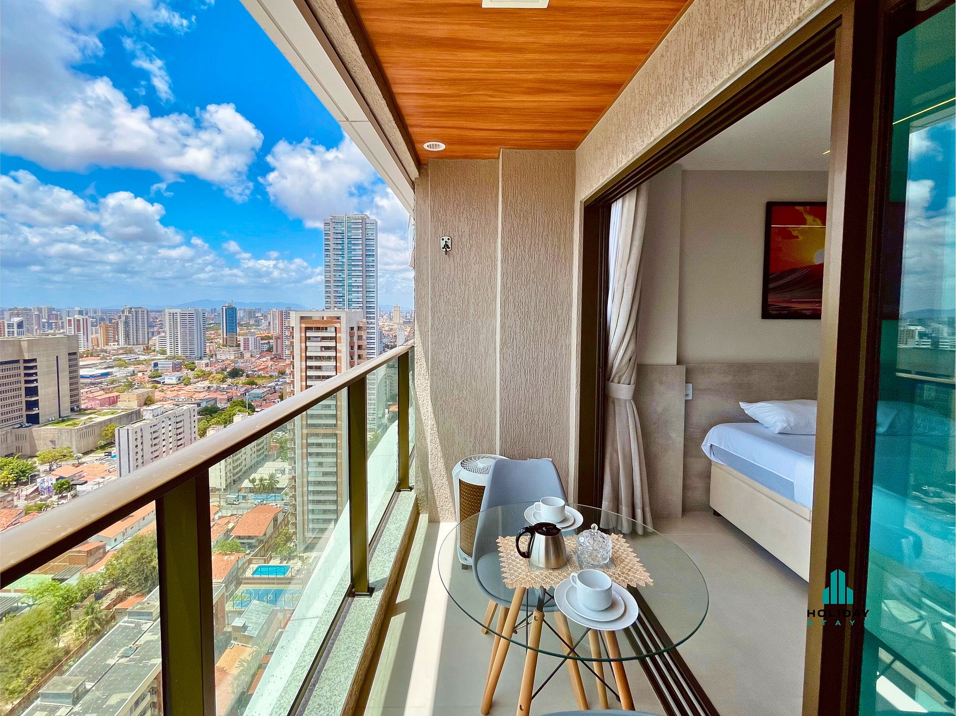 Studio compacto, moderno e super funcional com varanda. Acomoda até 2 pessoas. Conta com cozinha completa e está em edifício com área de lazer completa, no coração do Meireles – o bairro mais desejado de Fortaleza. Ideal para casais, famílias ou viagens a trabalho.