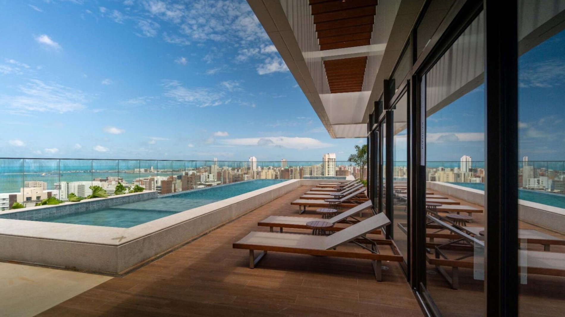 Rooftop completo: piscinas (adulto, infantil e com raia), deck com vista espetacular
