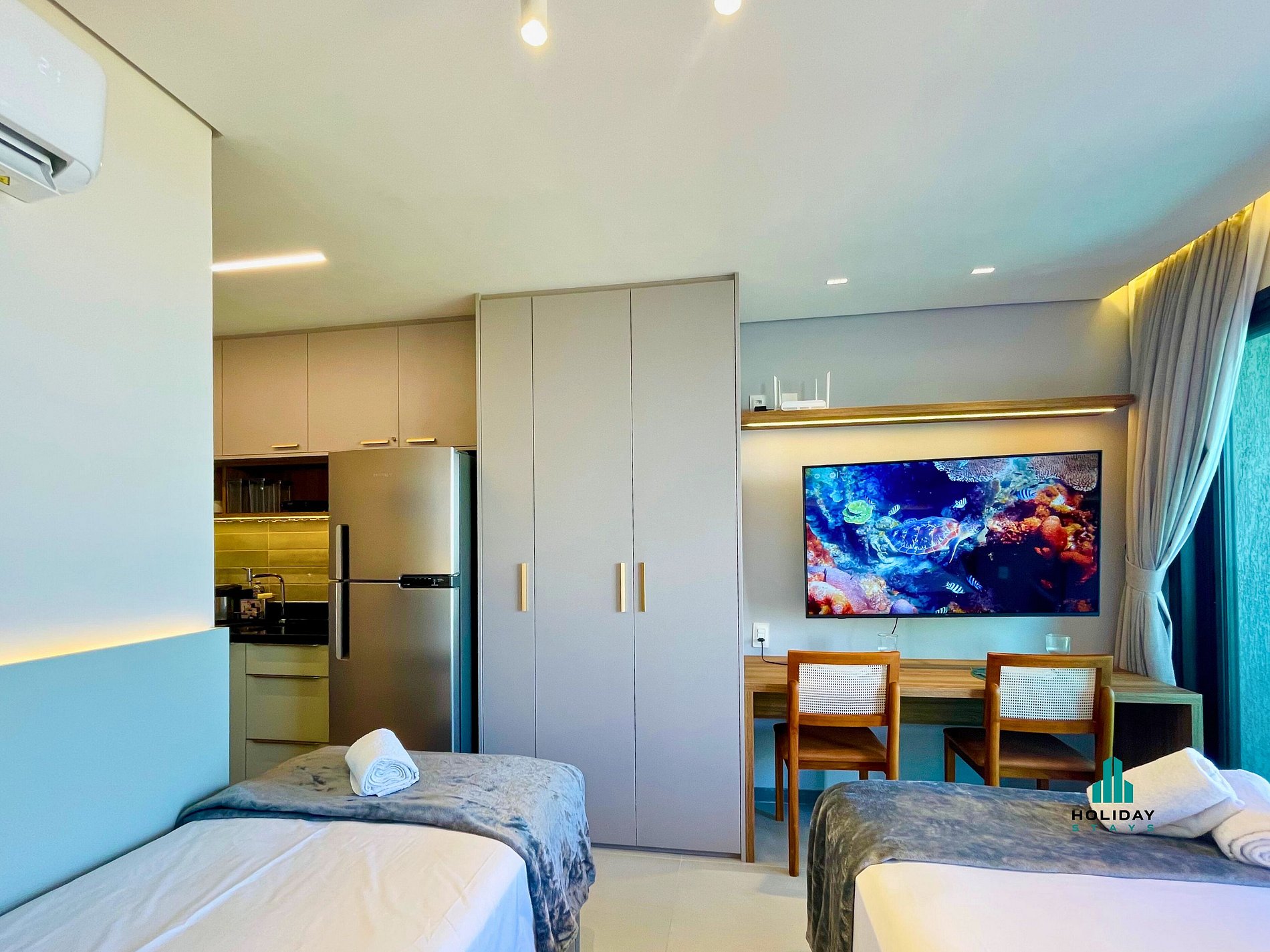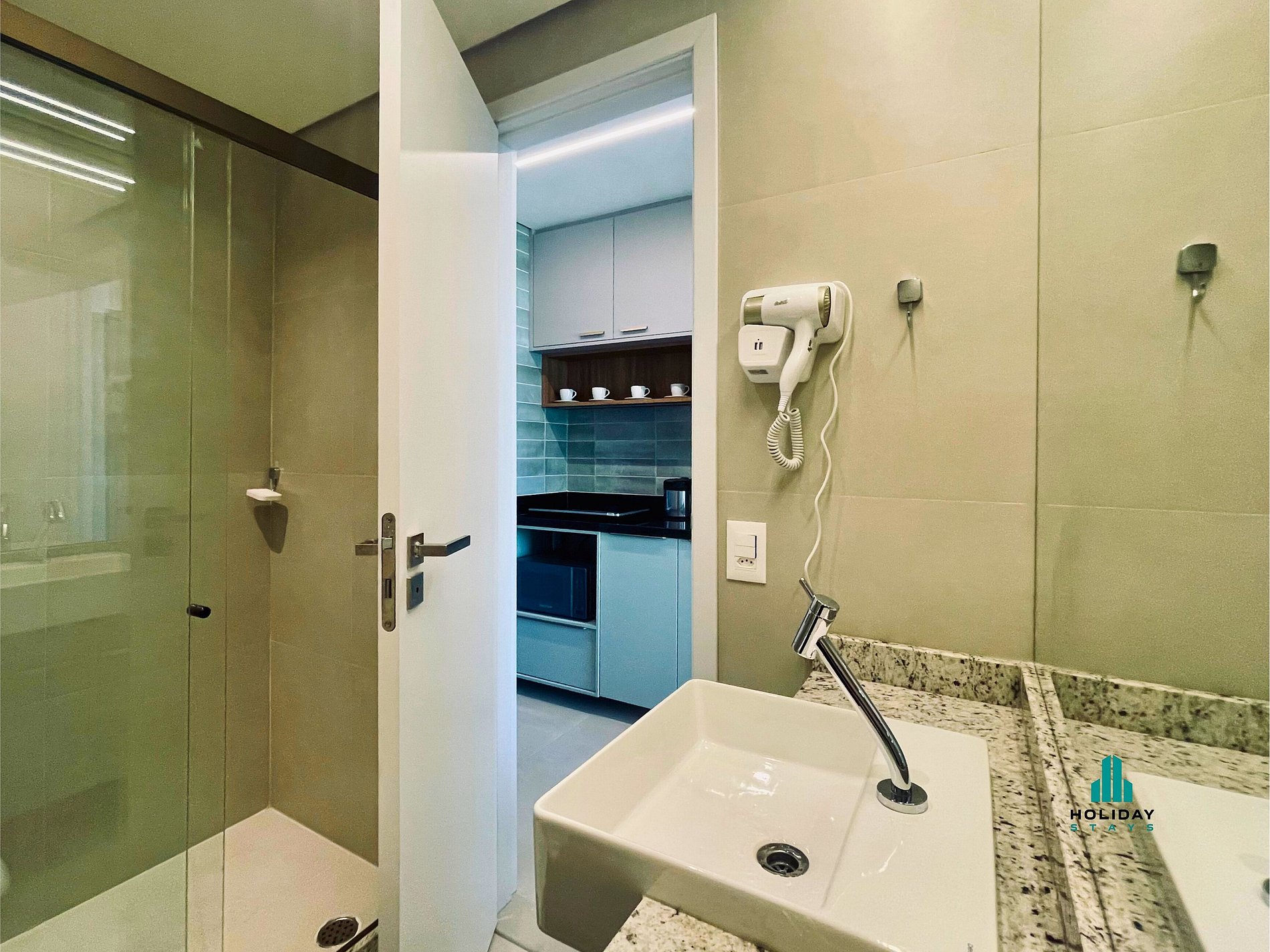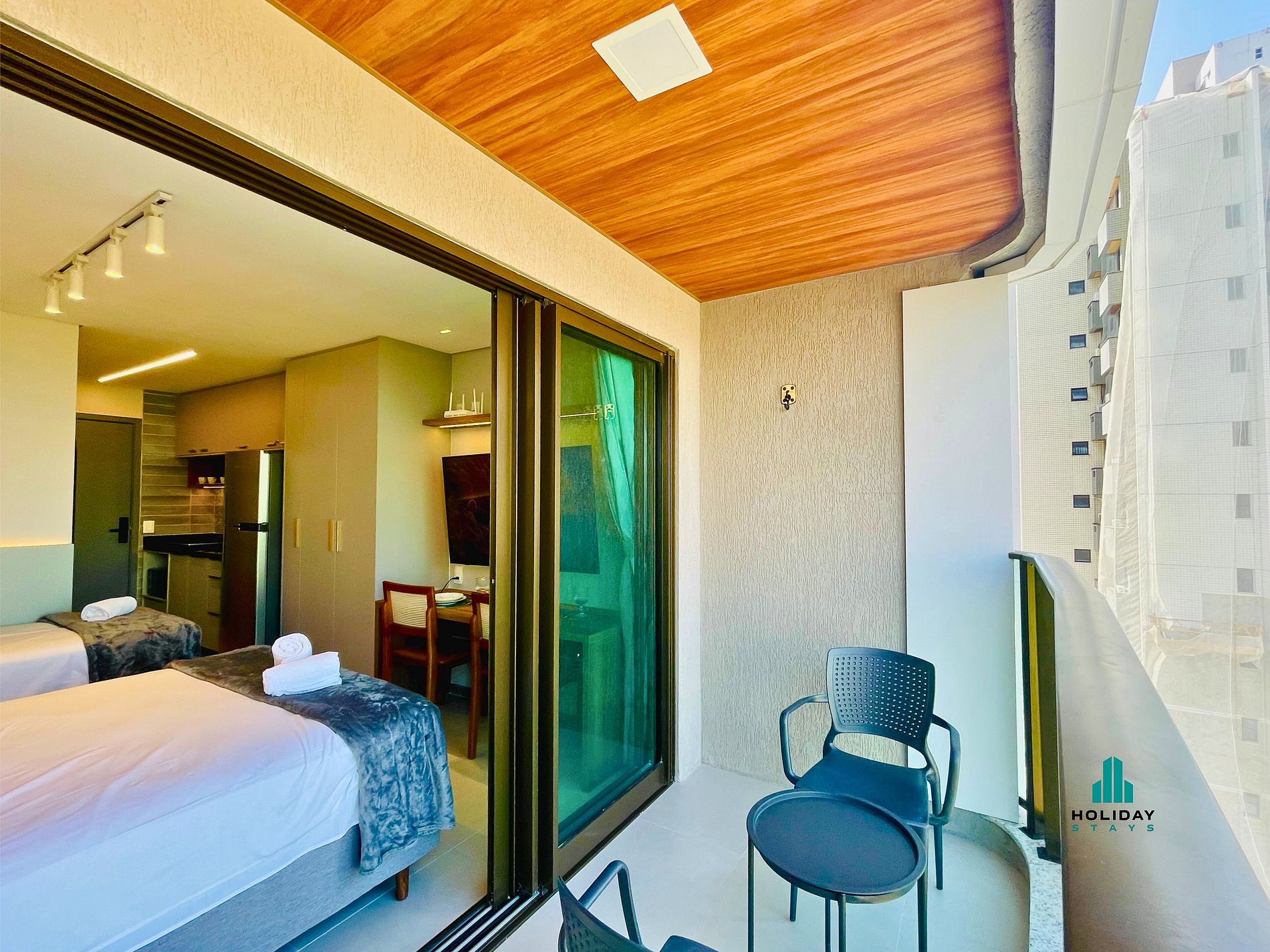 Studio moderno, compacto e funcional, com capacidade para até 4 pessoas. Possui cozinha completa com geladeira, fogão, utensílios, airfryer, micro-ondas e liquidificador — ideal para preparar suas refeições. Conta com 1 cama de casal, 1 bicama, smart TV de 55”, ar-condicionado e banheiro com água quente e secador de cabelo. Varanda ampla com mesa, cadeiras e uma linda vista para a cidade.