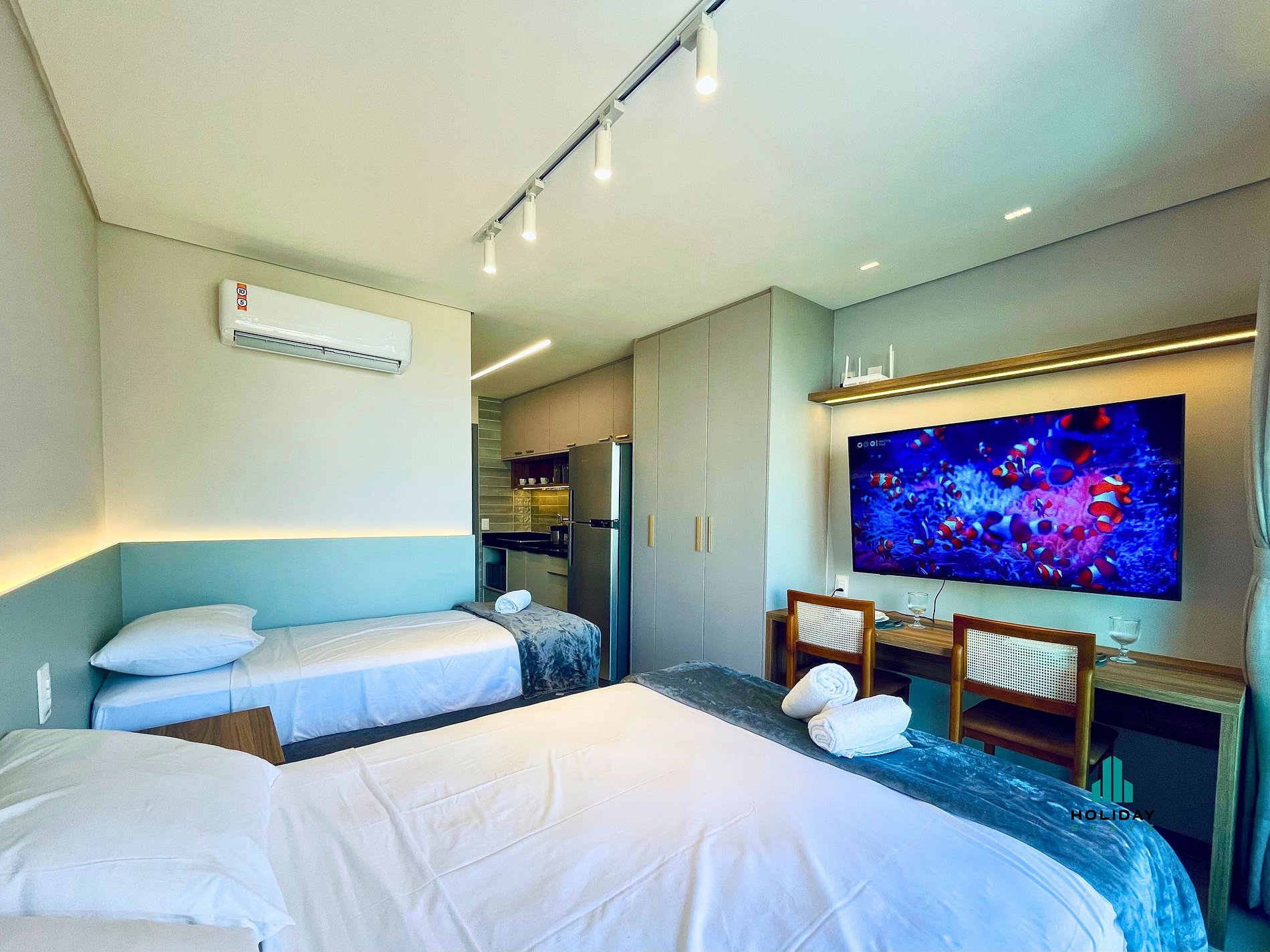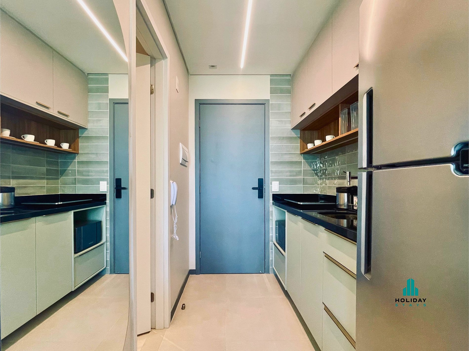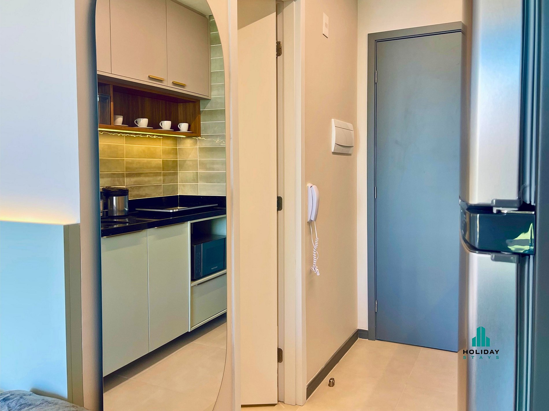 Studio moderno, compacto e funcional, com capacidade para até 4 pessoas. Possui cozinha completa com geladeira, fogão, utensílios, airfryer, micro-ondas e liquidificador — ideal para preparar suas refeições. Conta com 1 cama de casal, 1 bicama, smart TV de 55”, ar-condicionado e banheiro com água quente e secador de cabelo. Varanda ampla com mesa, cadeiras e uma linda vista para a cidade.