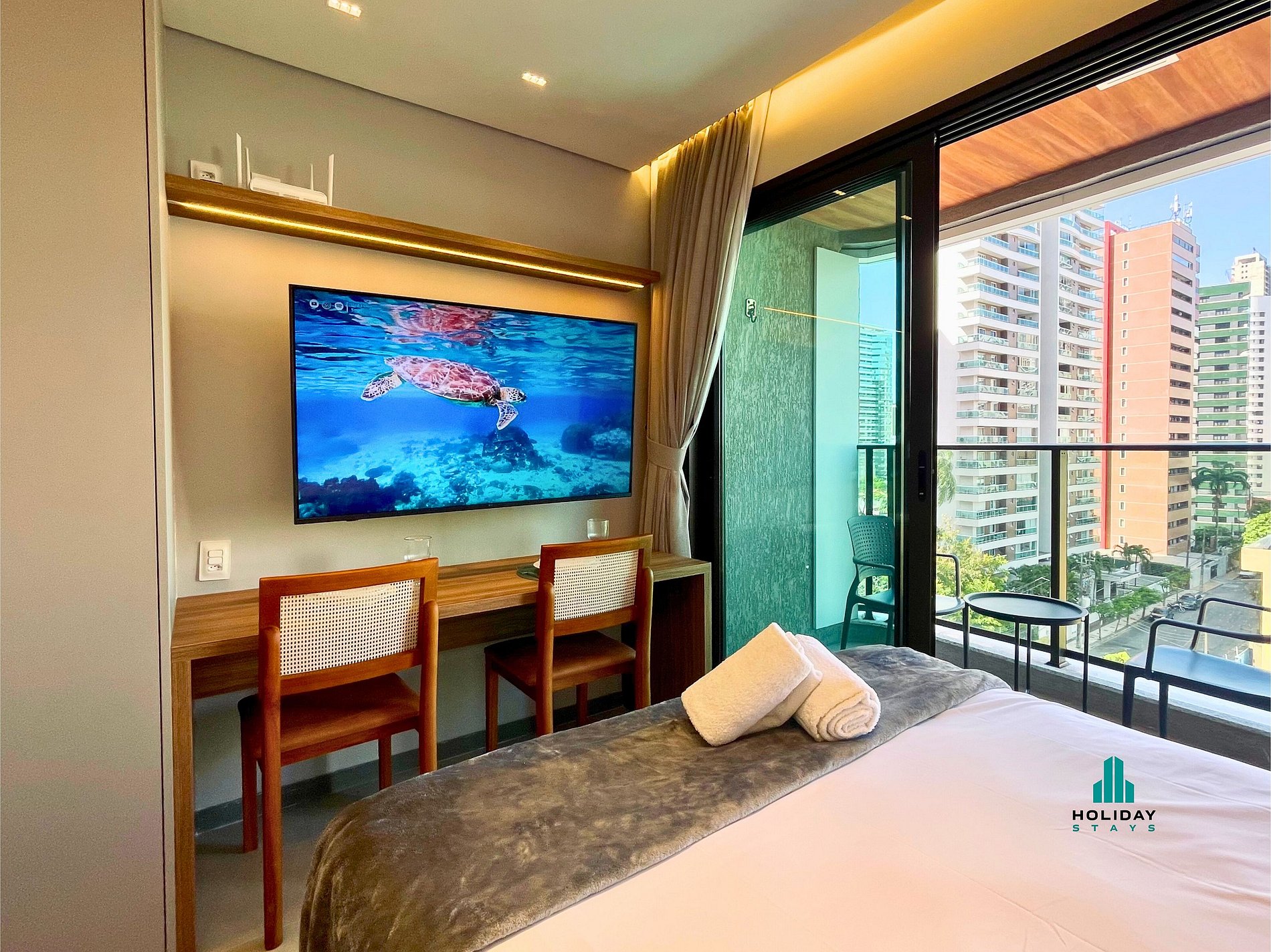 Studio moderno, compacto e funcional, com capacidade para até 4 pessoas. Possui cozinha completa com geladeira, fogão, utensílios, airfryer, micro-ondas e liquidificador — ideal para preparar suas refeições. Conta com 1 cama de casal, 1 bicama, smart TV de 55”, ar-condicionado e banheiro com água quente e secador de cabelo. Varanda ampla com mesa, cadeiras e uma linda vista para a cidade.