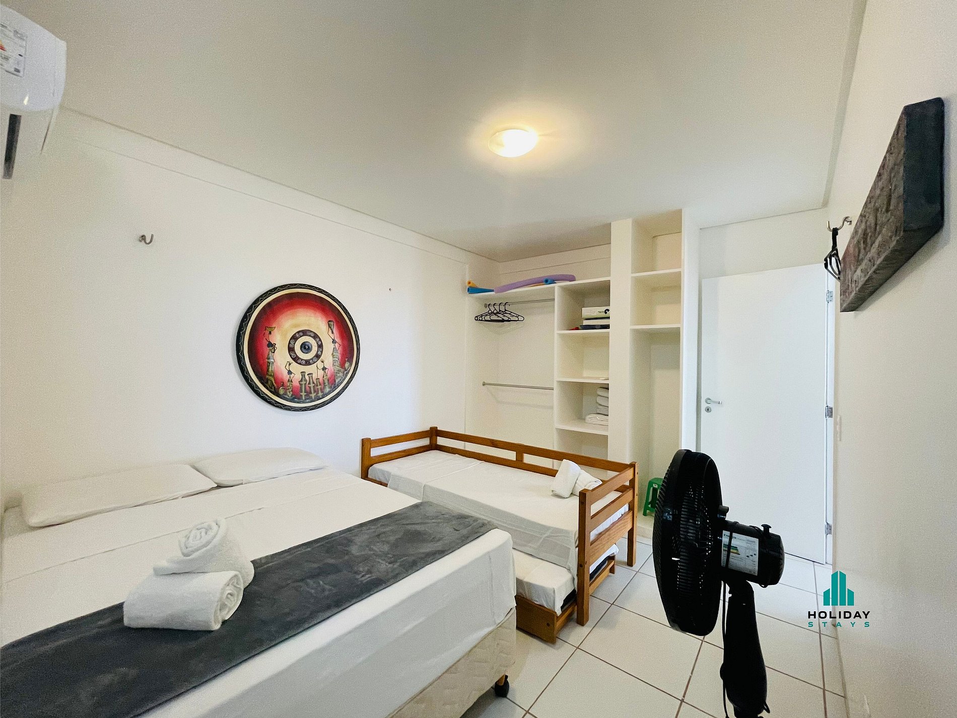 Apartamento confortável no Condomínio Dunnas XXI, ideal para famílias e grupos. Possui 2 quartos: um com cama de casal e cama de solteiro, outro com cama de casal e bicama, ambos com ar-condicionado. Conta com sala com Smart TV, cozinha completa, internet Wi-Fi, 1 banheiro e varanda arejada. O condomínio oferece piscina e estacionamento, a poucos minutos do Beach Park e da Praia do Porto das Dunas.