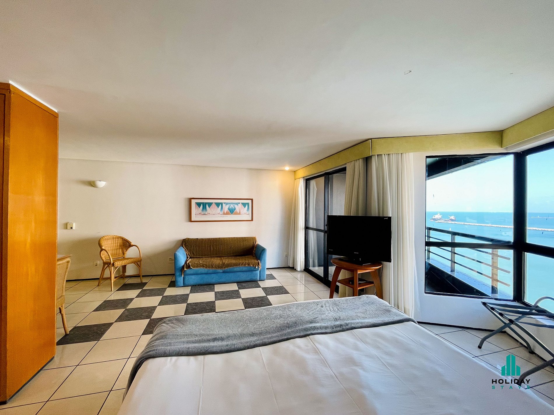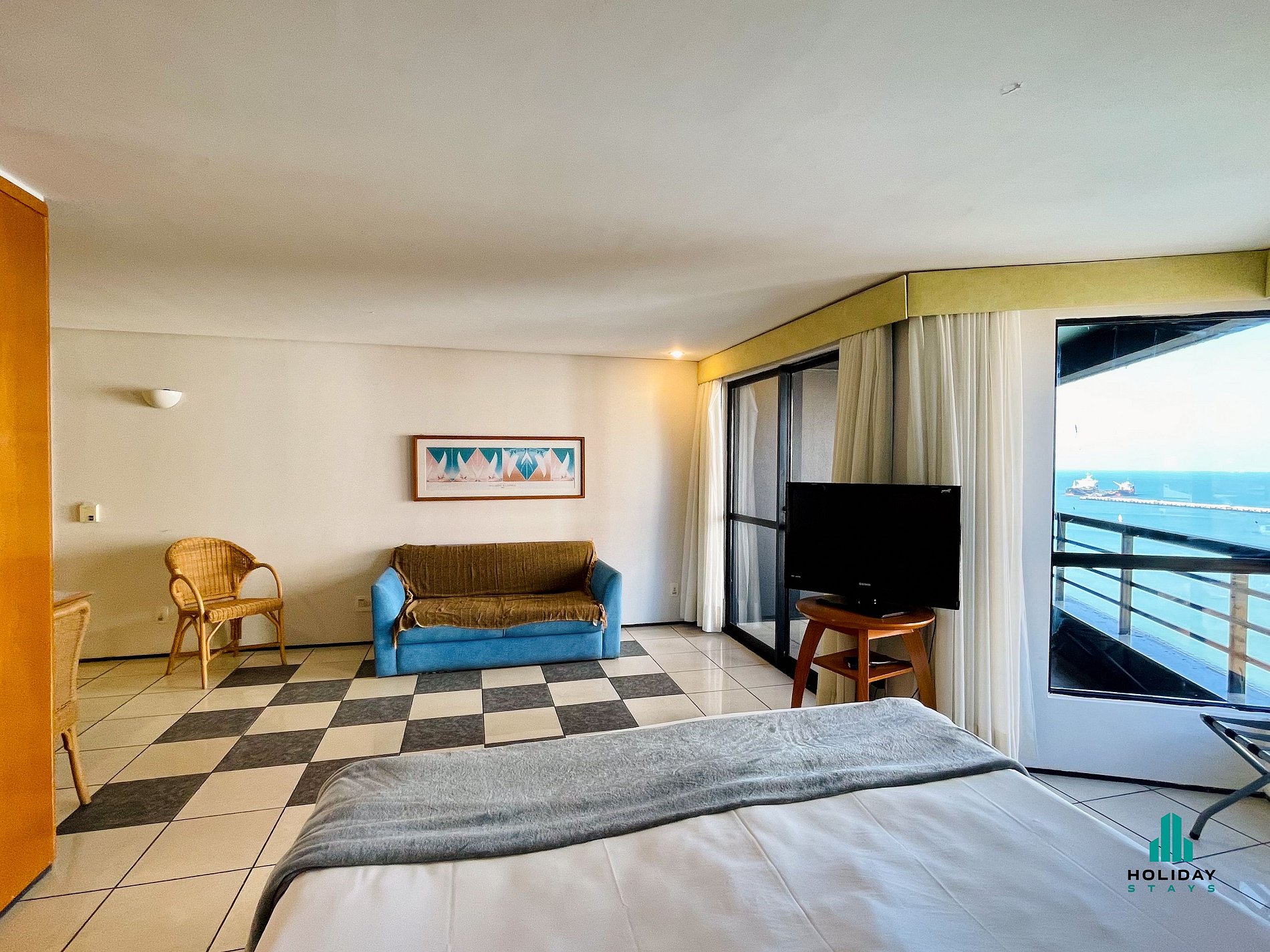 Studio com vista espetacular do mar. Ambiente integrado, com cama queen + colchão casal , ar-condicionado e área de estar. Cozinha americana equipada com cooktop de indução (1 boca), frigobar, micro-ondas, liquidificador, chaleira elétrica e utensílios para preparo de pequenas refeições. Banheiro com chuveiro quente e secador de cabelo. O grande destaque é a varanda com mesa e cadeiras, proporcionando uma vista deslumbrante do mar.