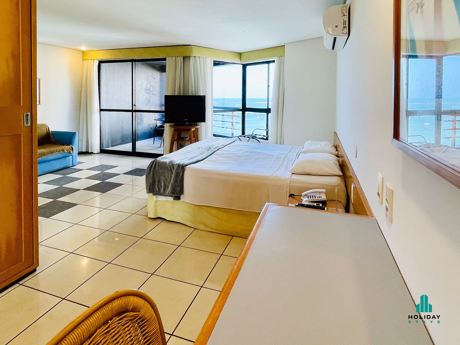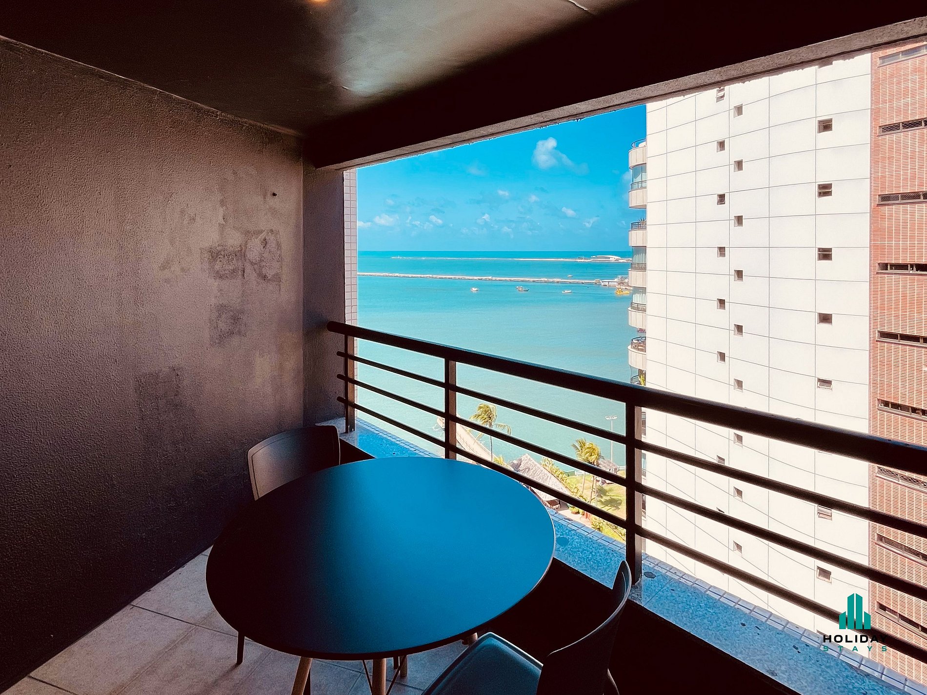 Studio com vista espetacular do mar. Ambiente integrado, com cama queen + colchão casal , ar-condicionado e área de estar. Cozinha americana equipada com cooktop de indução (1 boca), frigobar, micro-ondas, liquidificador, chaleira elétrica e utensílios para preparo de pequenas refeições. Banheiro com chuveiro quente e secador de cabelo. O grande destaque é a varanda com mesa e cadeiras, proporcionando uma vista deslumbrante do mar.