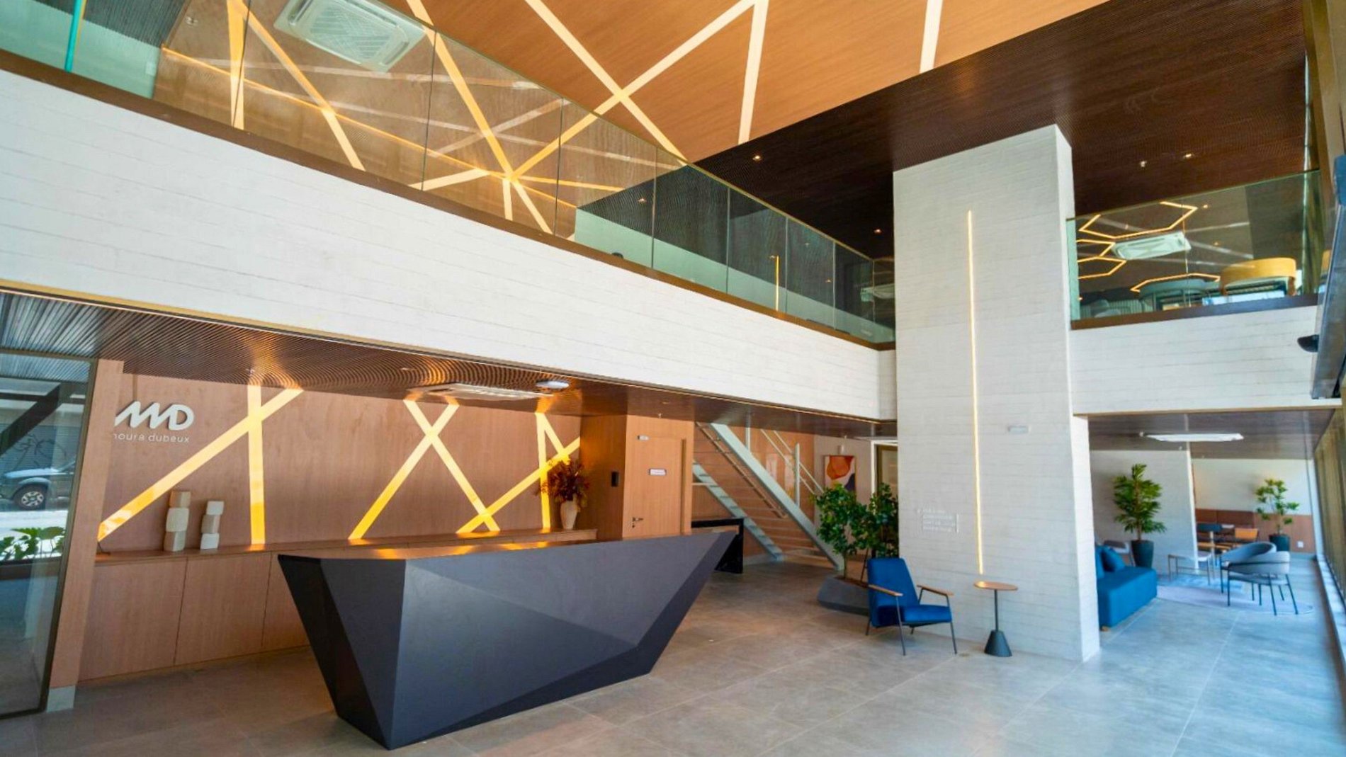Lobby sofisticado, hall elegante e portaria com recepção 24h