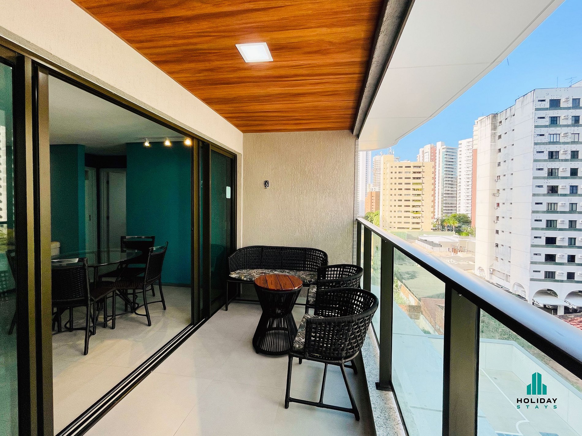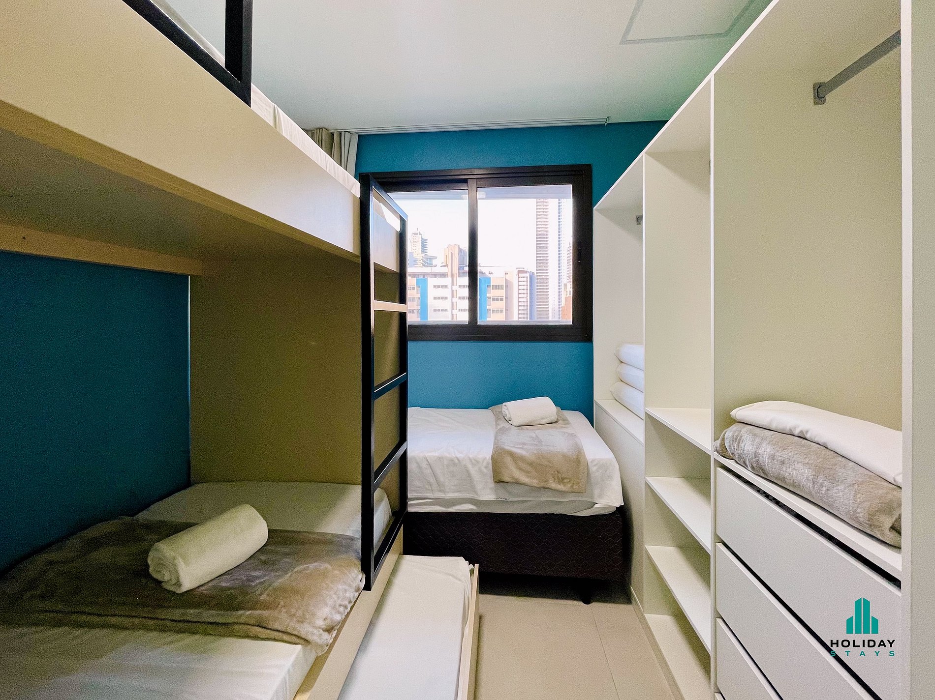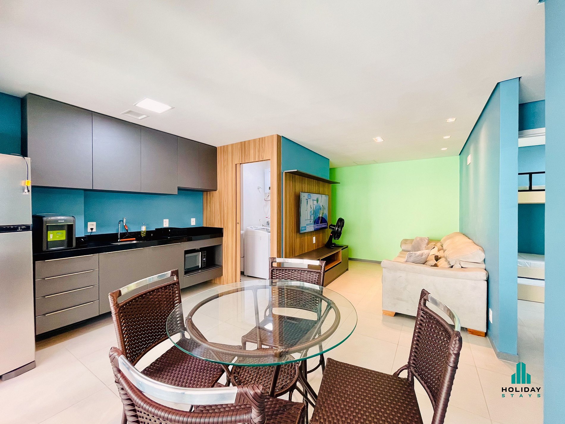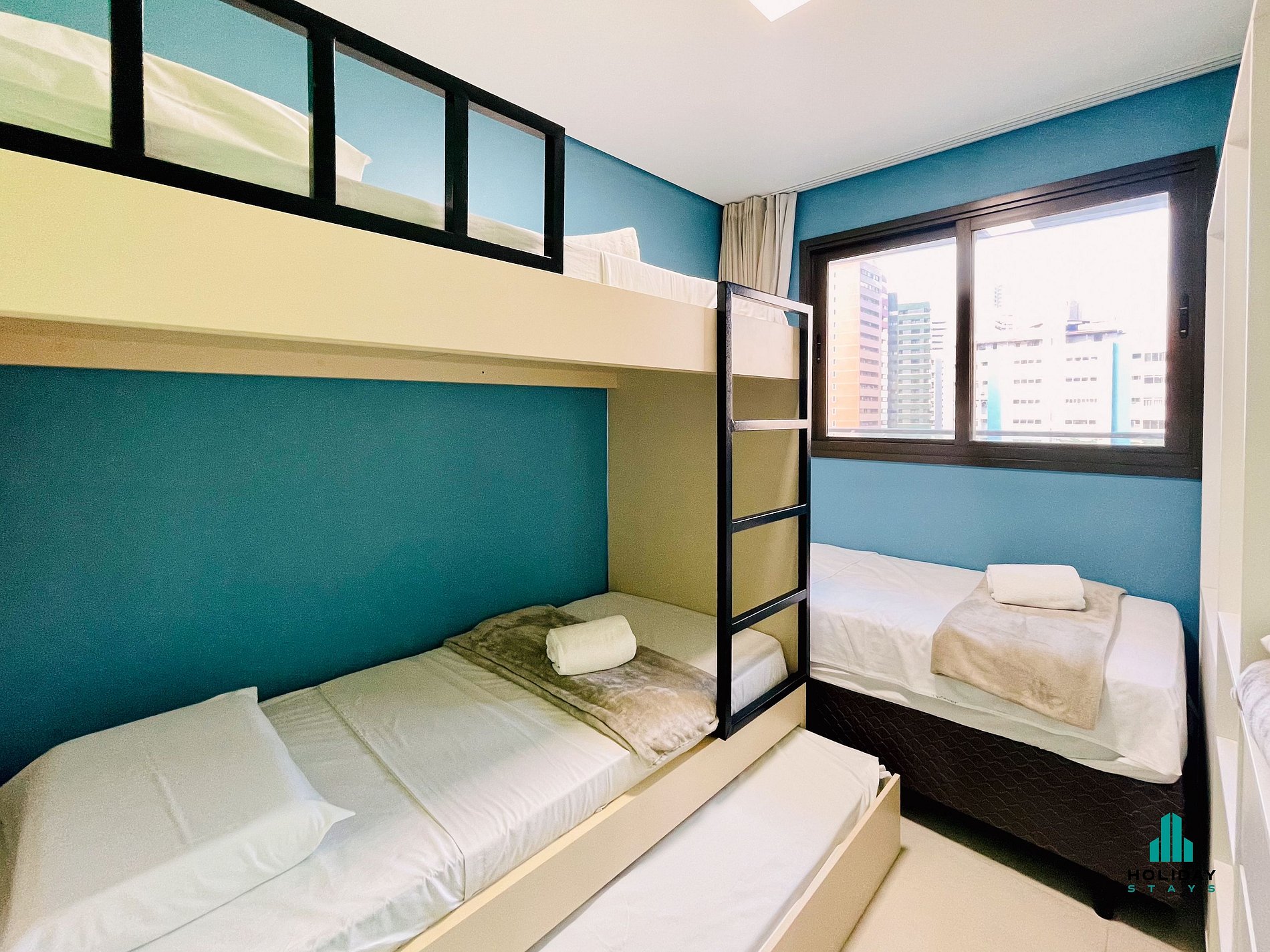 Apartamento familiar no Beach Class Meireles, confortável e funcional, ideal para famílias e grupos. Quarto 1 com cama queen, ar-condicionado e TV 55”. Quarto 2 com ar-condicionado, beliche para 3 pessoas e cama de solteiro. Sala com sofá e TV 55”, área de jantar com mesa e cadeiras e varanda grande com mesa e cadeiras. Cozinha completa com cooktop, micro-ondas, air fryer, máquina de lavar e utensílios. Dois banheiros com água quente. Wi-Fi e estacionamento.