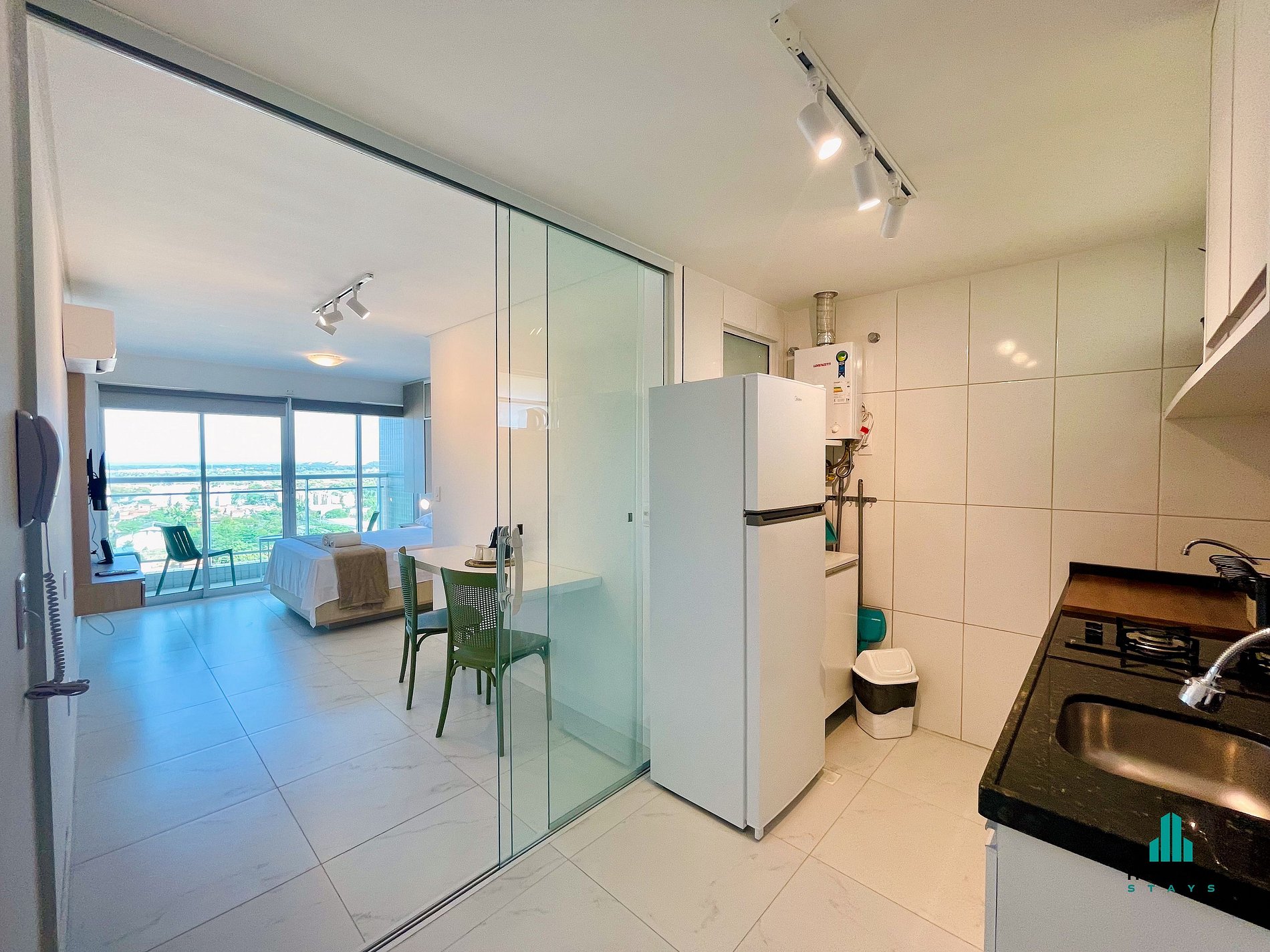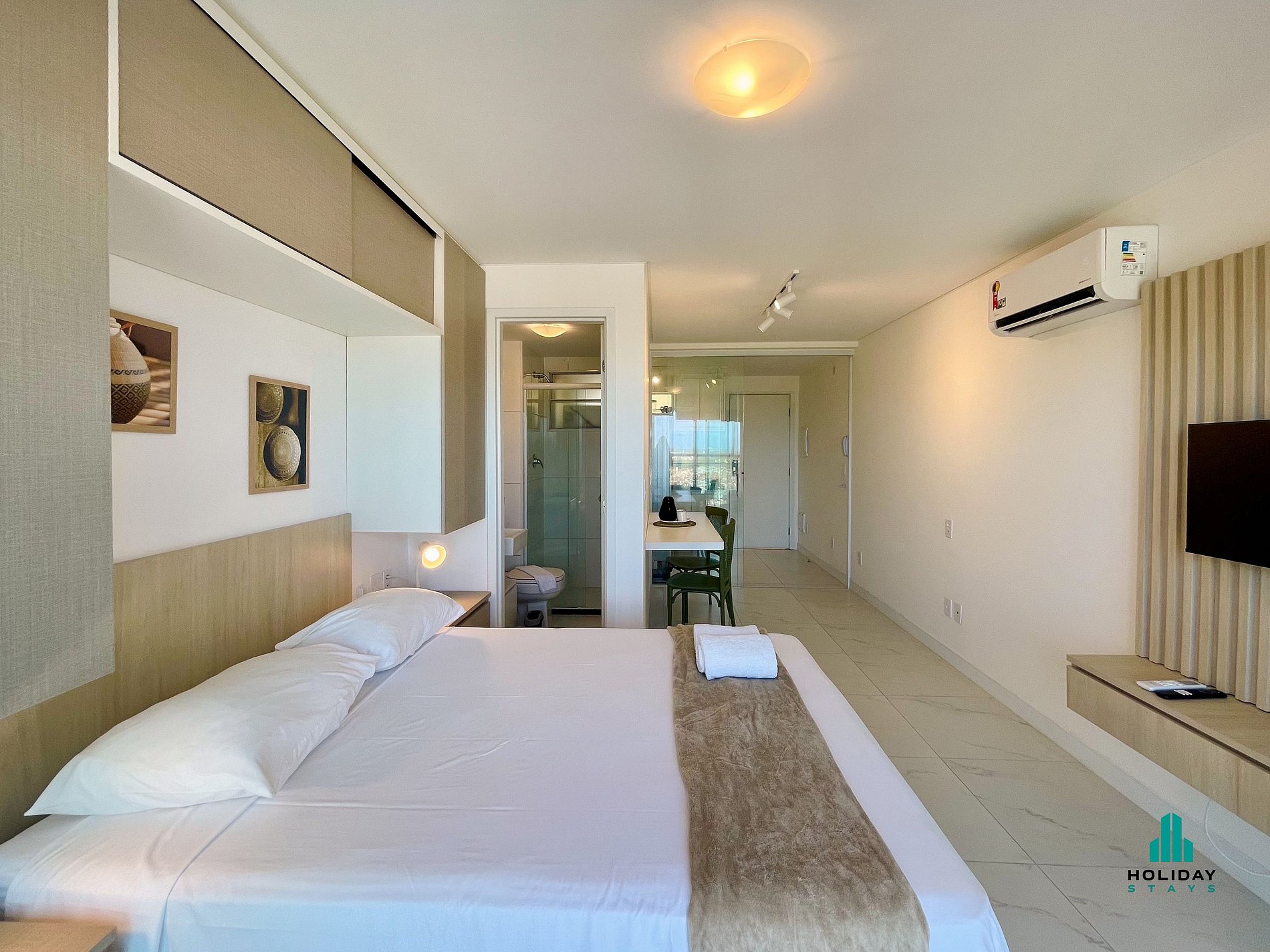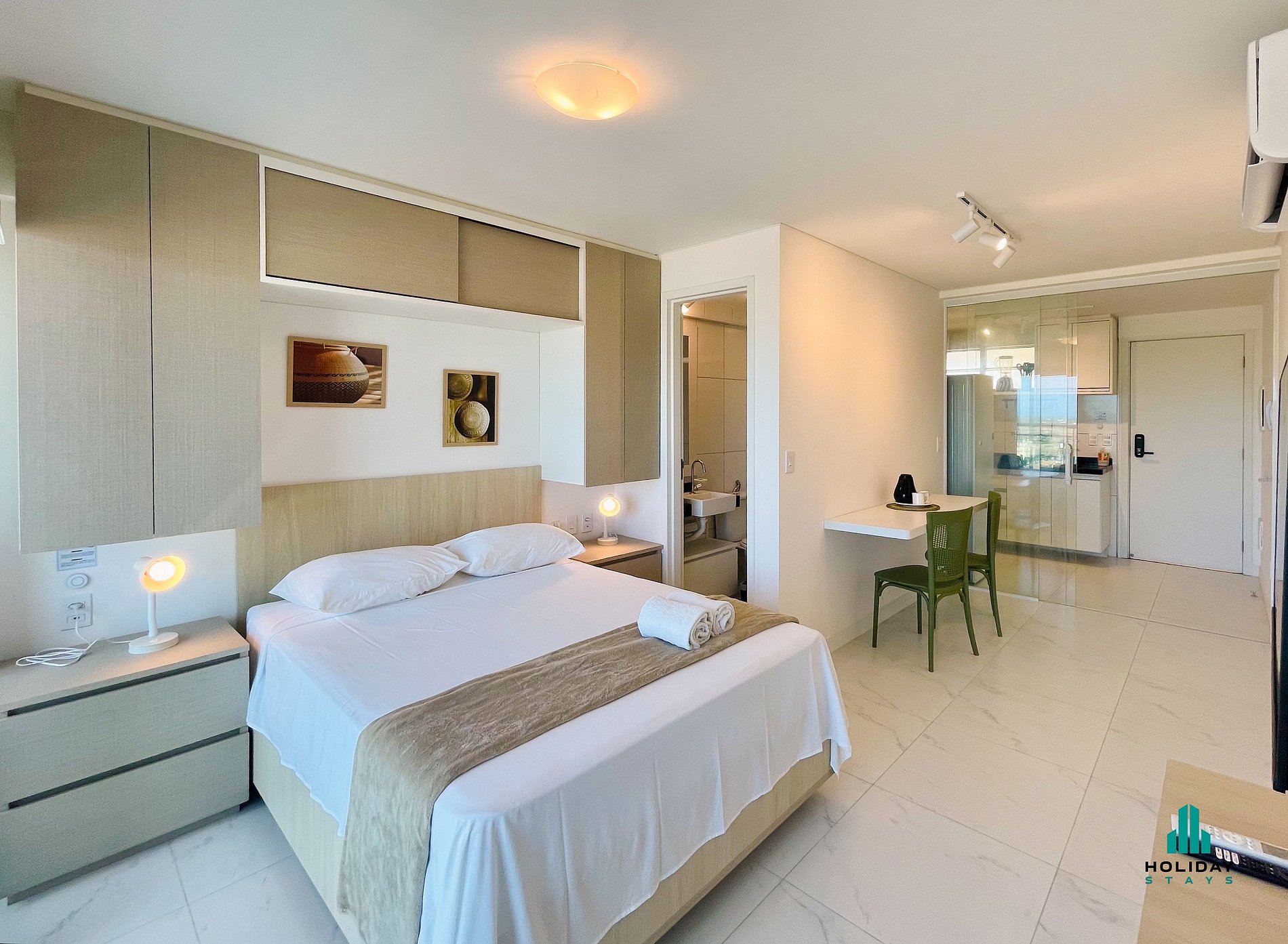 Studio moderno em condomínio com lazer completo, perfeito para quem busca conforto, praticidade e excelente localização. O apartamento é aconchegante, funcional e bem equipado, ideal tanto para lazer quanto para trabalho. Possui cama de casal confortável, cozinha completa com utensílios, TV e internet Wi-Fi, banheiro com água quente, armários planejados e espaço bem distribuído. A varanda privativa é ideal para relaxar após um dia cheio. Conta ainda com vaga de garagem e fechadura eletrônica.