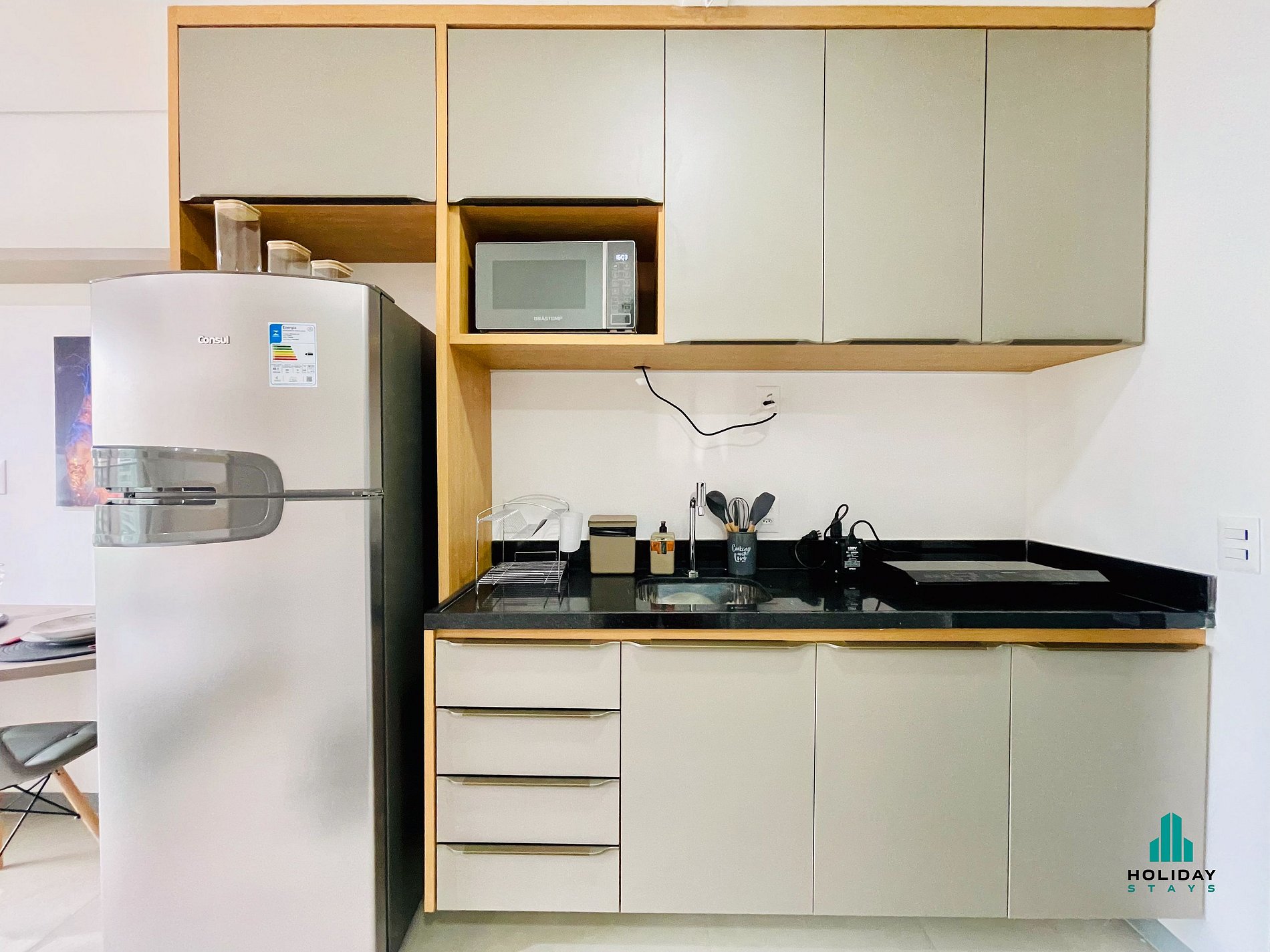 Studio compacto, moderno e funcional, totalmente equipado, com varanda e vista para a cidade. Acomoda até 2 pessoas e dispõe de cozinha completa com airfryer, cafeteira, ferro de passar, secador, micro-ondas, sanduicheira e fogão de indução de 2 bocas.