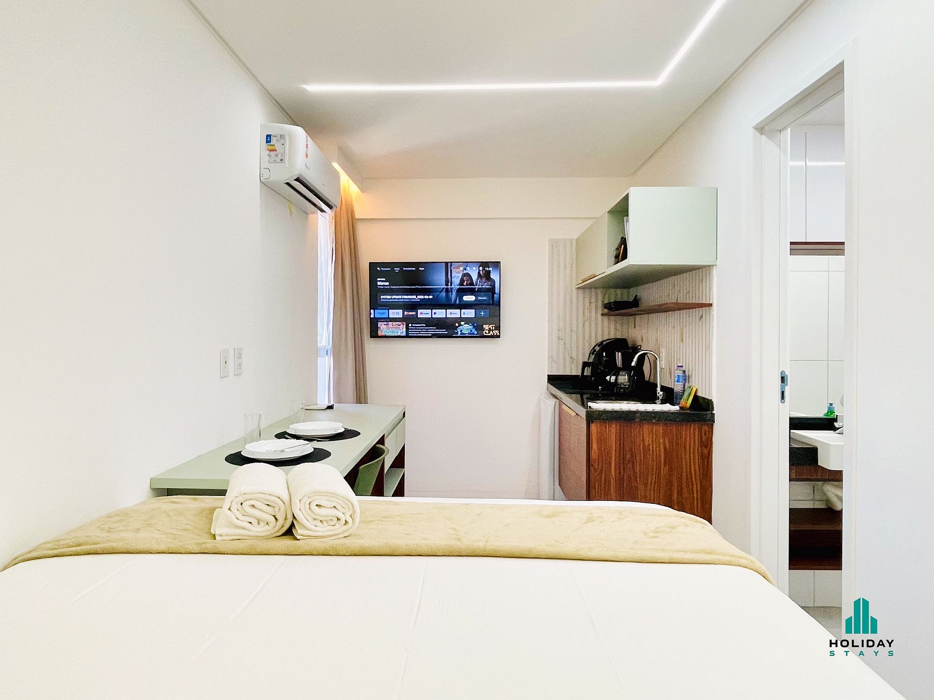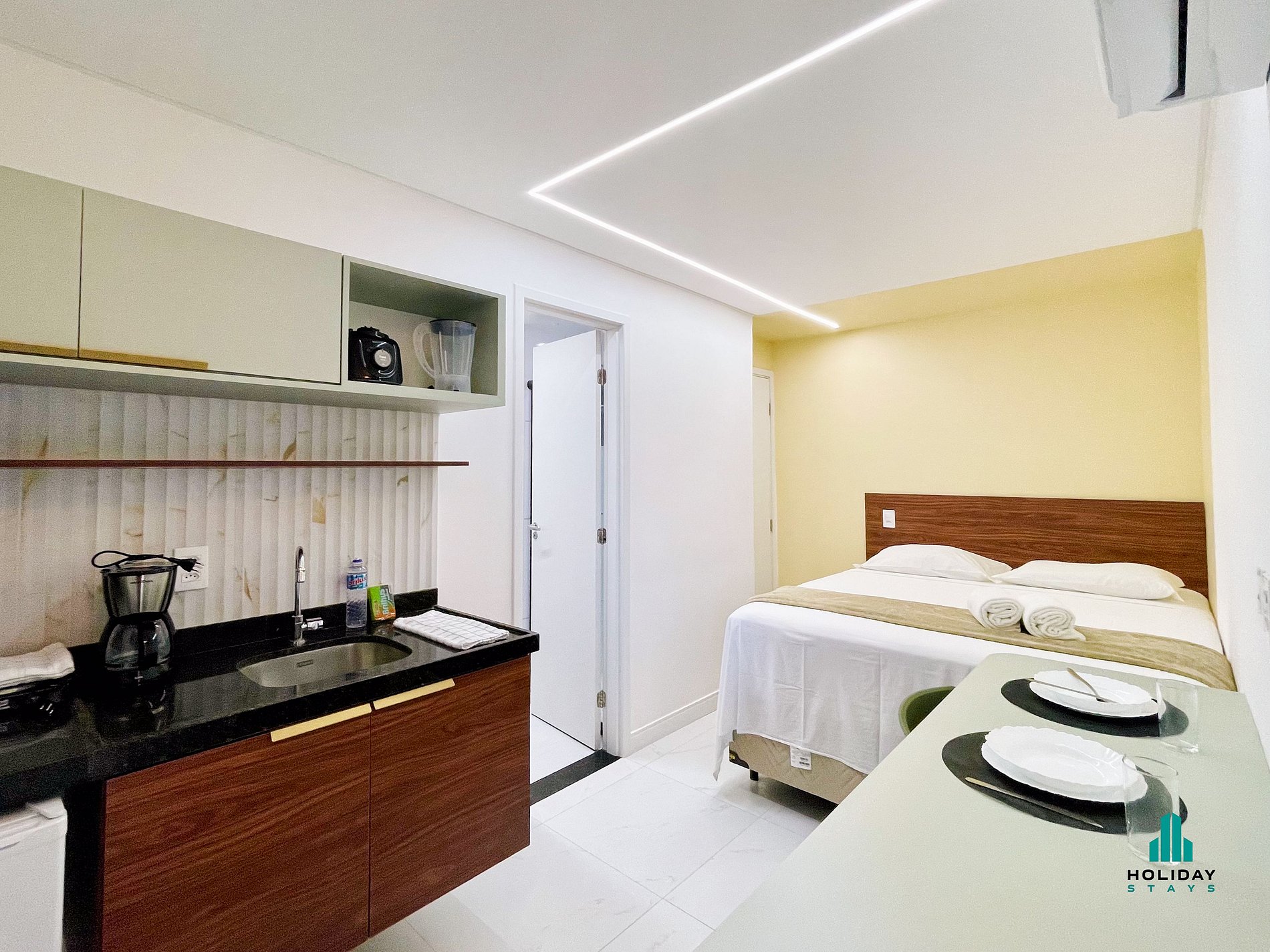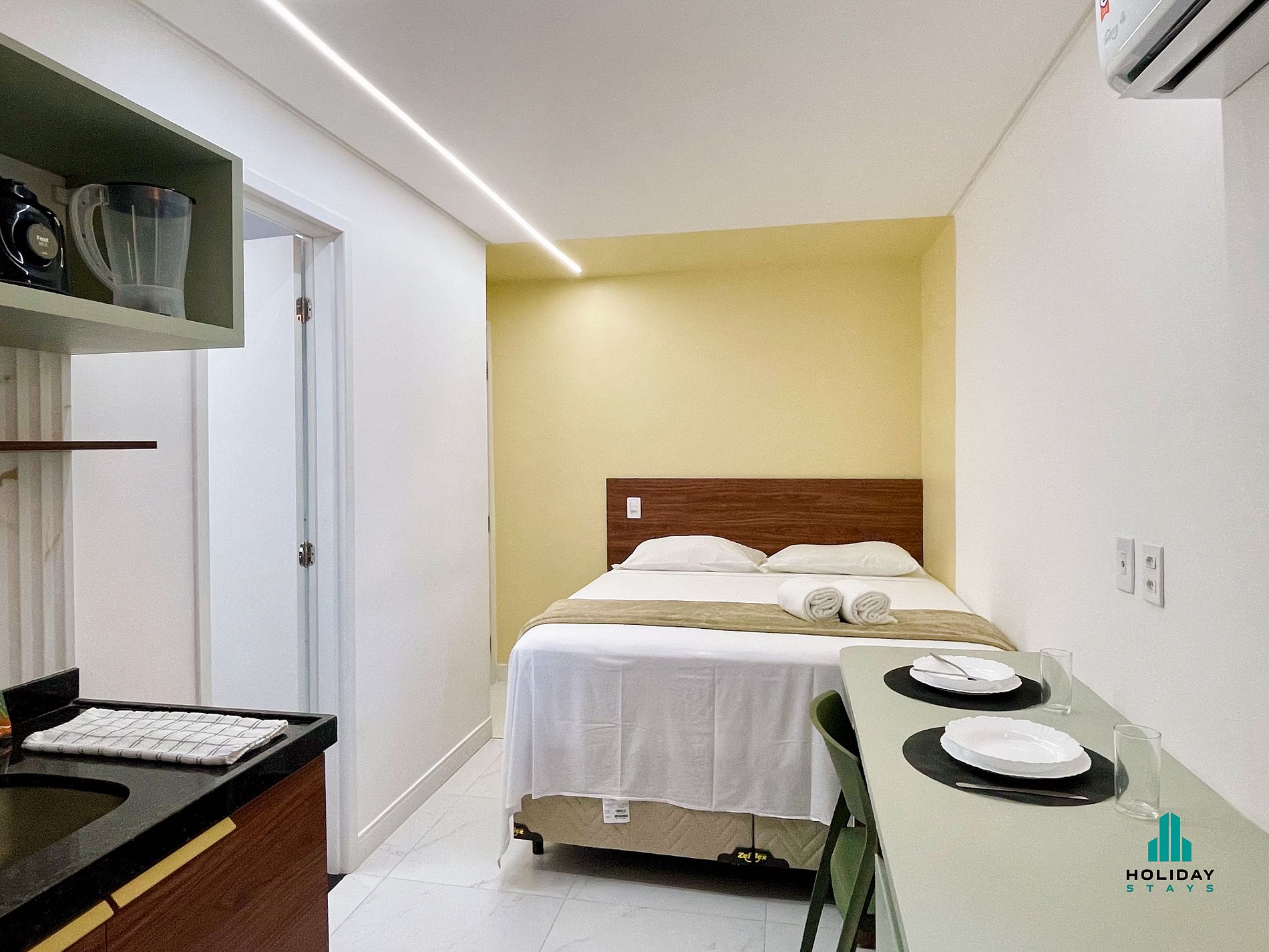 Estúdio compacto, moderno e funcional. Ambiente único com cama de casal, mesa para trabalho ou refeições e cozinha equipada com fogão elétrico, airfryer, sanduicheira, chaleira elétrica, liquidificador e cafeteira. Banheiro com secador de cabelo. Ideal para estadias curtas, oferece conforto, praticidade e estilo em um espaço bem planejado.