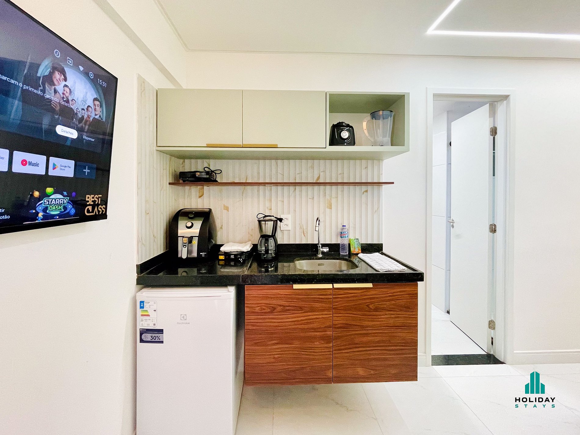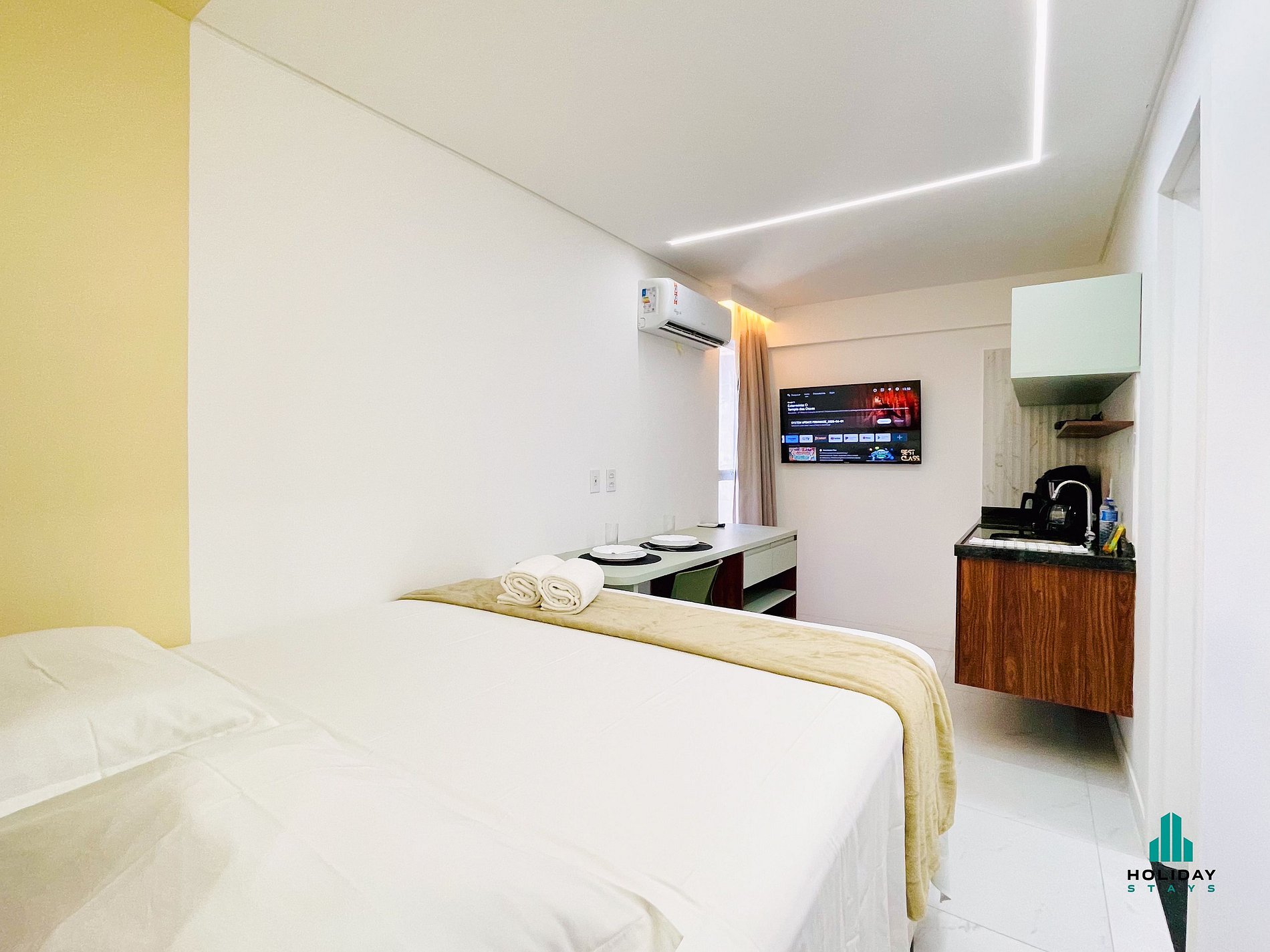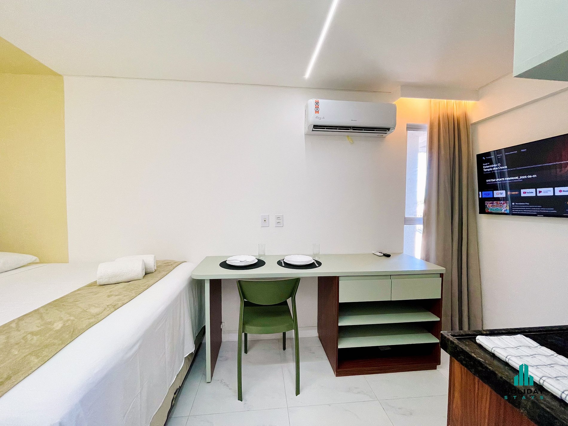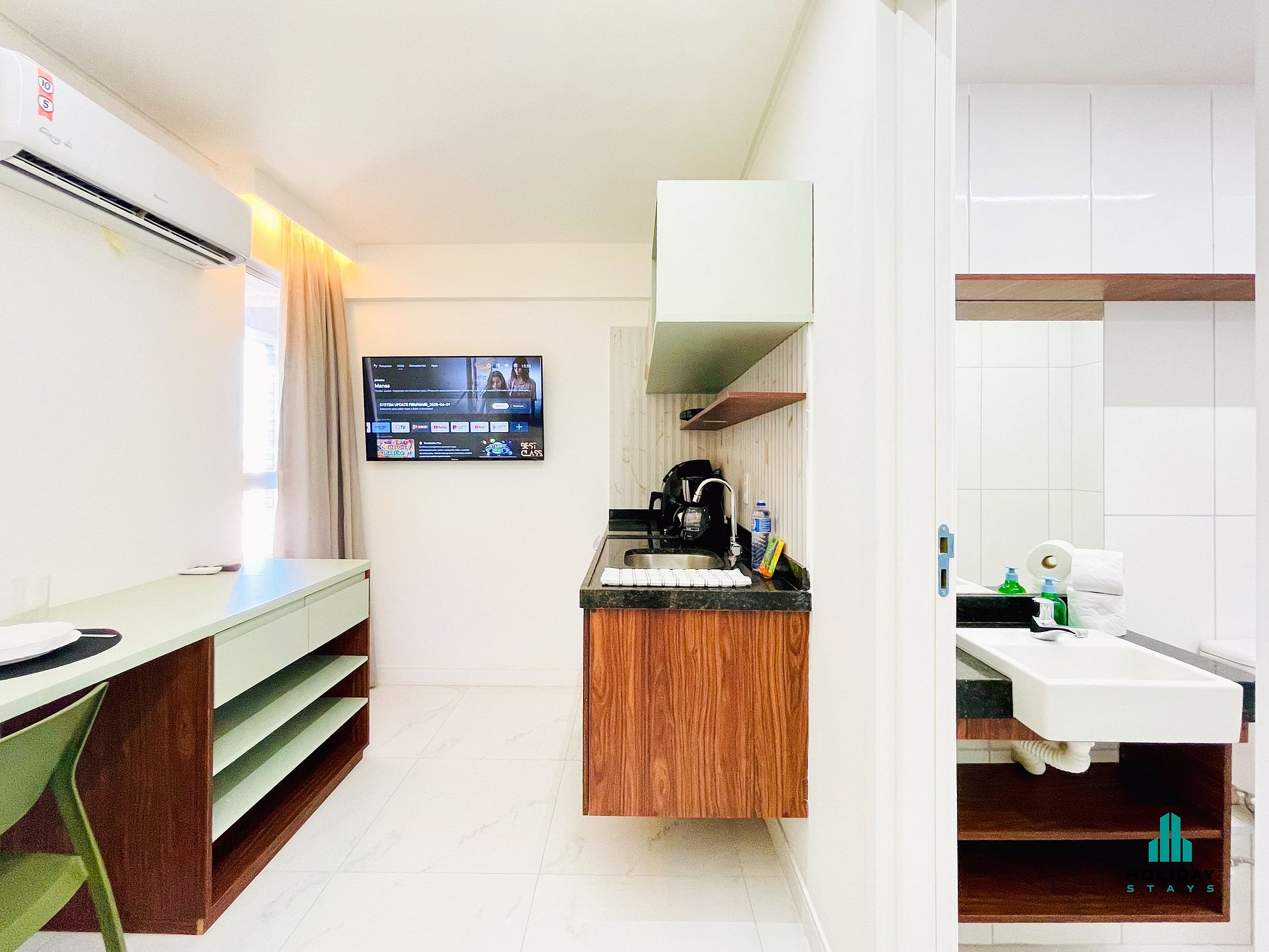 Estúdio compacto, moderno e funcional. Ambiente único com cama de casal, mesa para trabalho ou refeições e cozinha equipada com fogão elétrico, airfryer, sanduicheira, chaleira elétrica, liquidificador e cafeteira. Banheiro com secador de cabelo. Ideal para estadias curtas, oferece conforto, praticidade e estilo em um espaço bem planejado.
