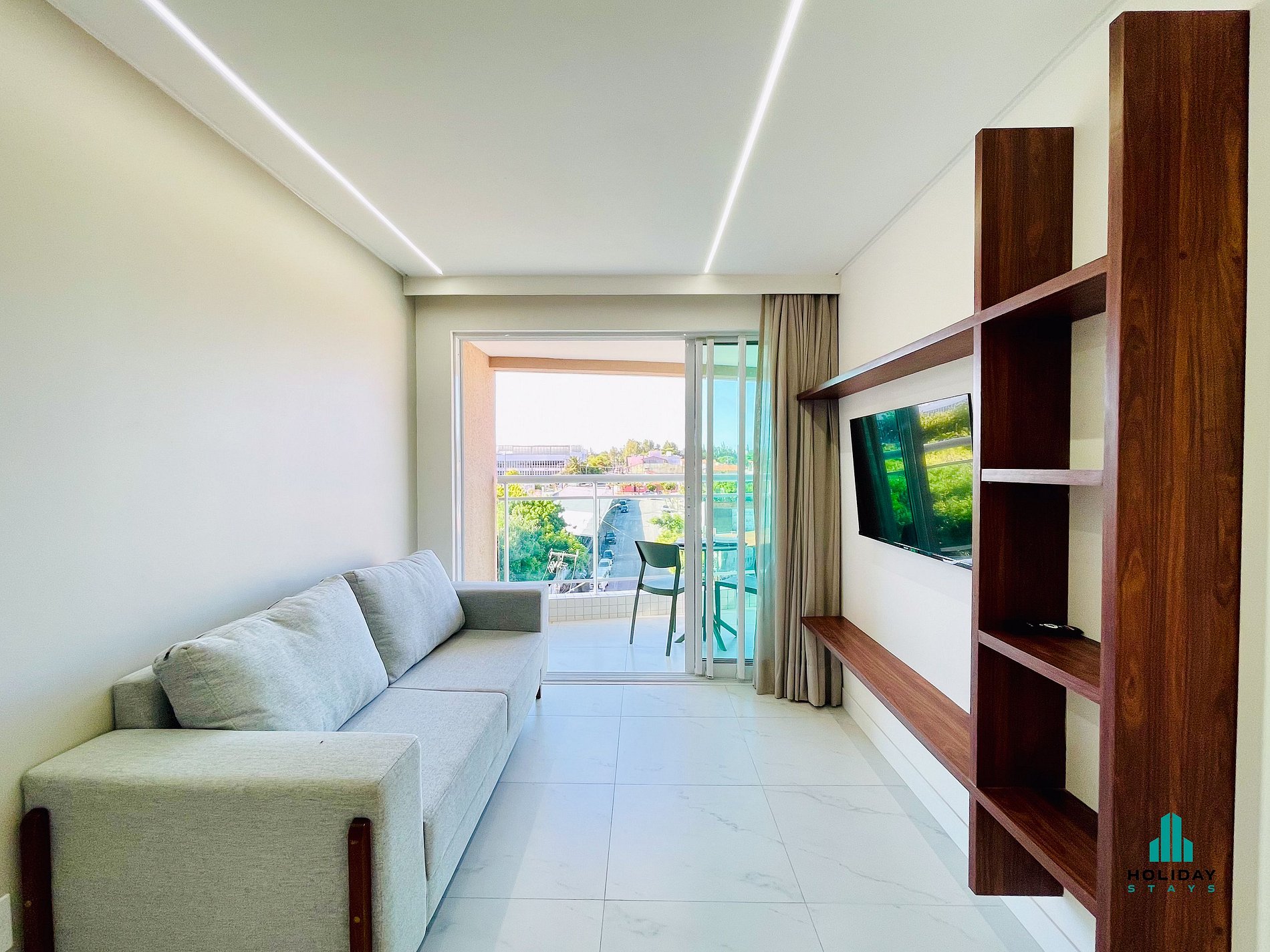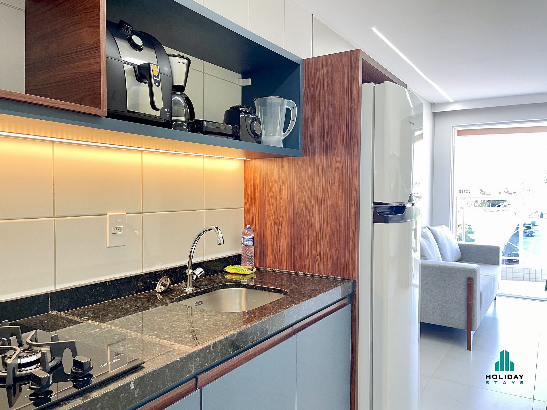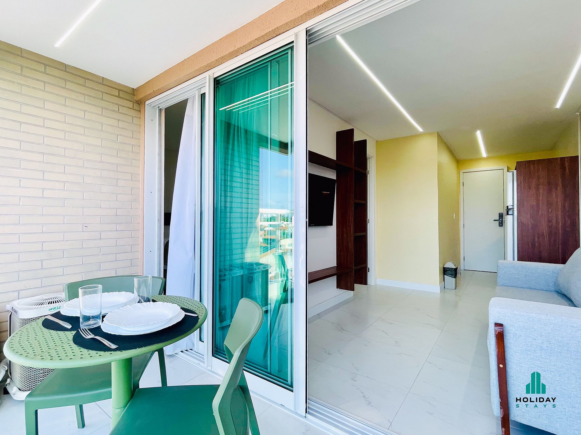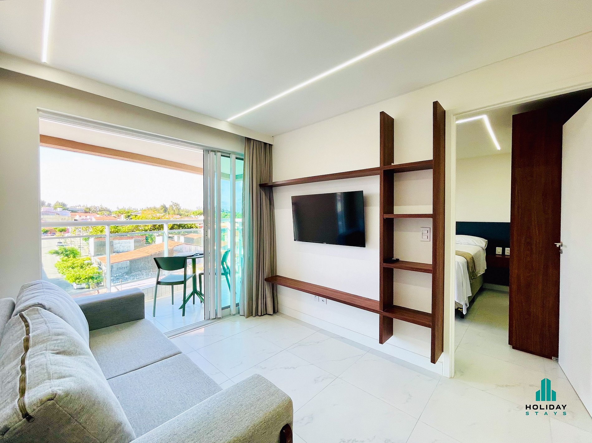 Apartamento moderno e funcional com sala, sofá e TV smart de 43 polegadas, varanda com mesa e cadeiras, cozinha completa equipada com geladeira, fogão duas bocas, airfryer, liquidificador, sanduicheira e cafeteira. Suíte com cama queen, TV de 43 polegadas, banheiro com chuveiro quente e secador de cabelo.