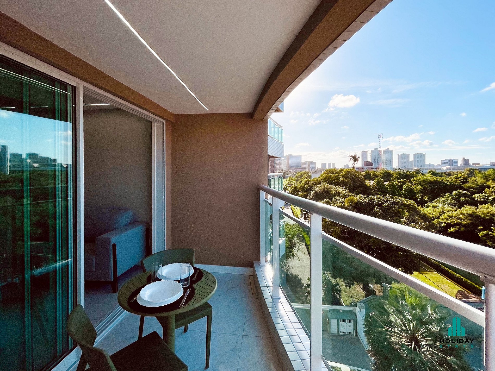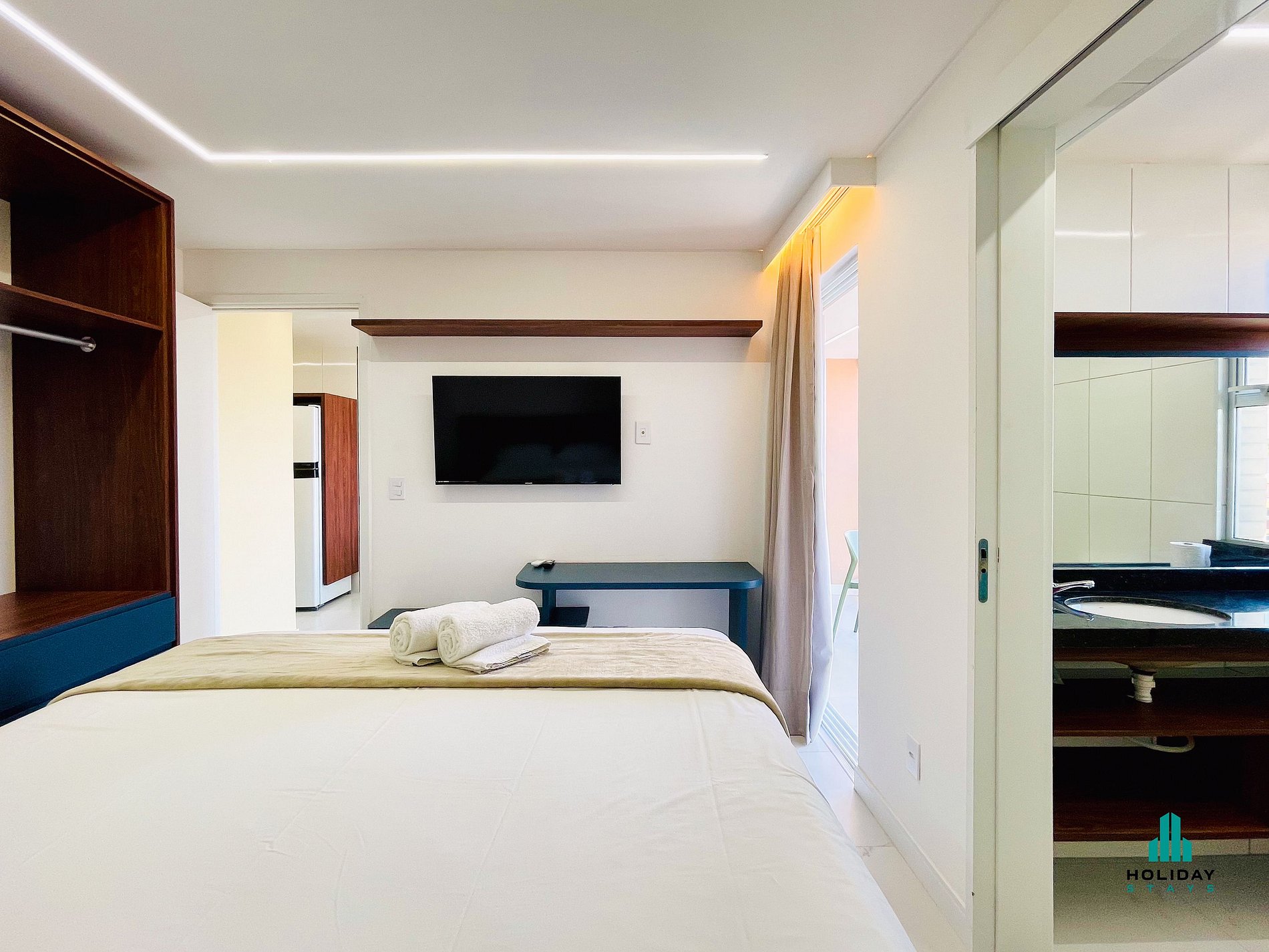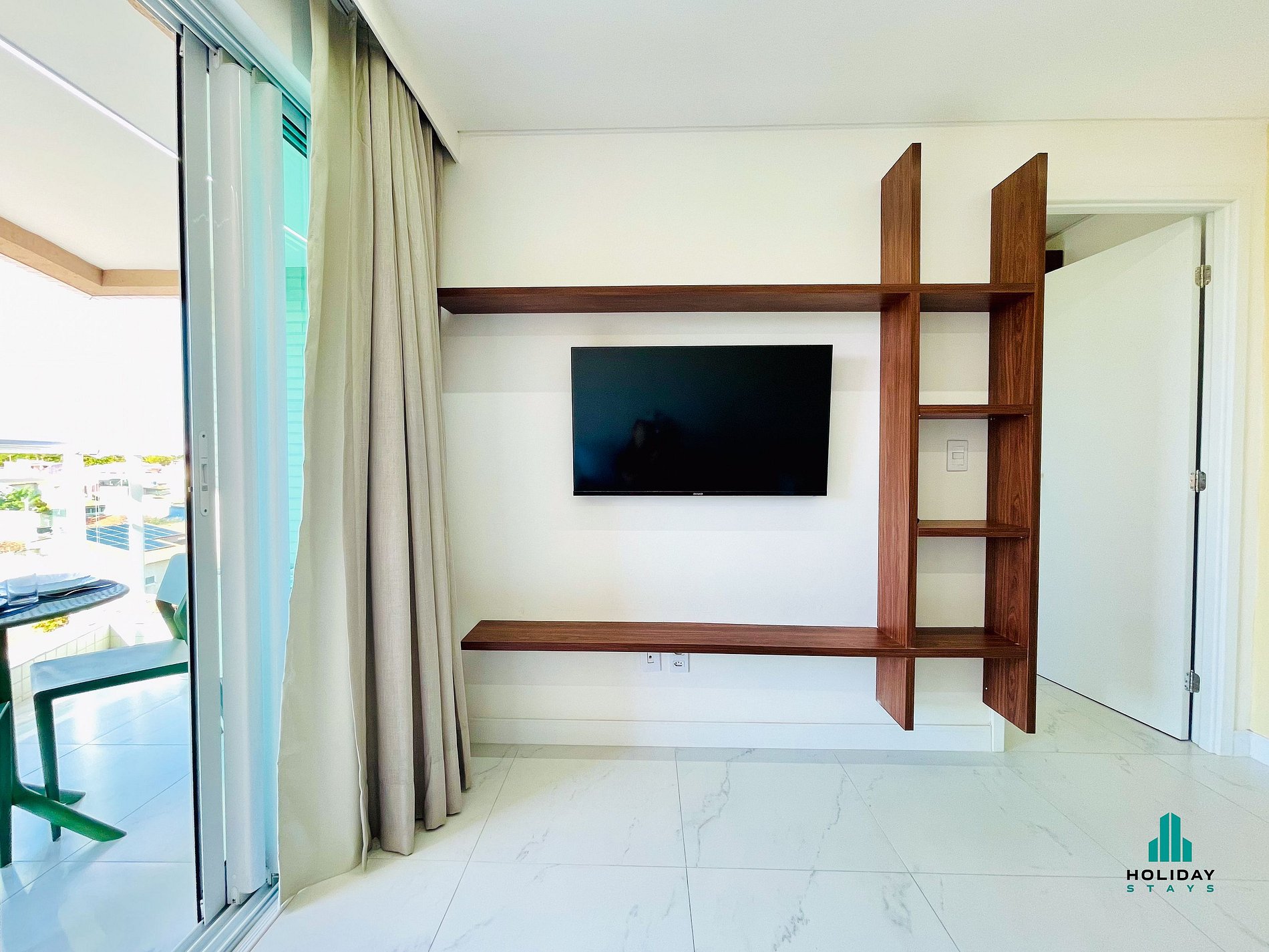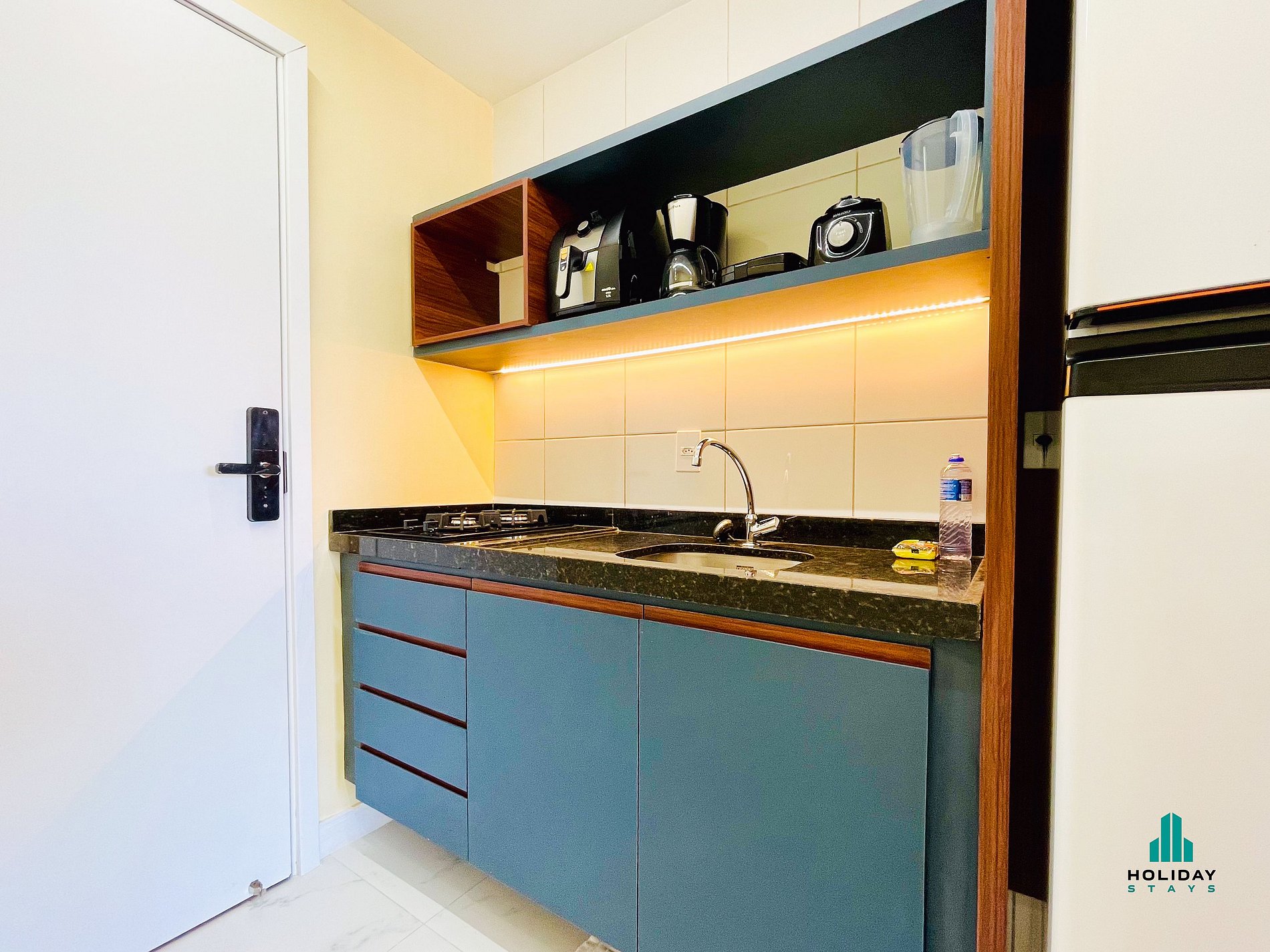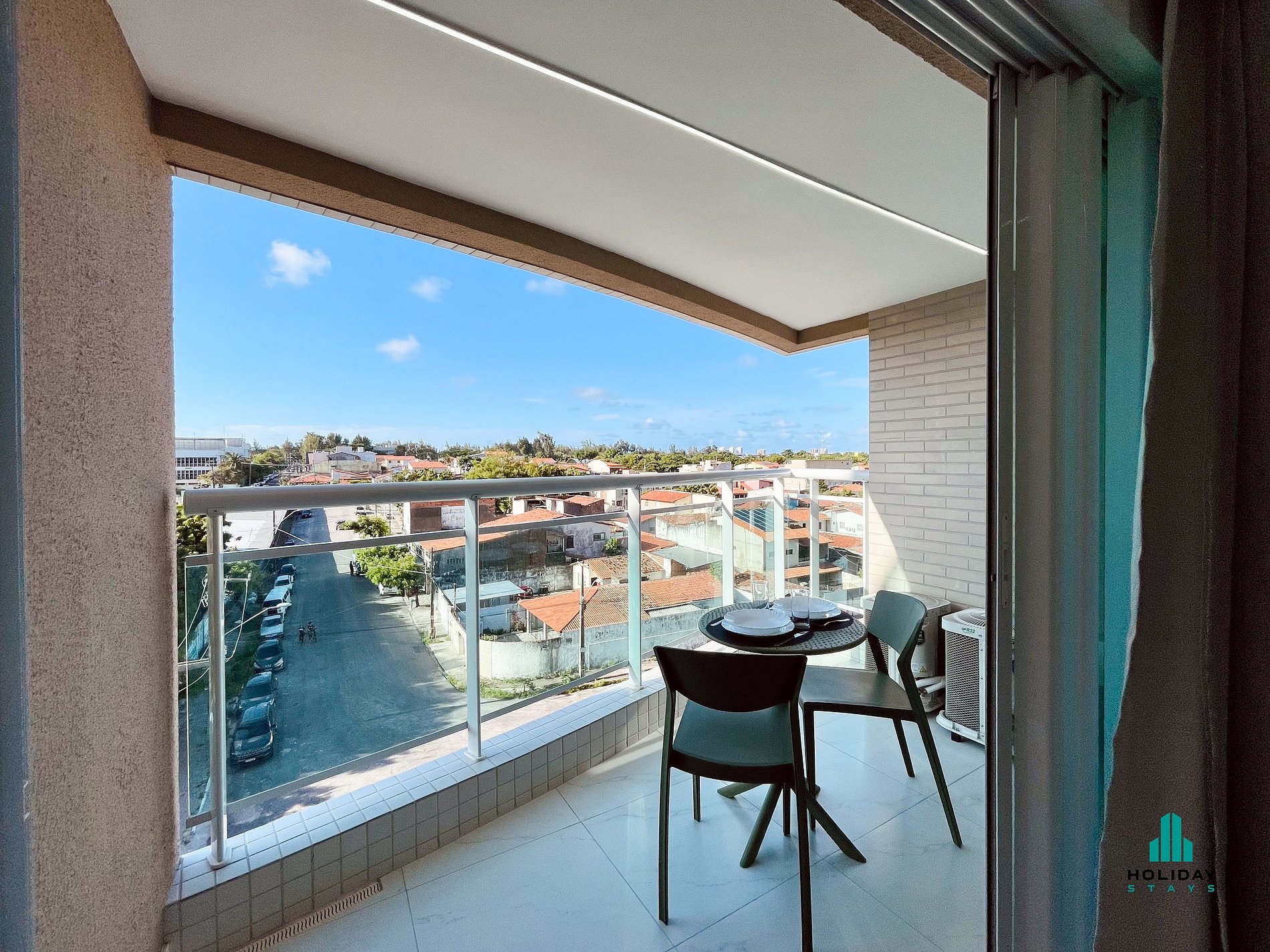 Apartamento moderno e funcional com sala, sofá e TV smart de 43 polegadas, varanda com mesa e cadeiras, cozinha completa equipada com geladeira, fogão duas bocas, airfryer, liquidificador, sanduicheira e cafeteira. Suíte com cama queen, TV de 43 polegadas, banheiro com chuveiro quente e secador de cabelo.