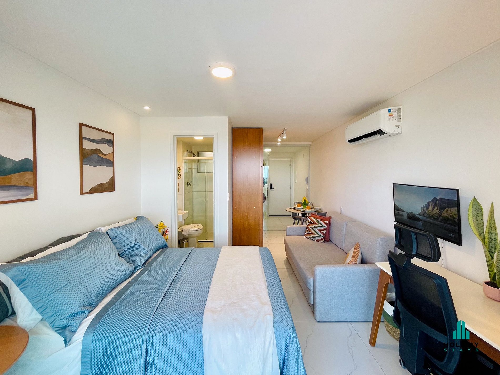 Estúdio moderno e bem equipado, com cozinha completa: fogão de 2 bocas, micro-ondas, airfryer, liquidificador, geladeira, máquina de lavar e utensílios. Área de estar e dormitório com mesa, cadeiras, sofá-cama, cama de casal, TV smart de 32 polegadas, mesa e cadeira para computador. Varanda com vista para rua tranquila.