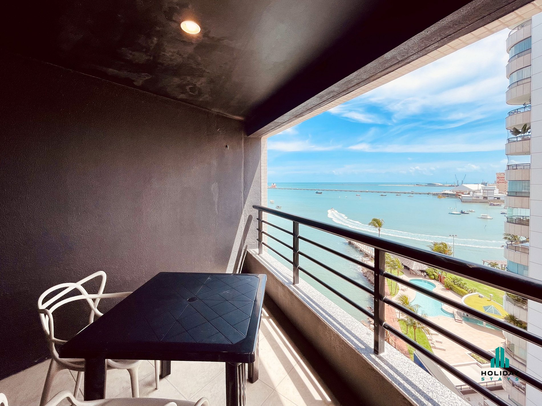 Varanda com vista incrível para o mar, equipada com mesa e cadeiras, ideal para relaxar e apreciar a paisagem.