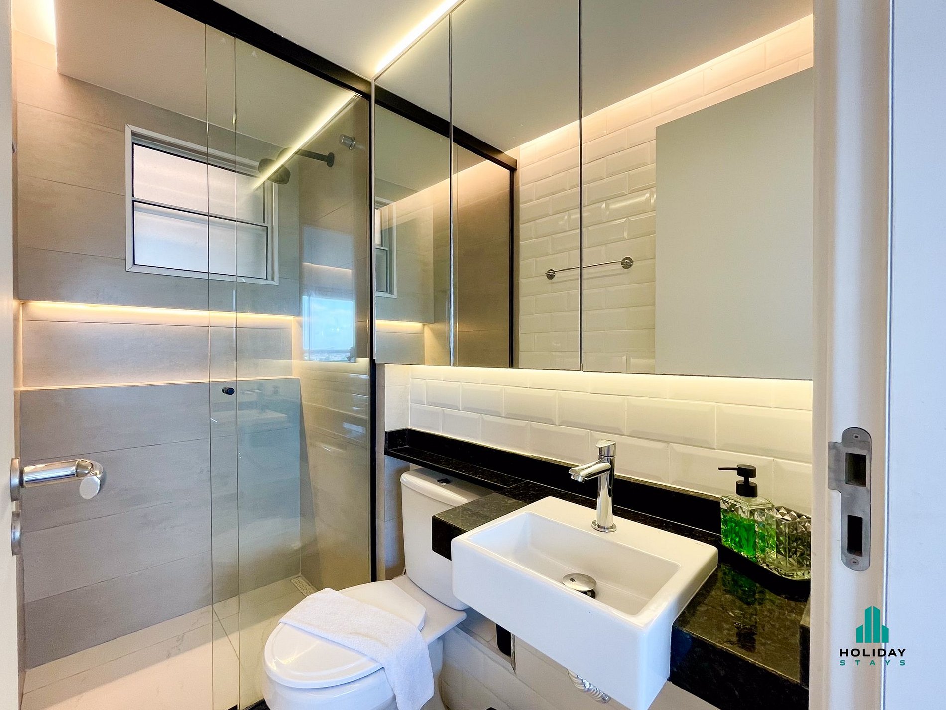 Banheiro Moderno: Equipado com chuveiro de água quente, toalhas macias e itens básicos para sua comodidade.