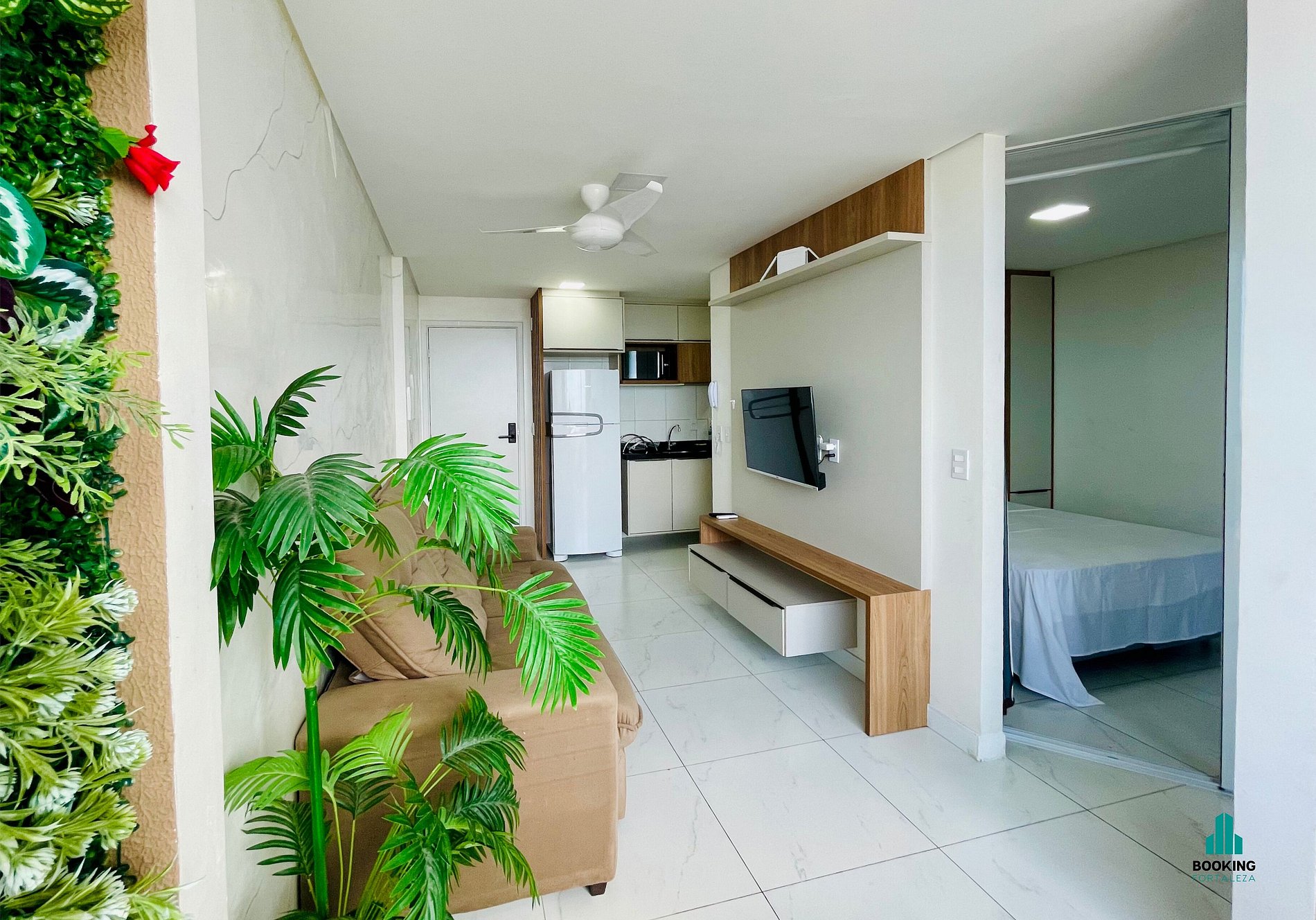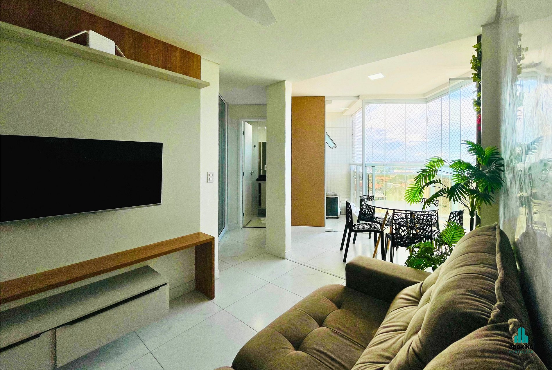 Sala de Estar: Ambiente integrado com sofá, TV e espaço para relaxar ou trabalhar.