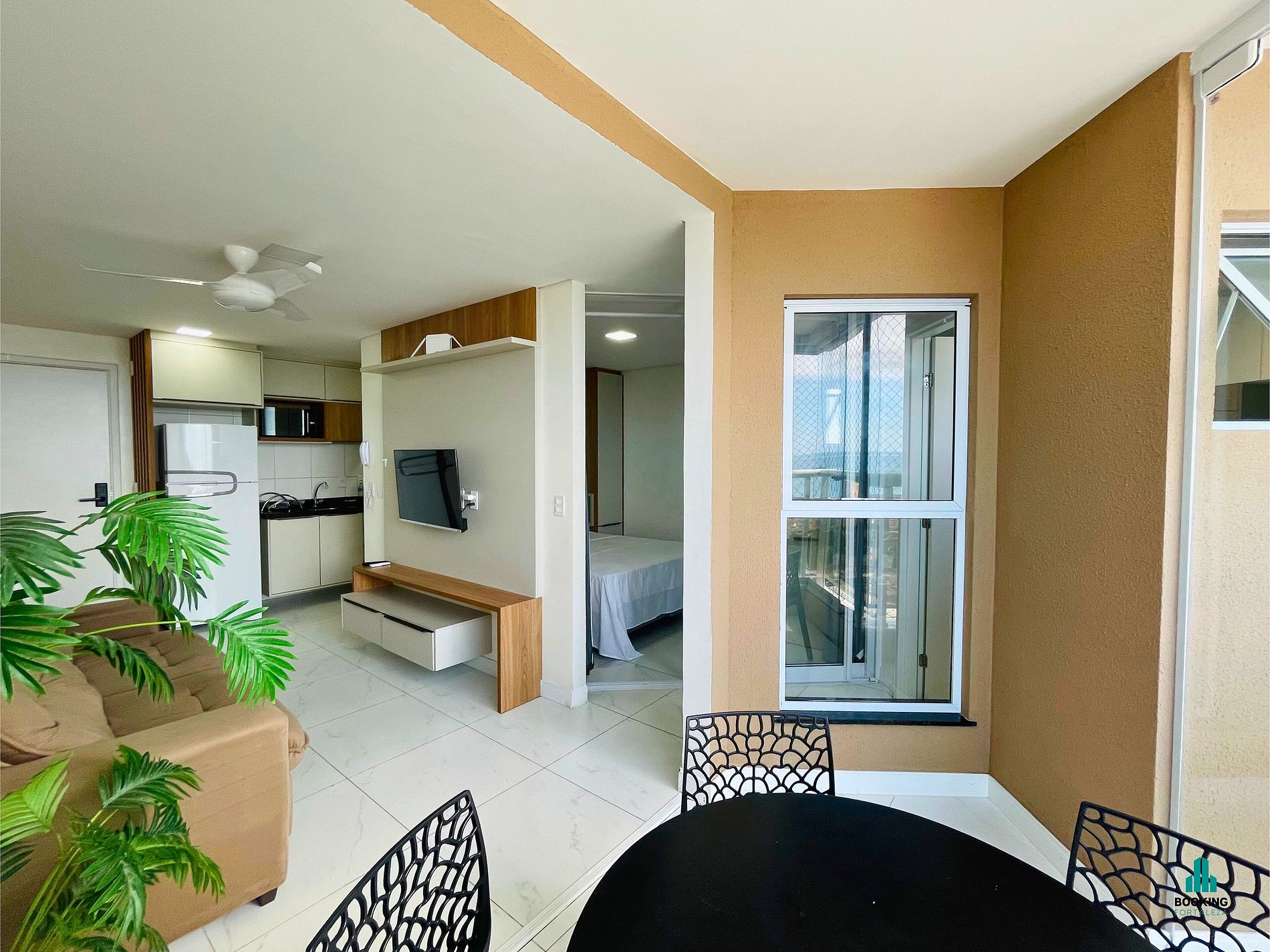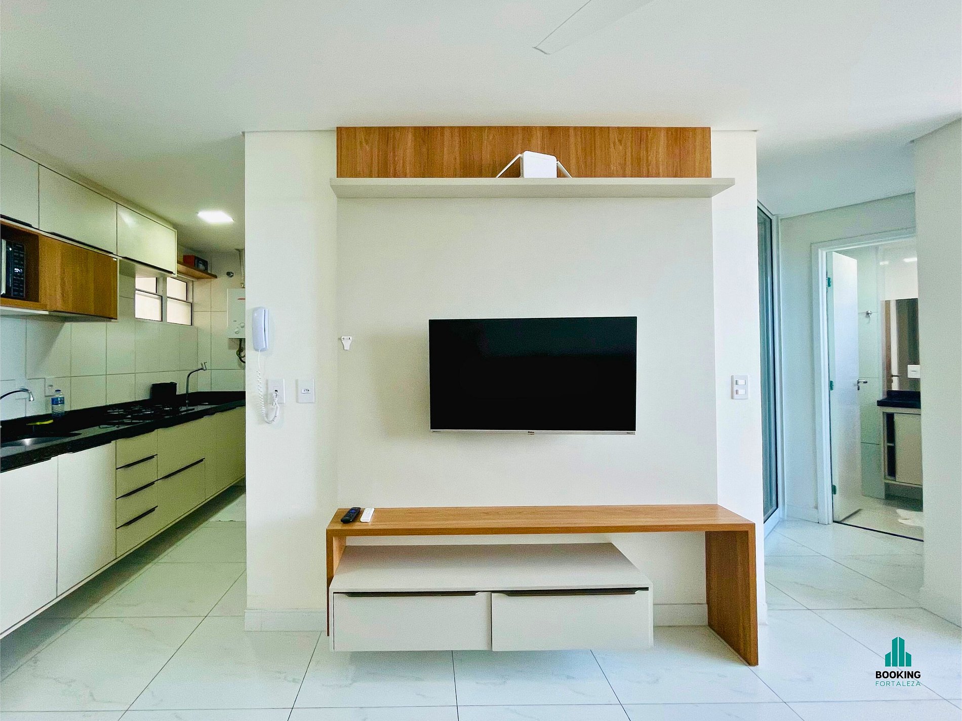 Sala de Estar: Ambiente integrado com sofá, TV e espaço para relaxar ou trabalhar.