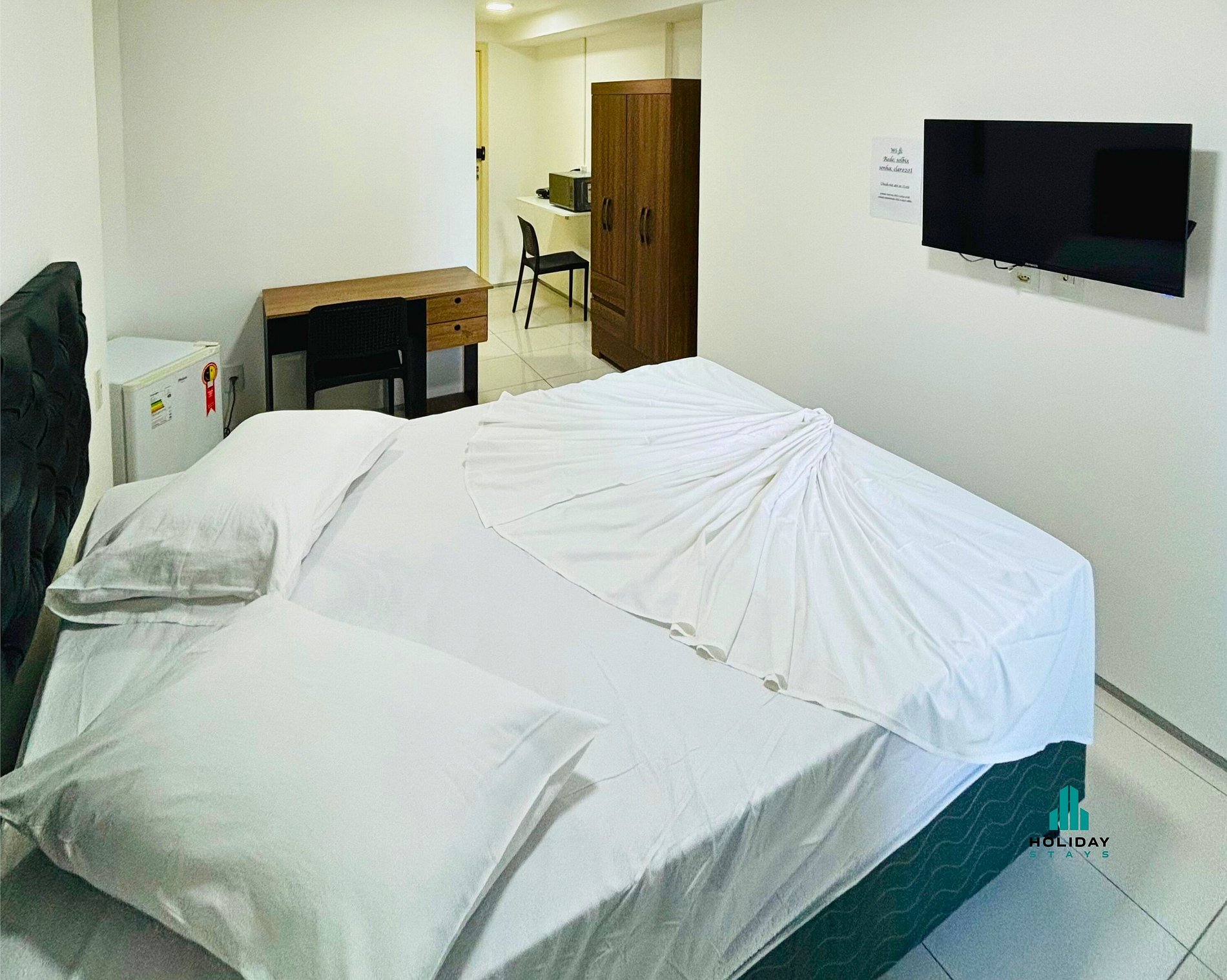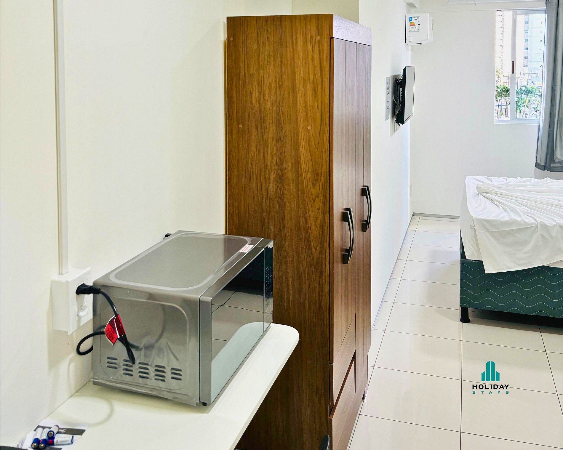 Suite em Meireles, quarto com ar condicionado, frigobar, microondas, internet wi-fi e banheiro. Possui área de trabalho e smart TV. Por favor note: essa acomodação não possui cozinha.