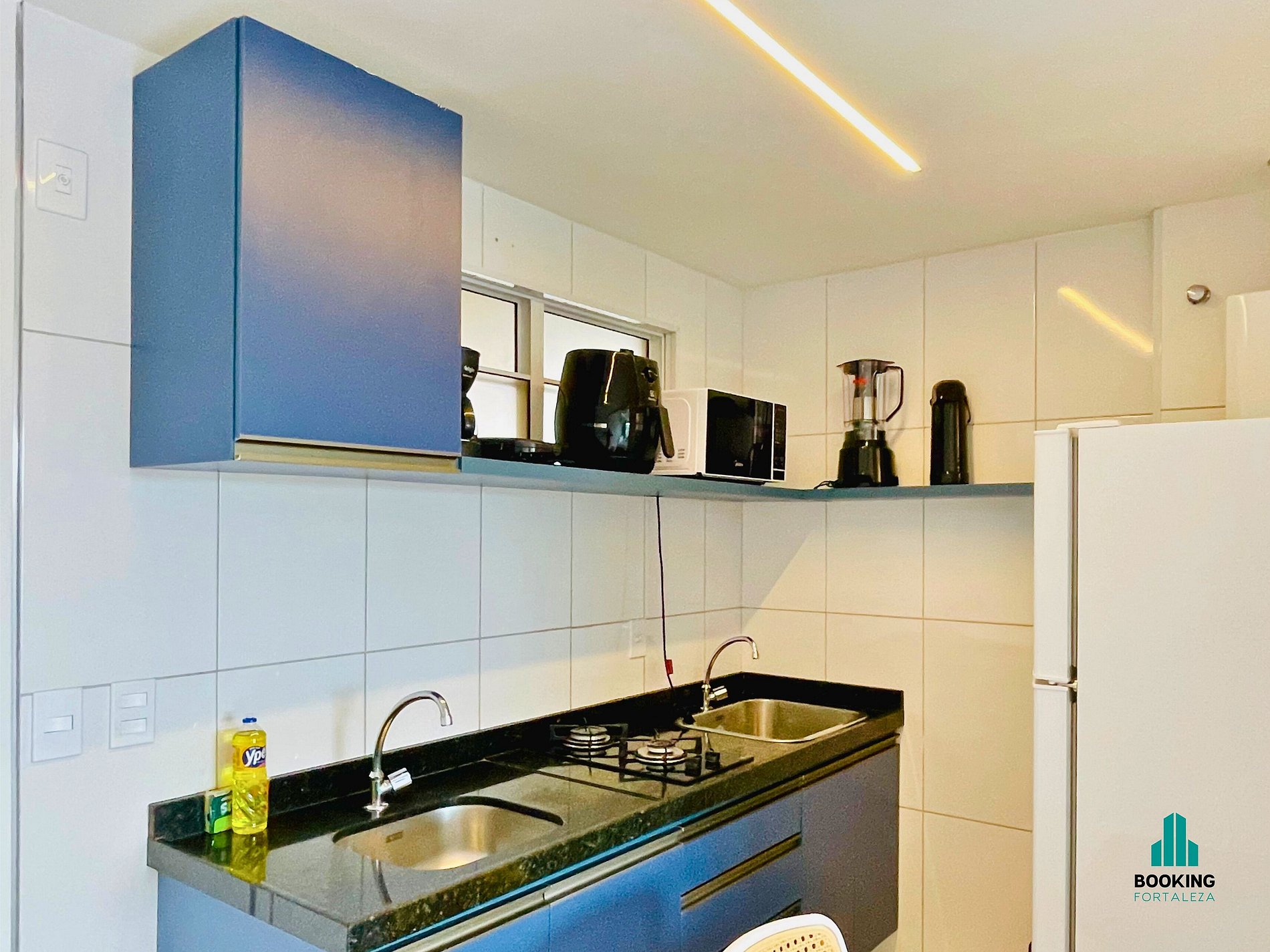 Cozinha equipada com utensílios, fogão, geladeira e micro-ondas