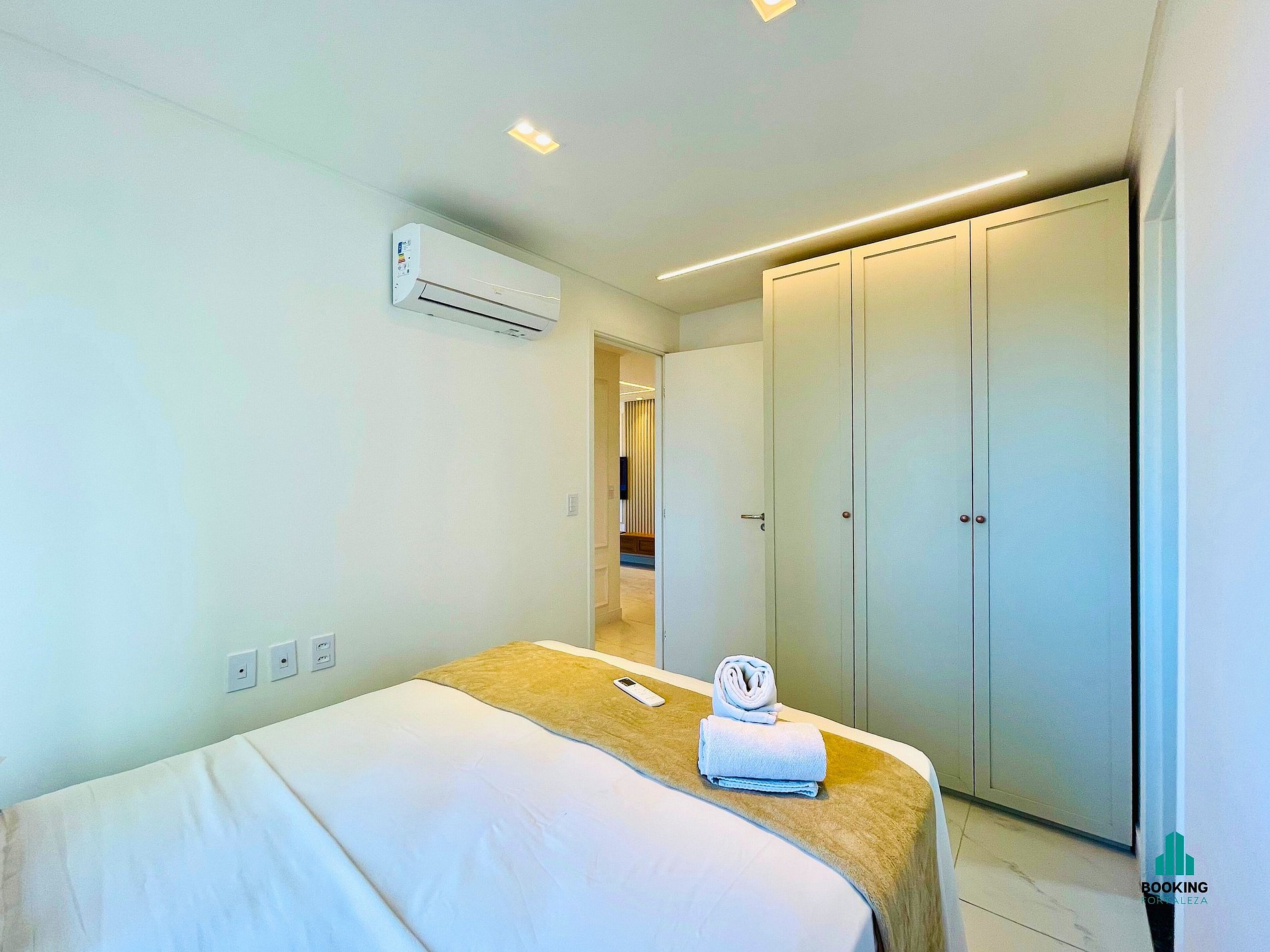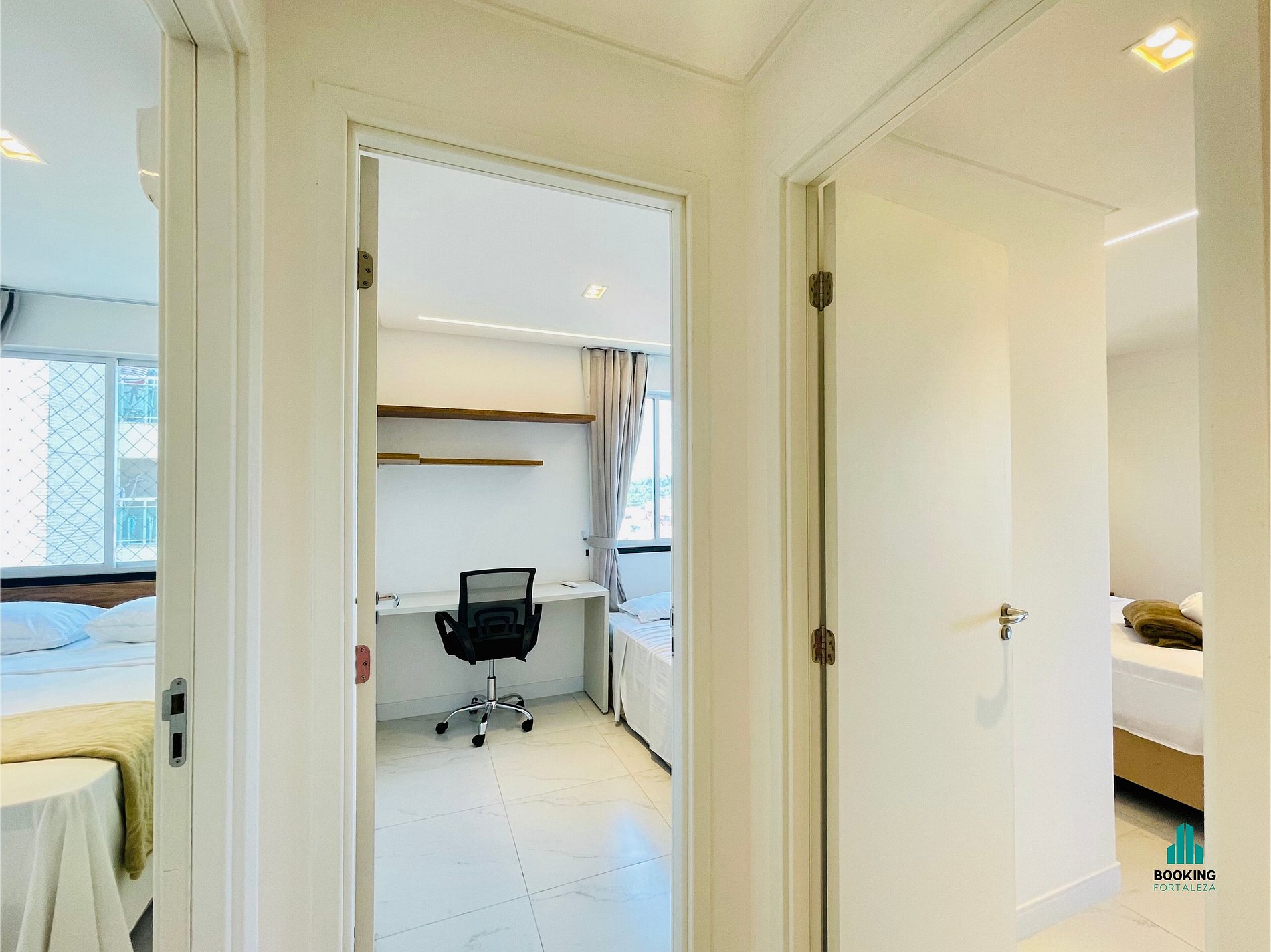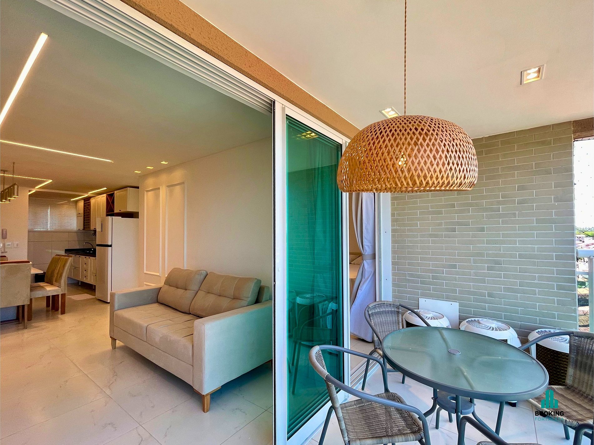 Apartamento refinado com 3 quartos, ideal para hóspedes exigentes. Cozinha ampla e totalmente equipada, sala com sofá e TV, mesa de jantar e varanda com mesa e cadeiras. Duas suítes com cama de casal, ar-condicionado e banheiros com água quente. Terceiro quarto com bicama, mesa e cadeira para home office, também com ar-condicionado. Wi-Fi e roupa de cama e banho incluídas. Ideal para lazer ou trabalho.