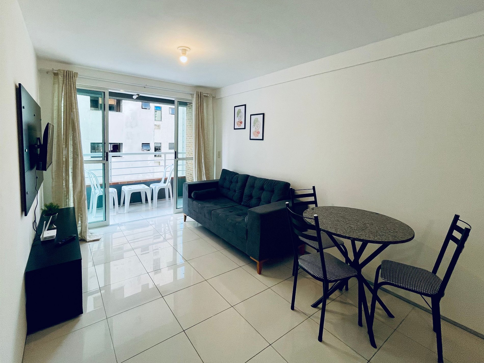 Sala com sofá, TV e mesa de jantar