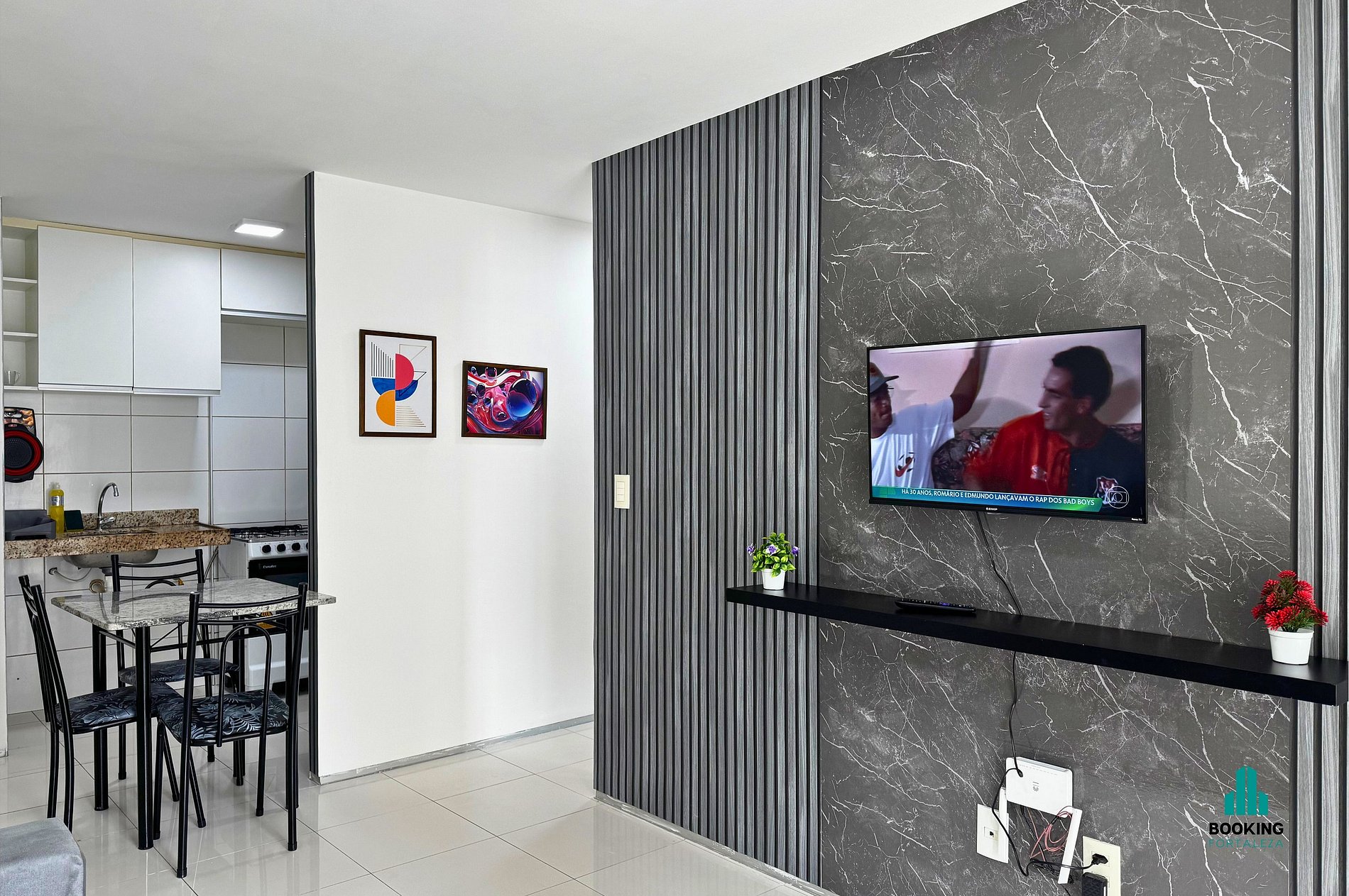 Sala com sofá, TV smart e mesa de jantar