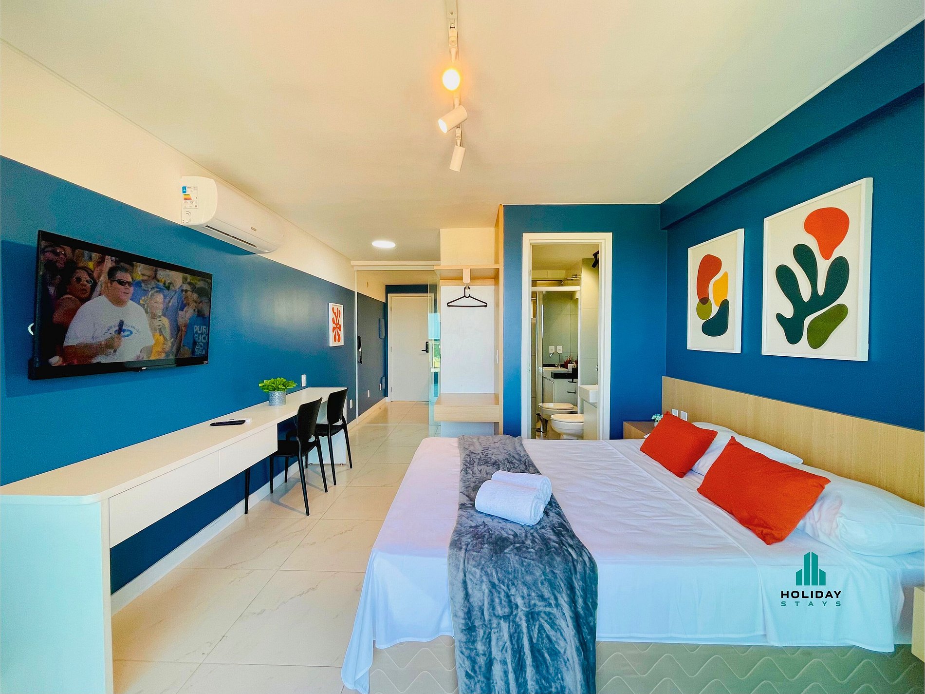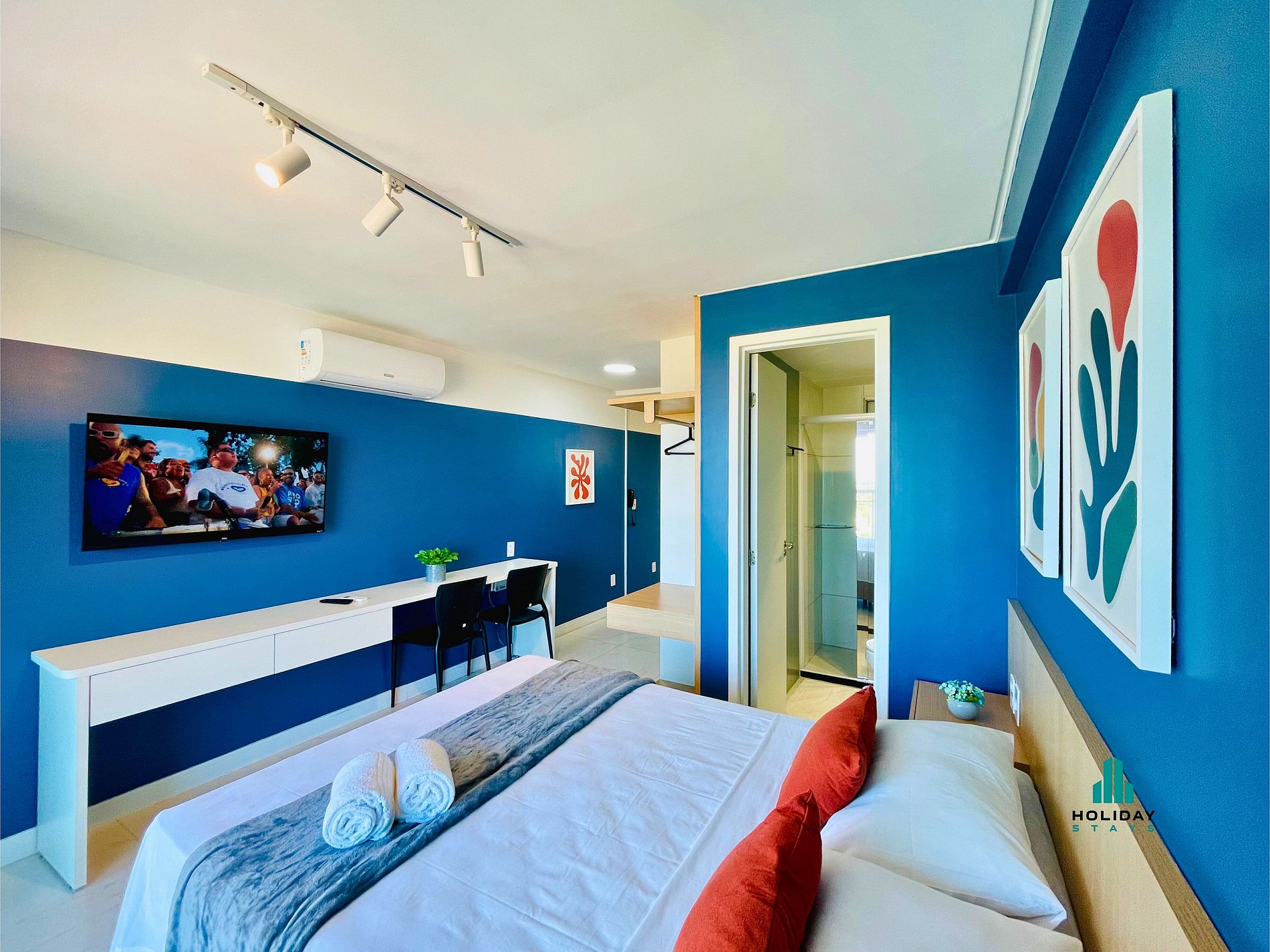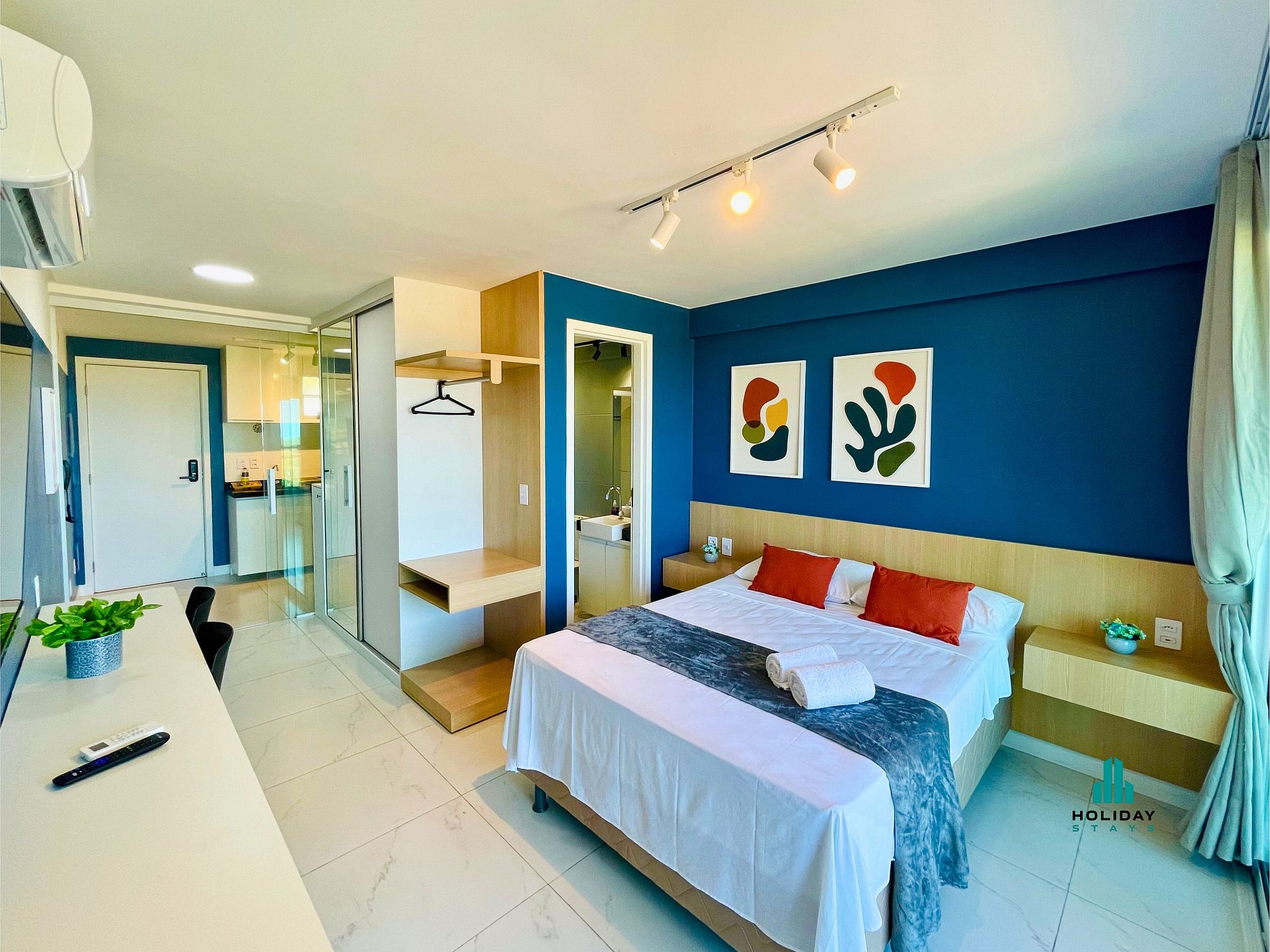 Encantador flat de 1 quarto, moderno e acolhedor, perfeito para estadias de lazer ou trabalho. Conta com cama de casal confortável, TV e mesa de trabalho. A cozinha completa garante praticidade no dia a dia, enquanto o ar-condicionado e a internet Wi-Fi trazem todo o conforto.