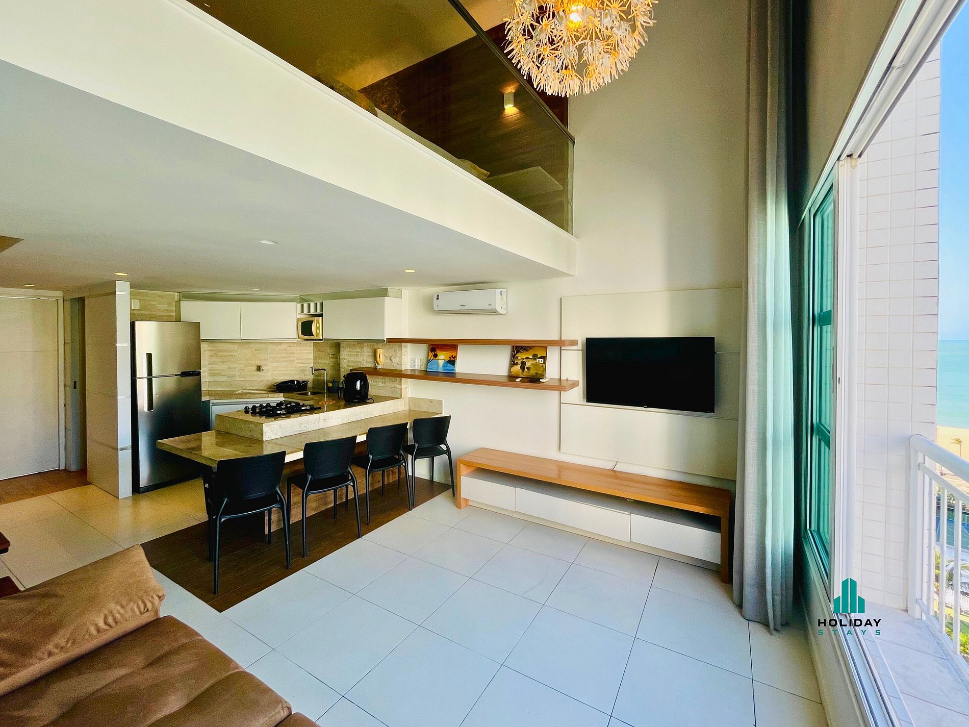 Sala ampla e moderna, integrada à cozinha, equipada com TV e vista deslumbrante para o mar